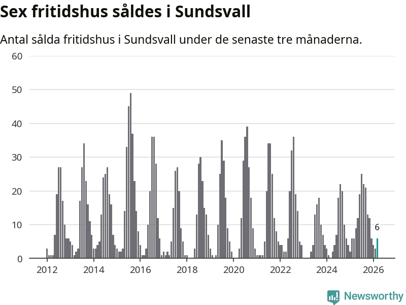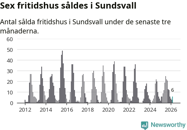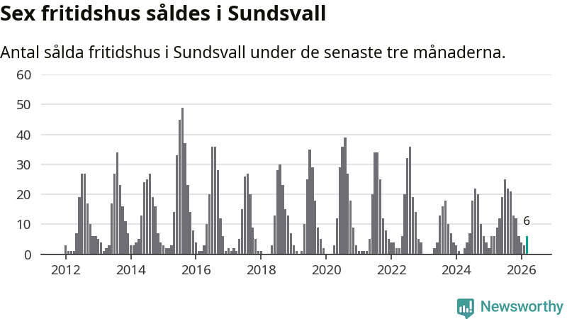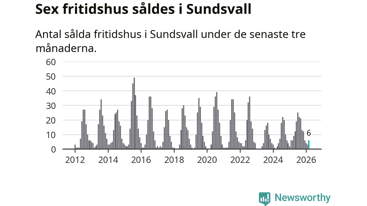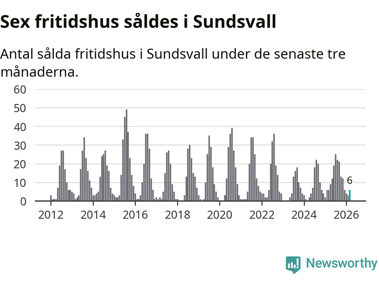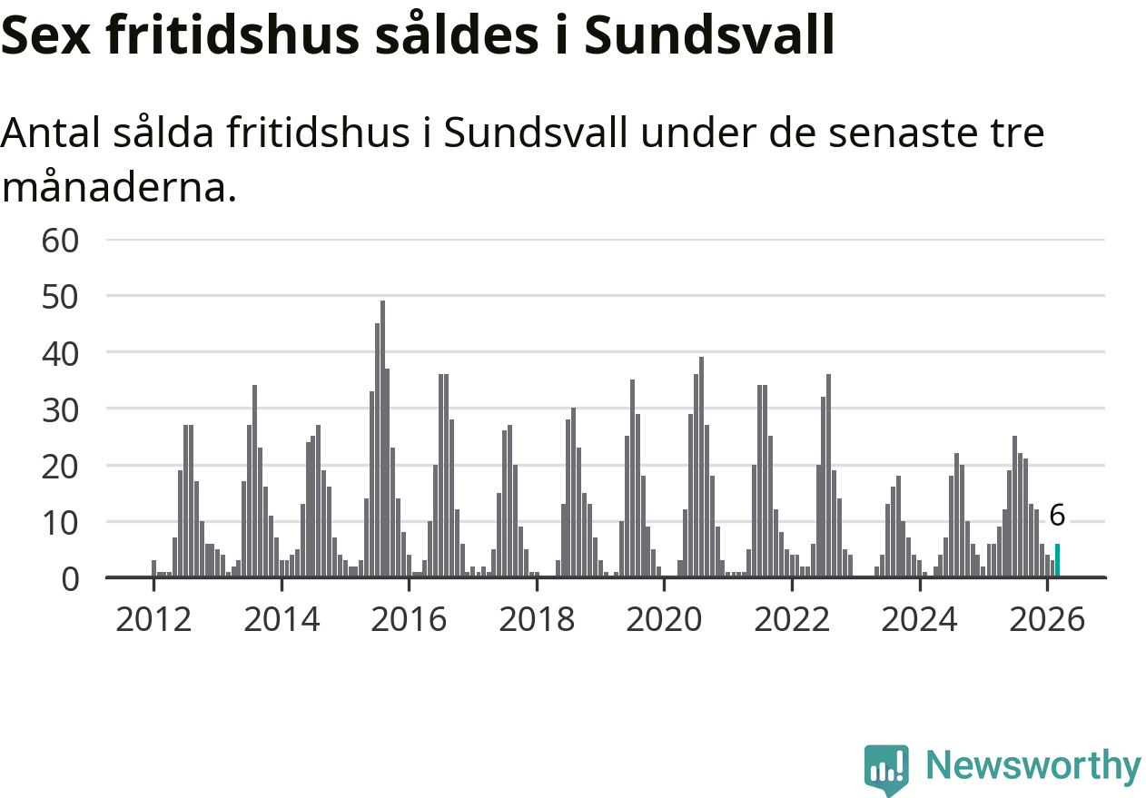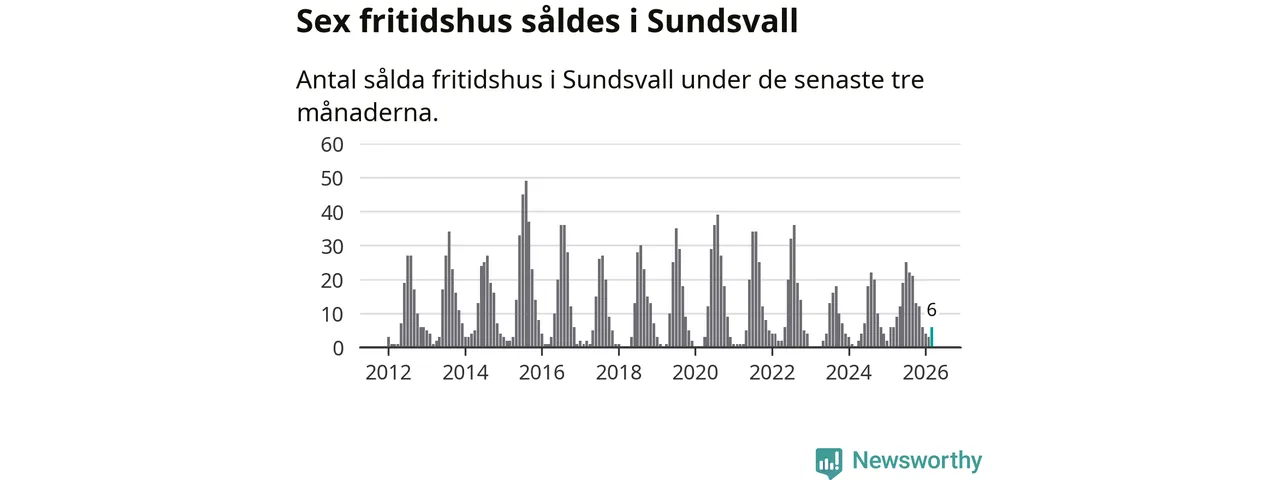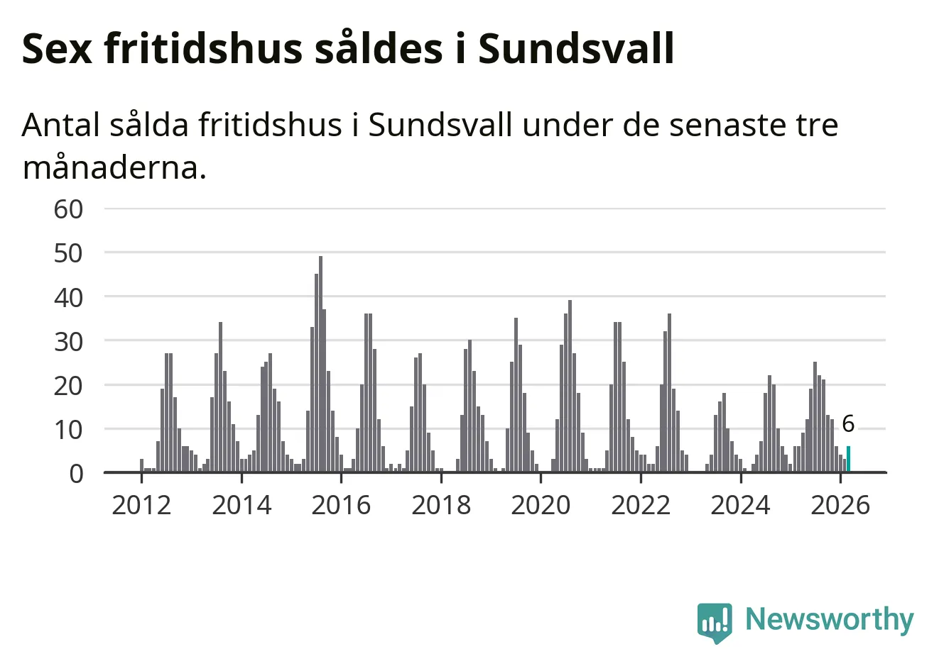 Sammanlagt såldes sex fritidshus i Sundsvalls kommun mellan januari och mars till ett genomsnittligt pris på 1,8 miljoner kronor. I fjol gjordes sex affärer vid den här tiden på året.