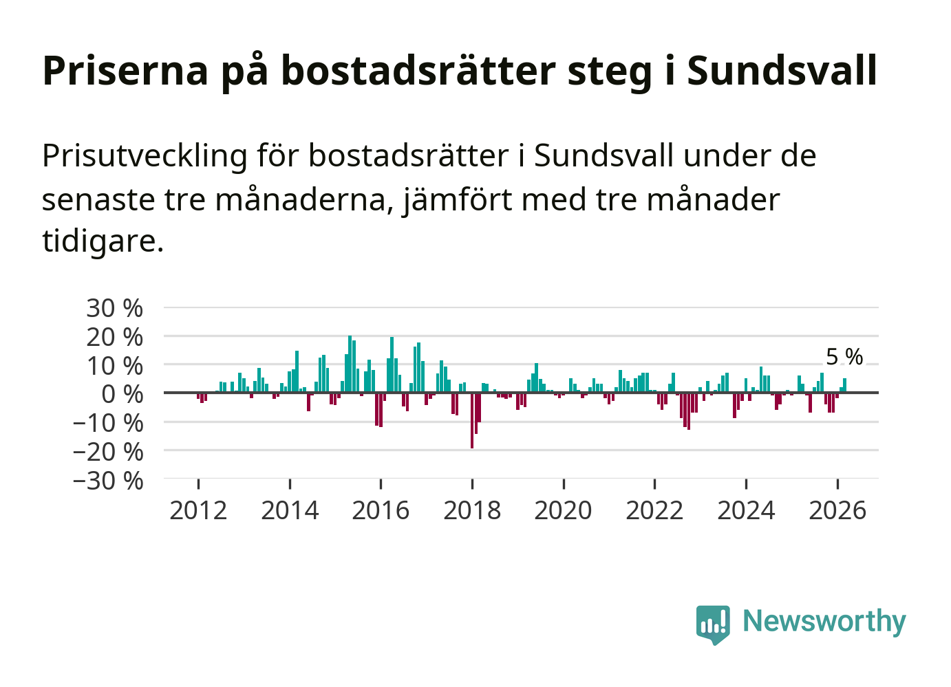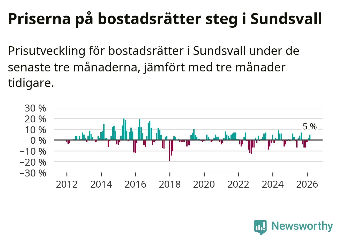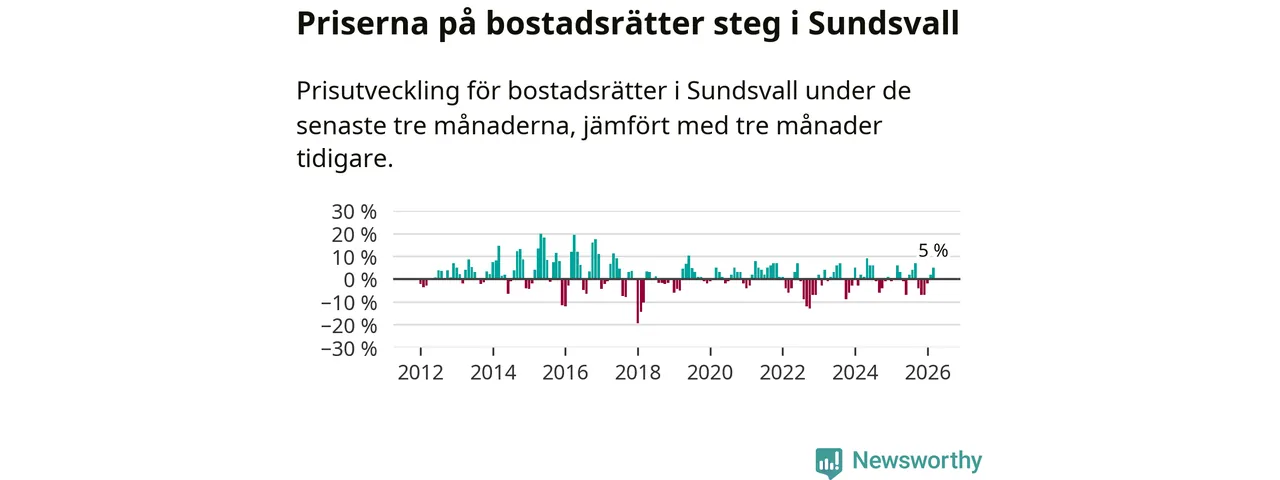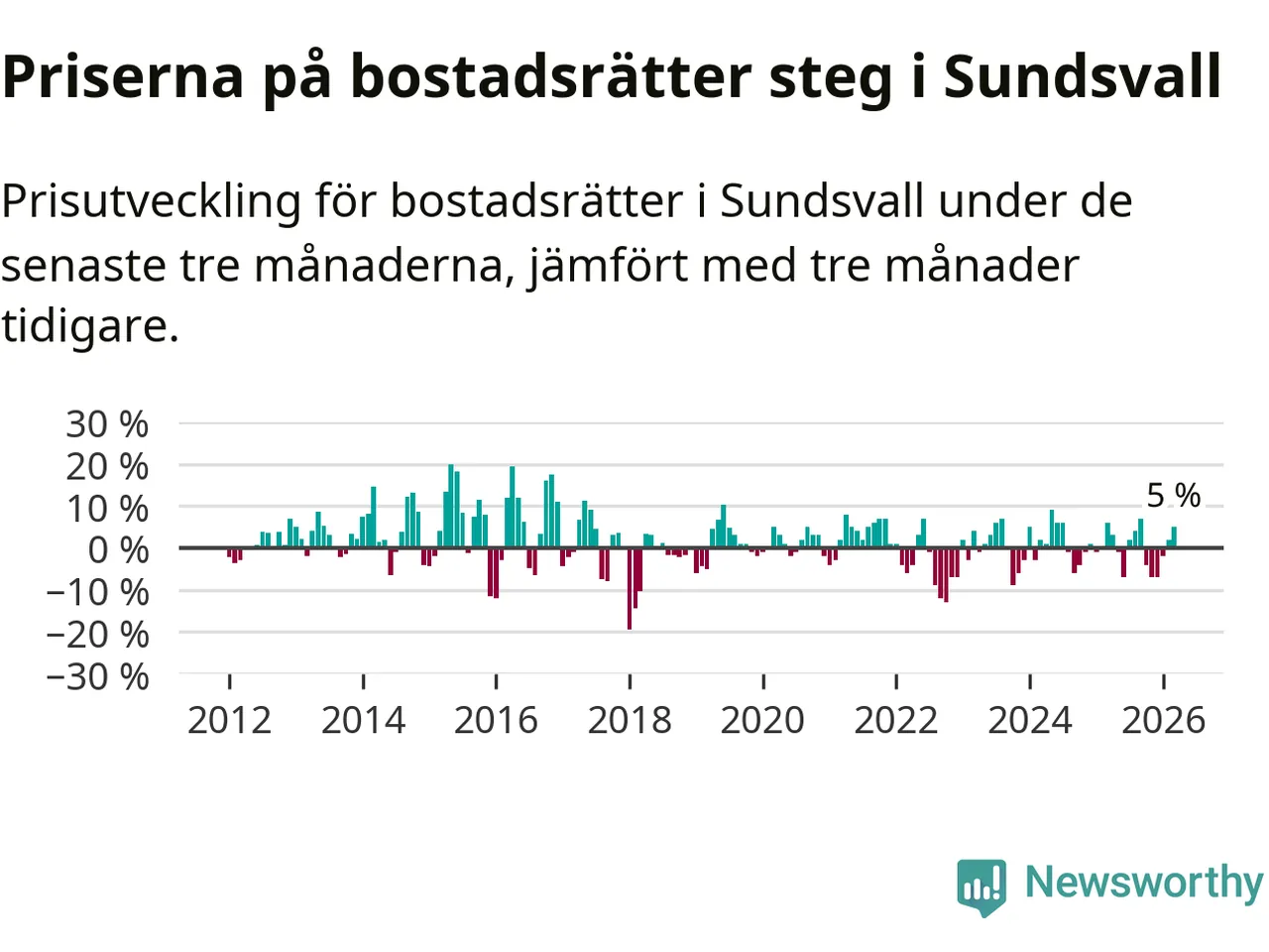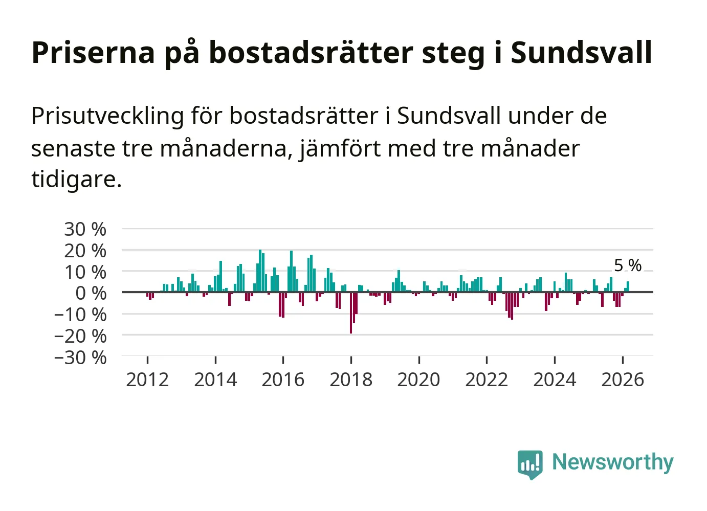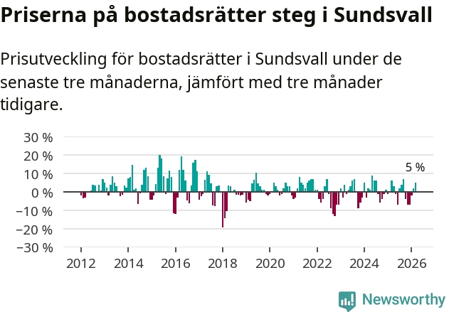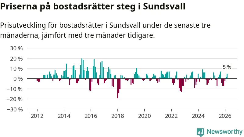 Priserna på bostadsrätter har gått upp i Sundsvalls kommun. Medelpriset på försäljningarna under de senaste tre månaderna visar på en uppgång med 5 procent.