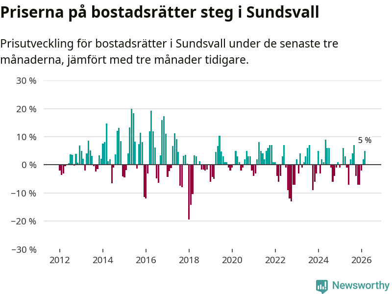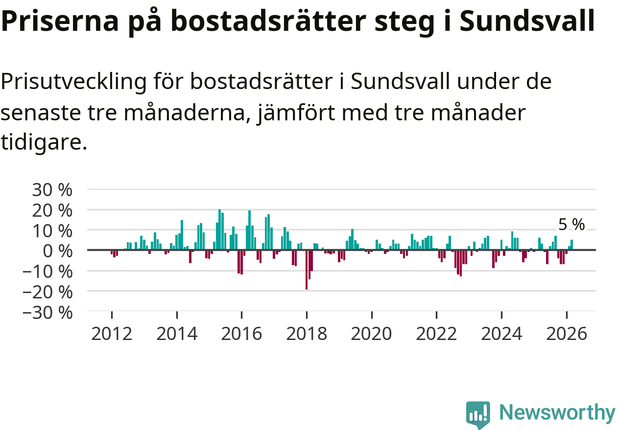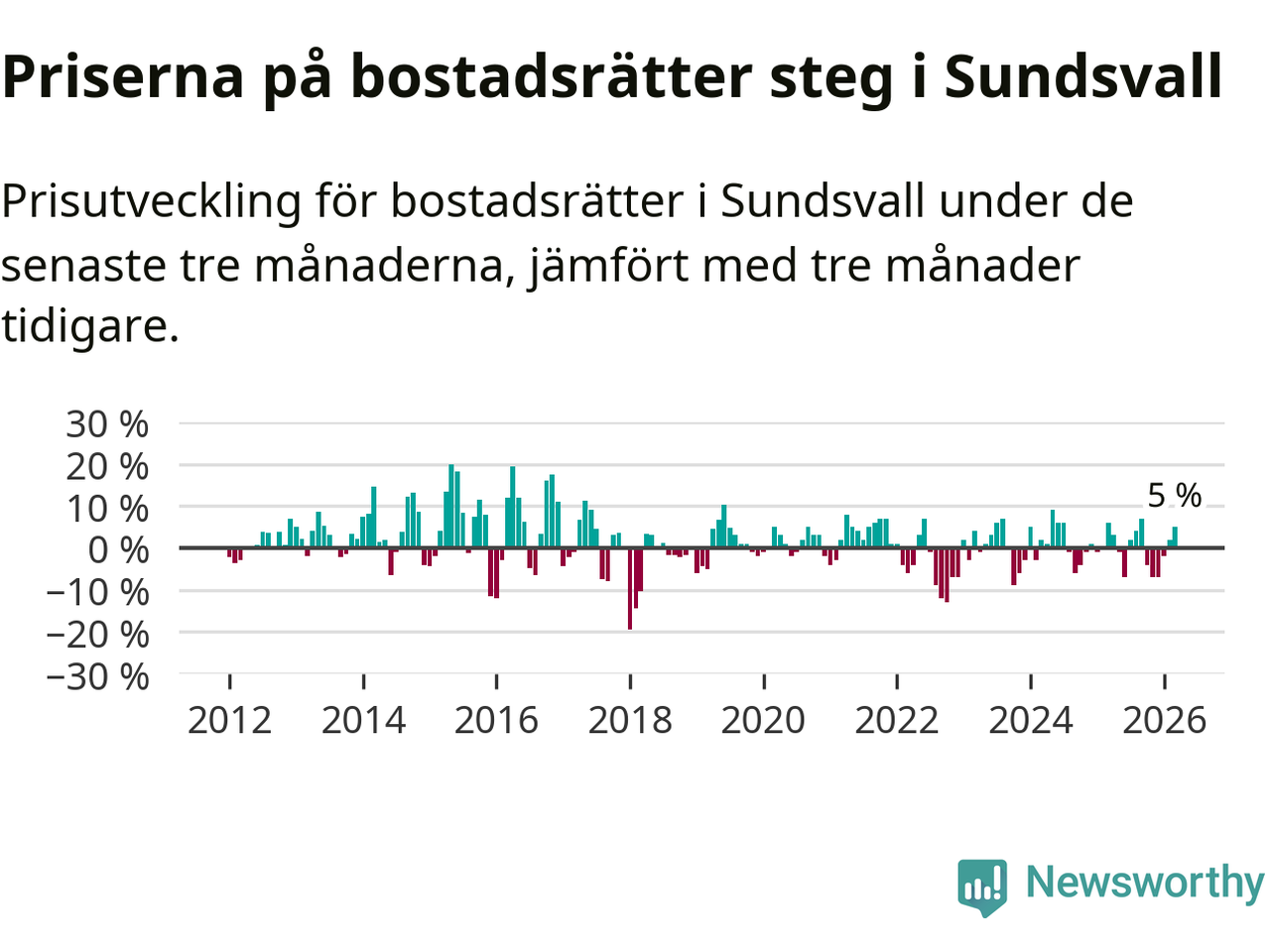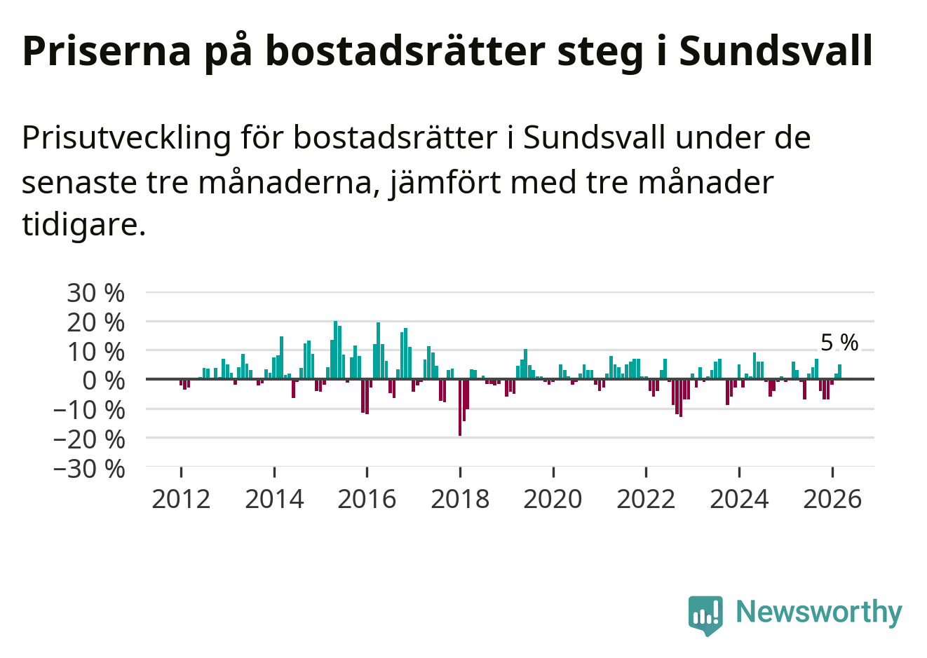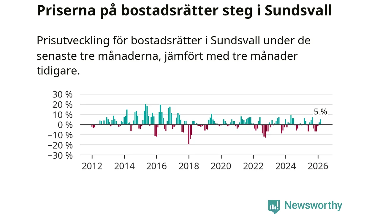 Priserna på bostadsrätter har gått upp i Sundsvalls kommun. Medelpriset på försäljningarna under de senaste tre månaderna visar på en uppgång med 5 procent.