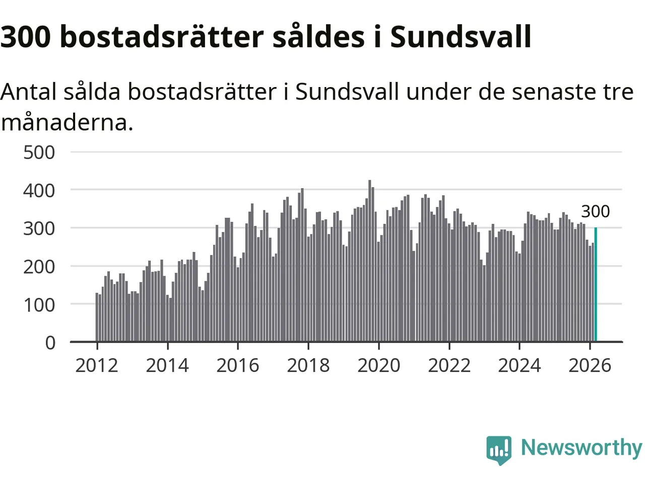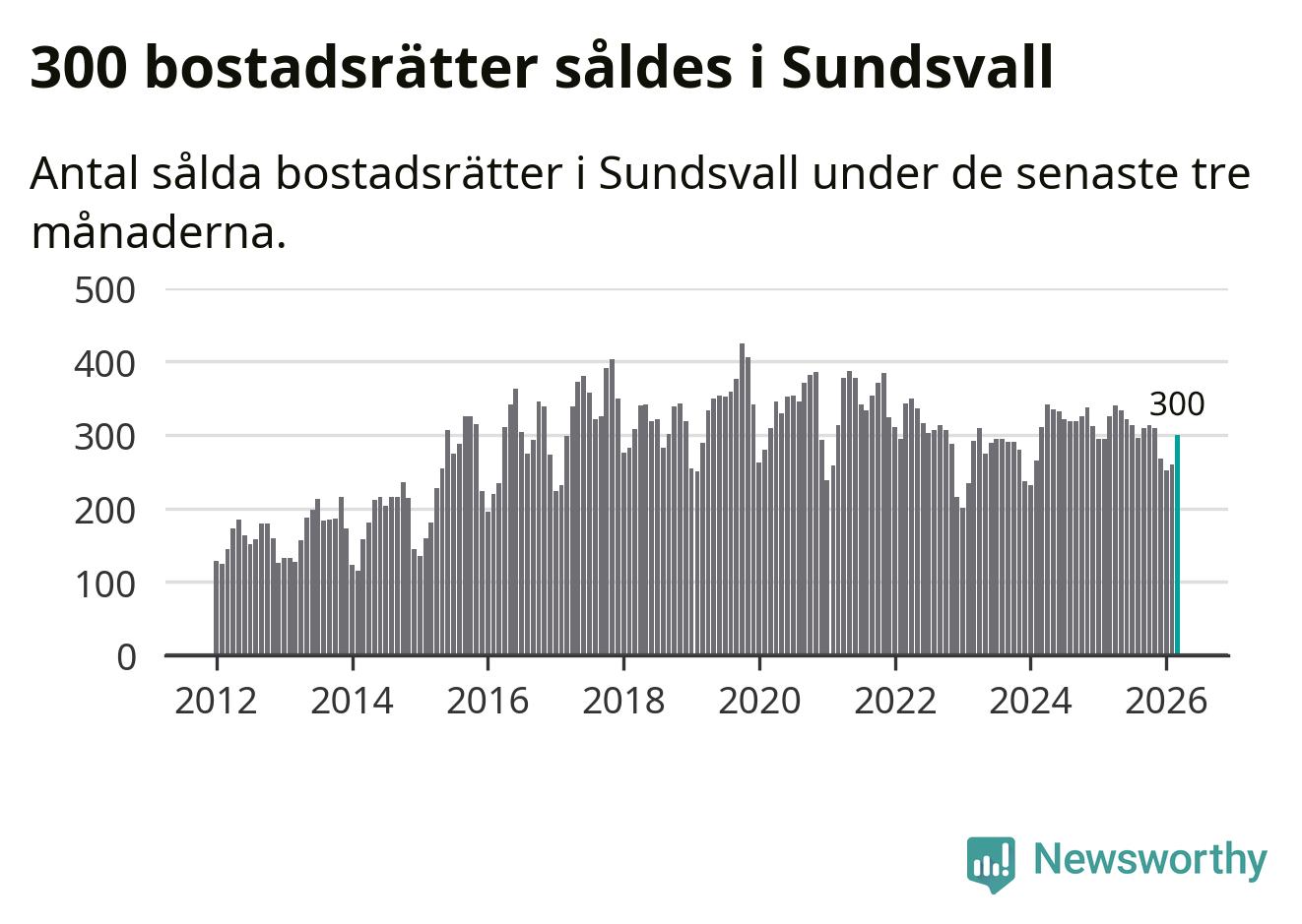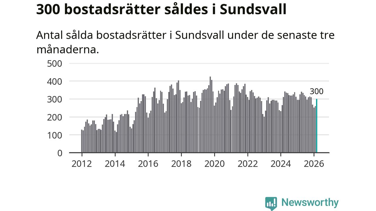 Sammanlagt såldes 300 bostadsrätter i Sundsvalls kommun mellan januari och mars till ett genomsnittligt pris på 1,2 miljoner kronor. I fjol gjordes 326 affärer vid den här tiden på året.