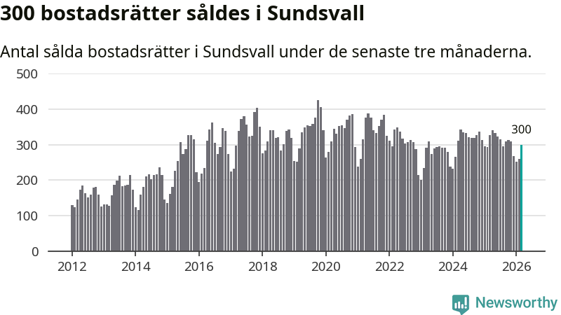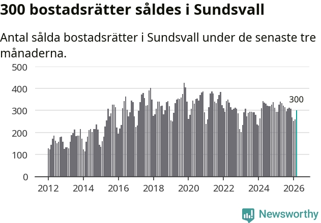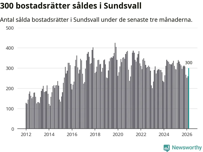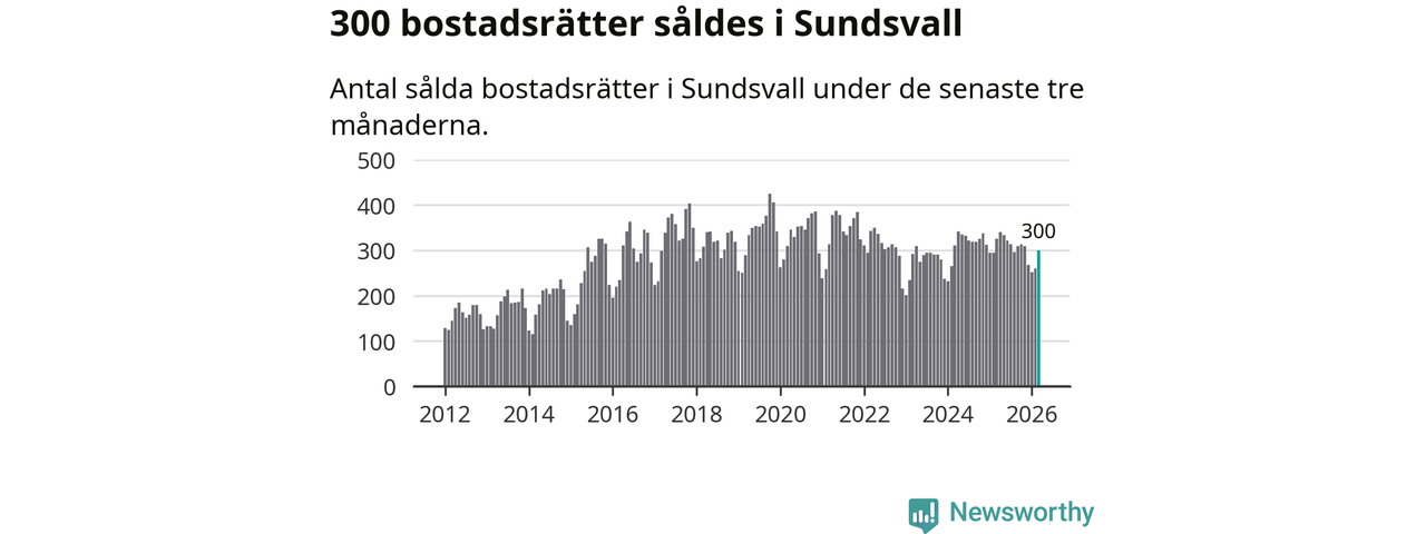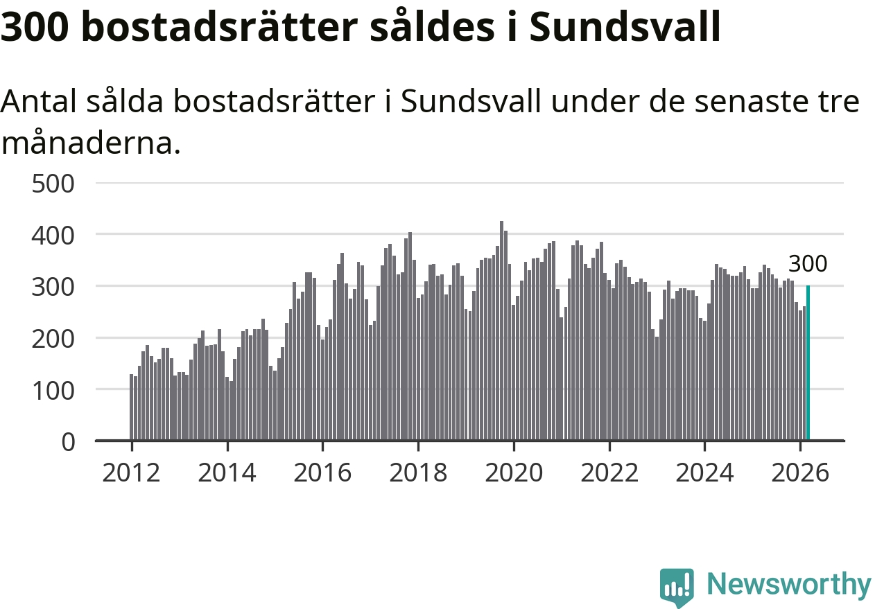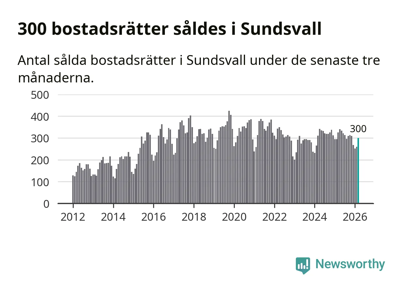 Sammanlagt såldes 300 bostadsrätter i Sundsvalls kommun mellan januari och mars till ett genomsnittligt pris på 1,2 miljoner kronor. I fjol gjordes 326 affärer vid den här tiden på året.
