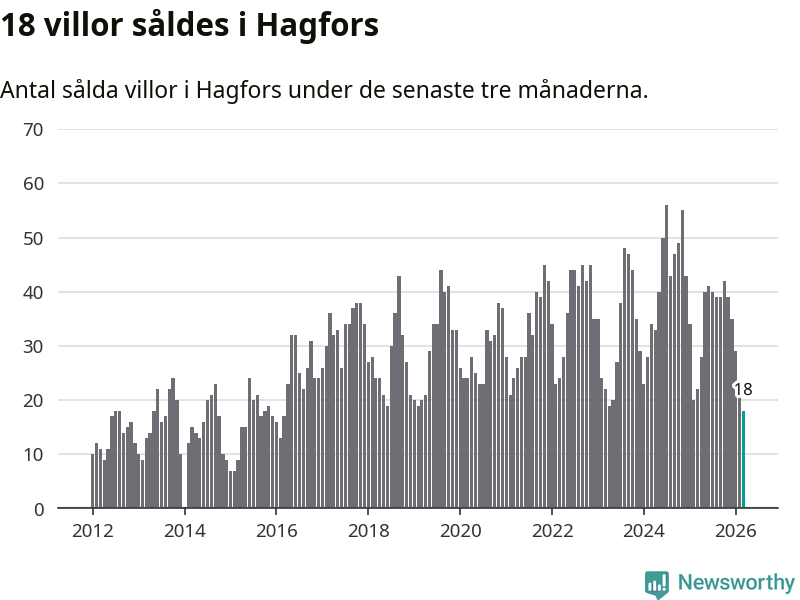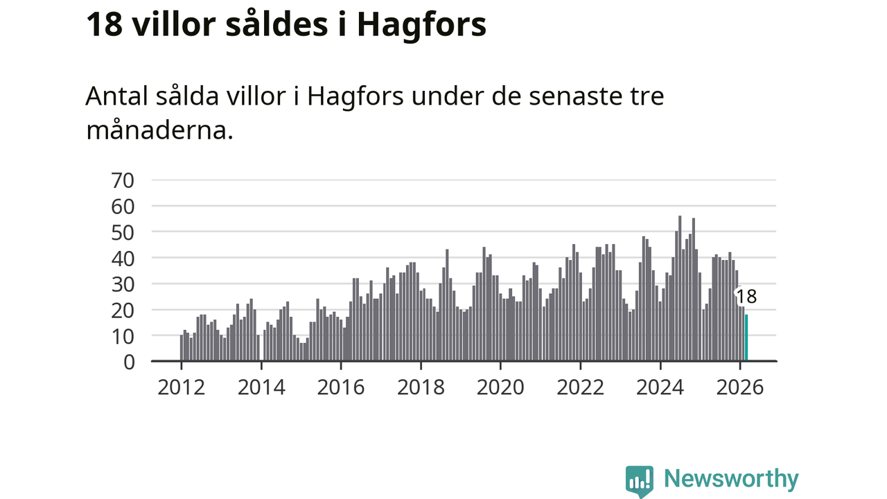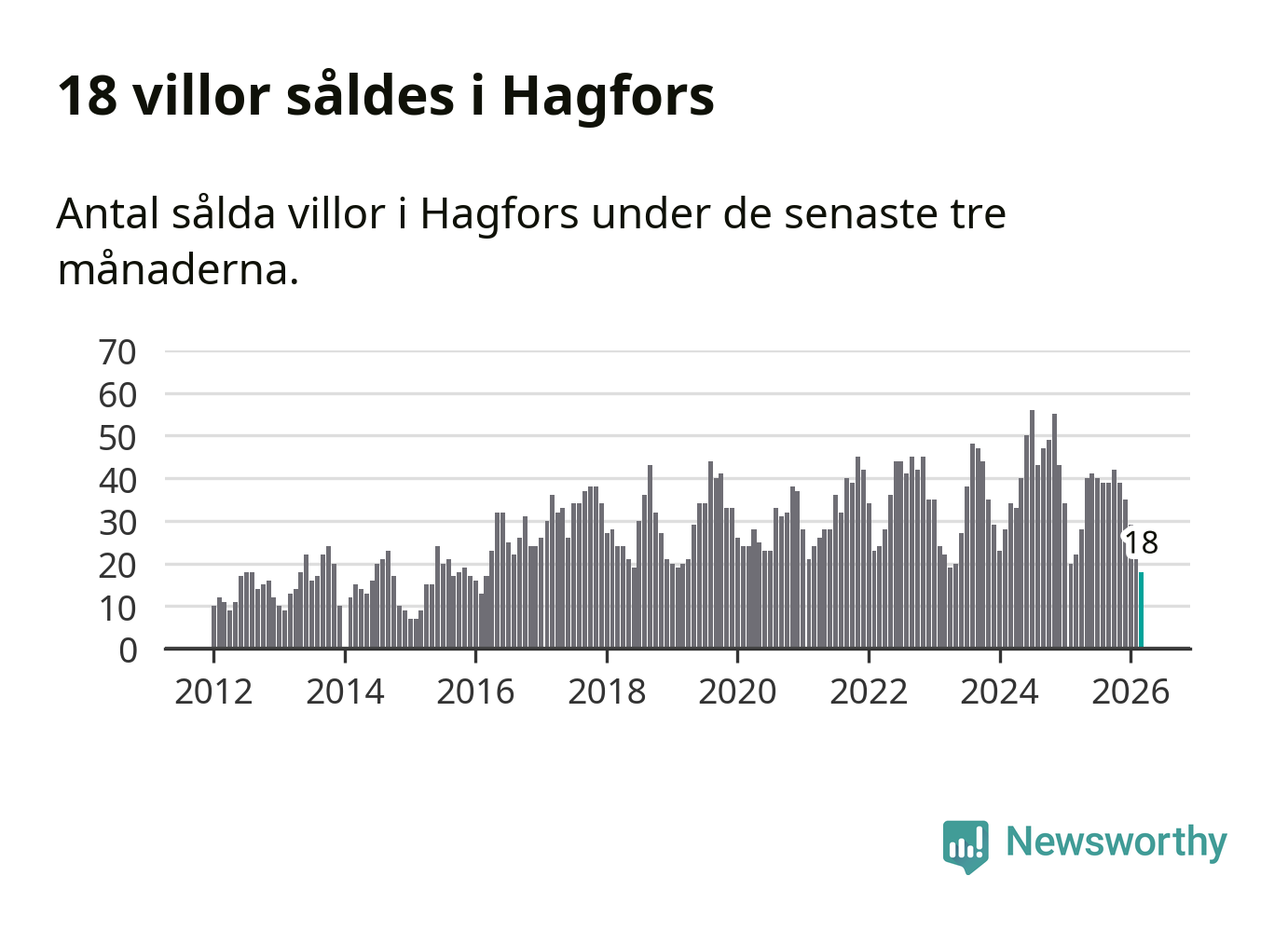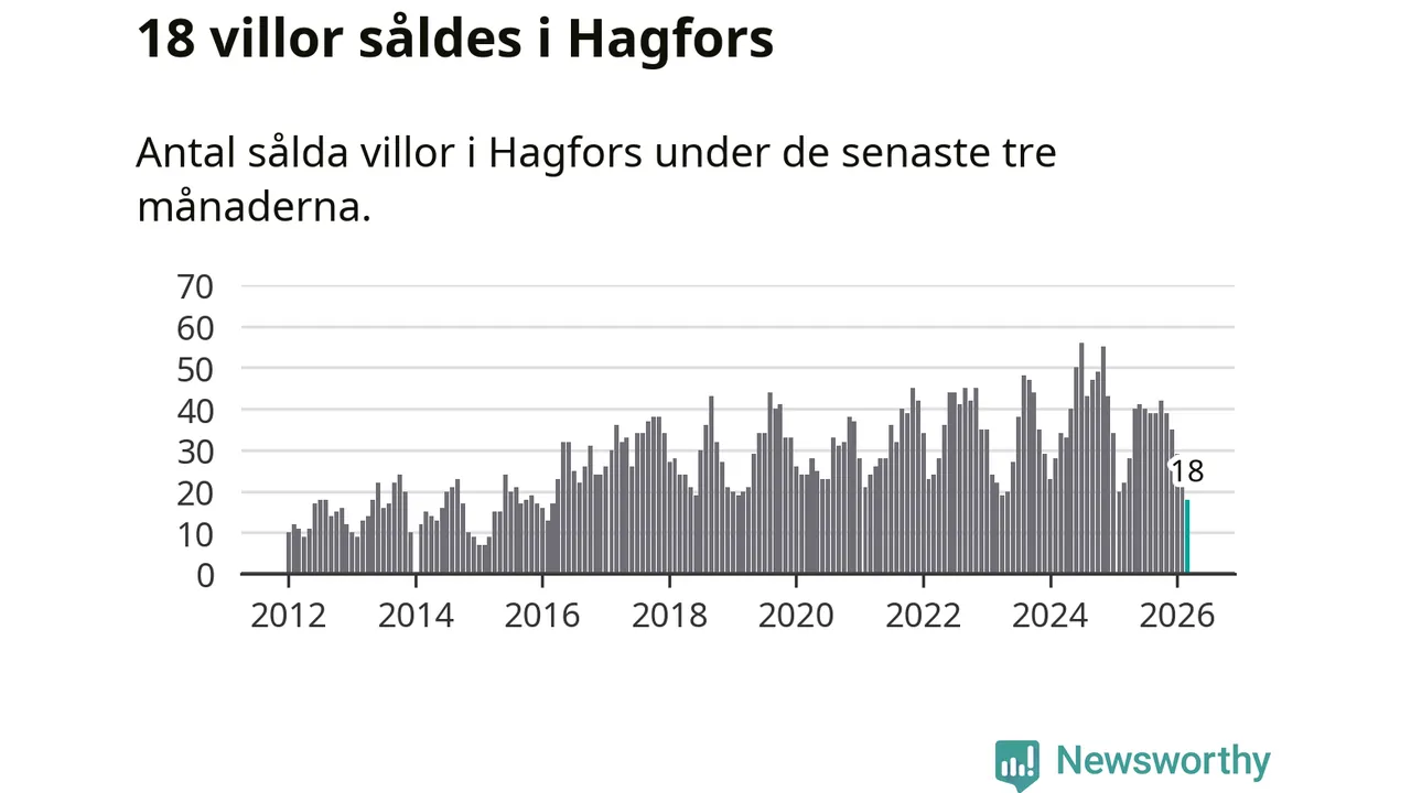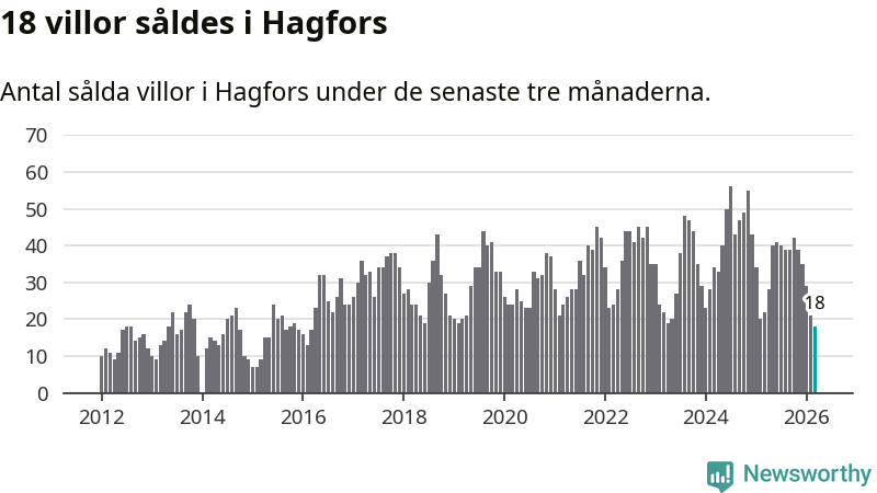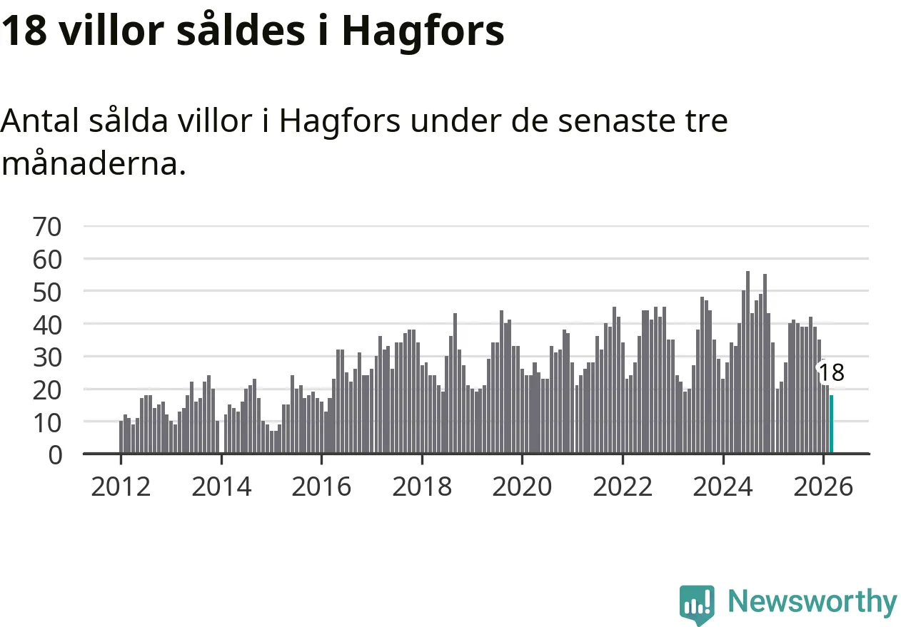 Mellan januari och mars gjordes sammanlagt 18 affärer med villor i Hagfors kommun. Det kan jämföras med 22 vid motsvarande tid i fjol.