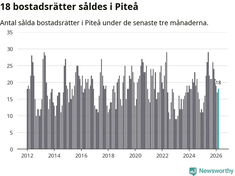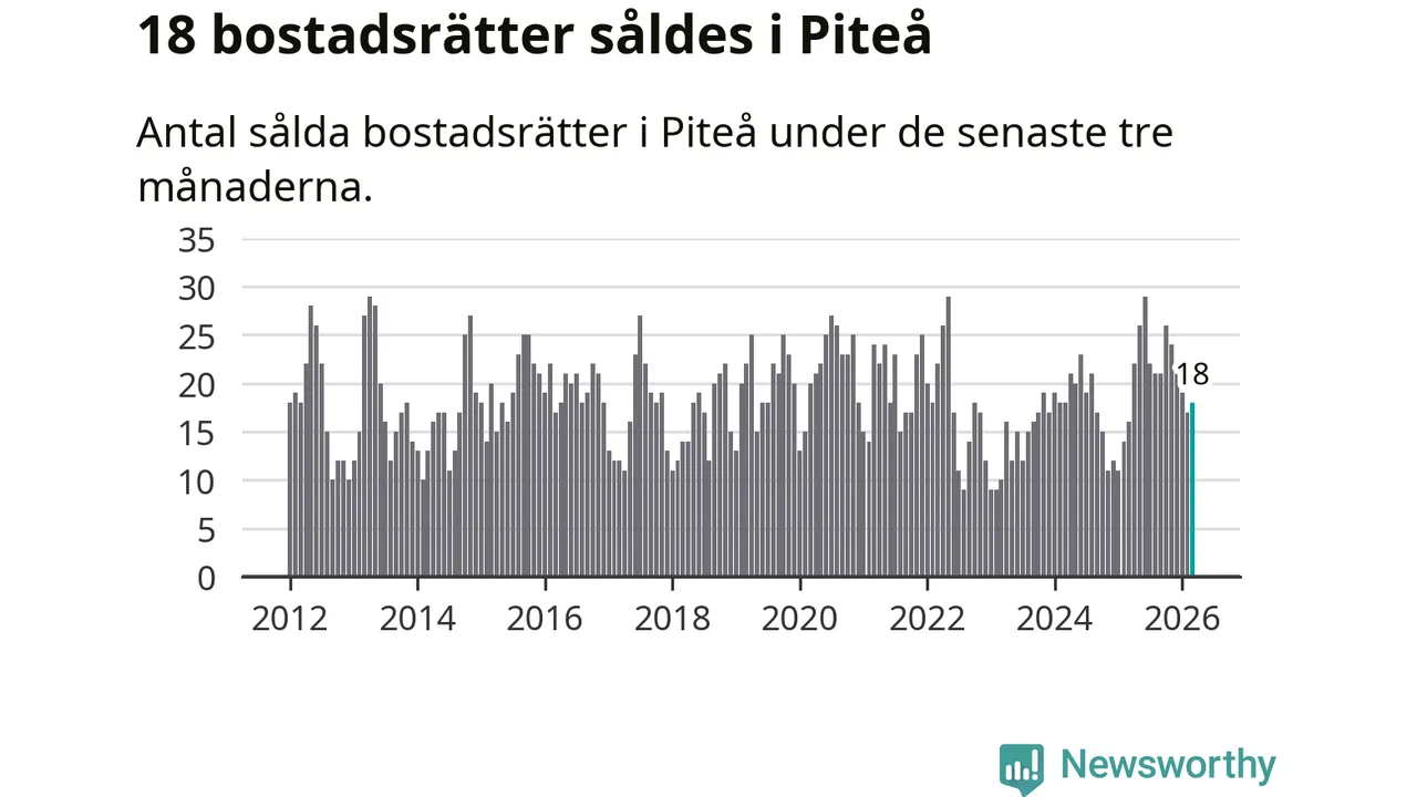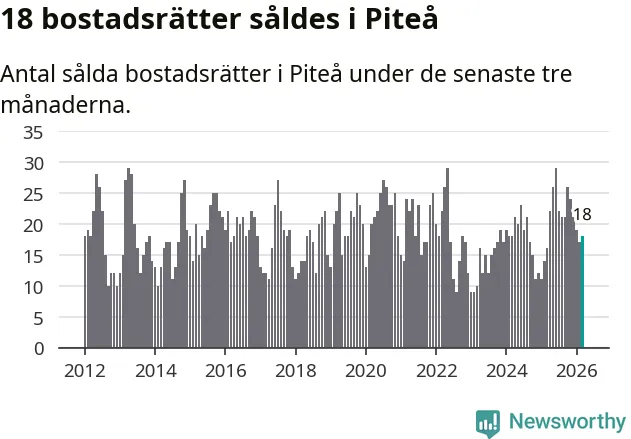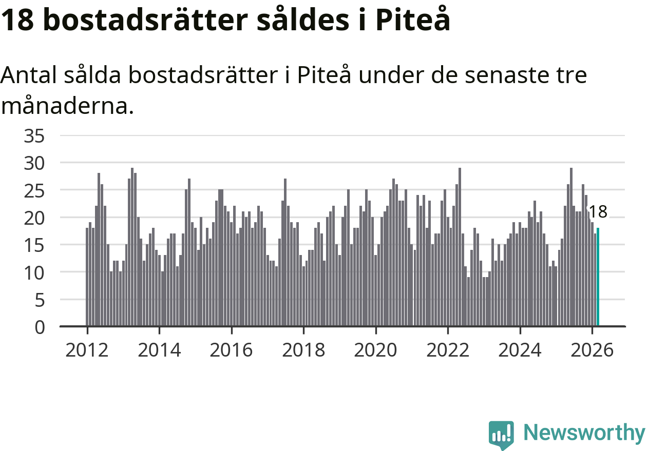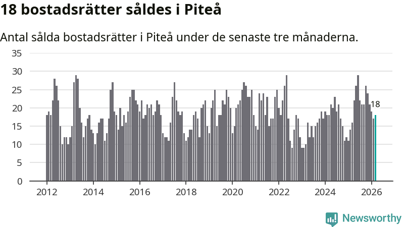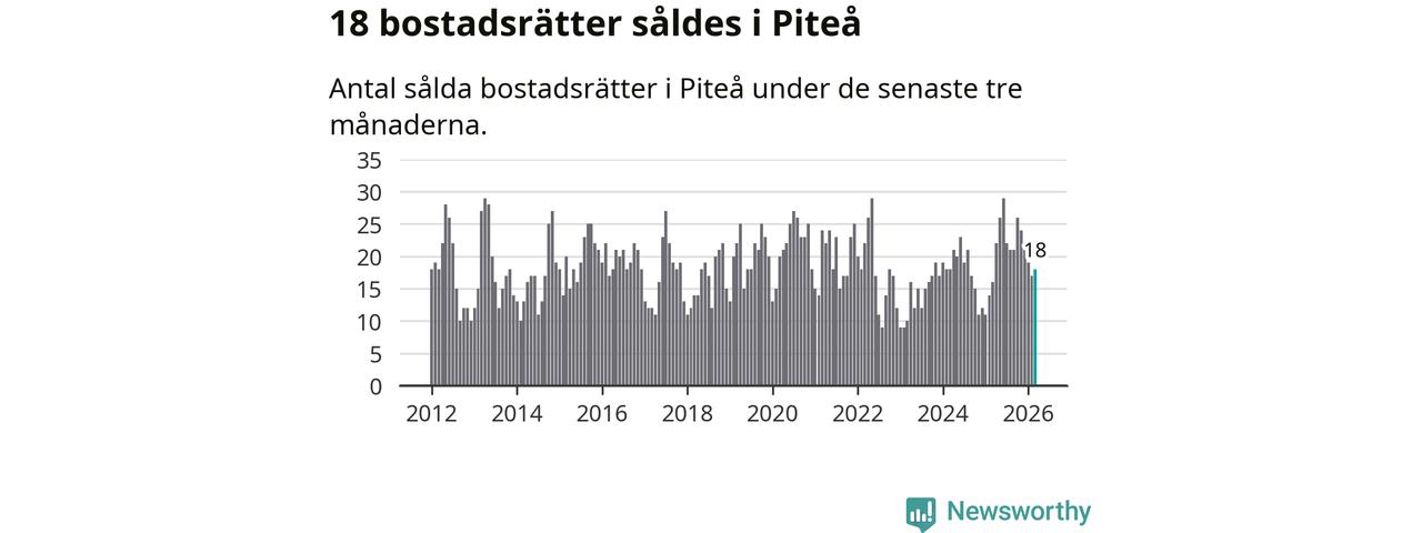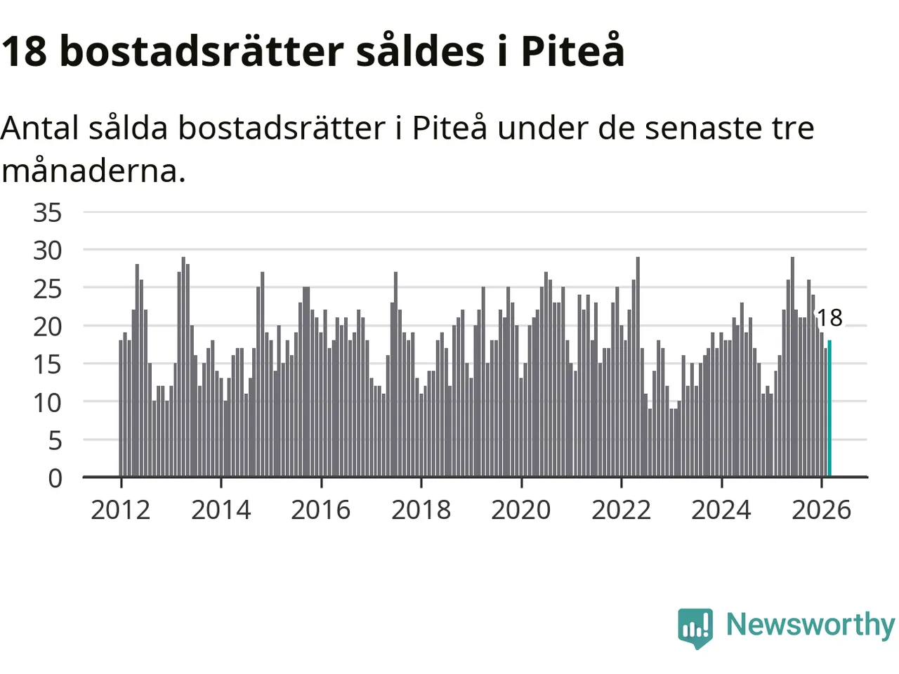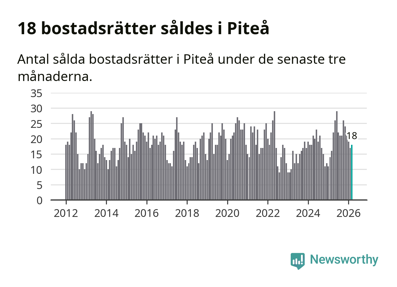 Mellan januari och mars gjordes sammanlagt 18 affärer med bostadsrätter i Piteå kommun. Det kan jämföras med 16 vid motsvarande tid i fjol.
