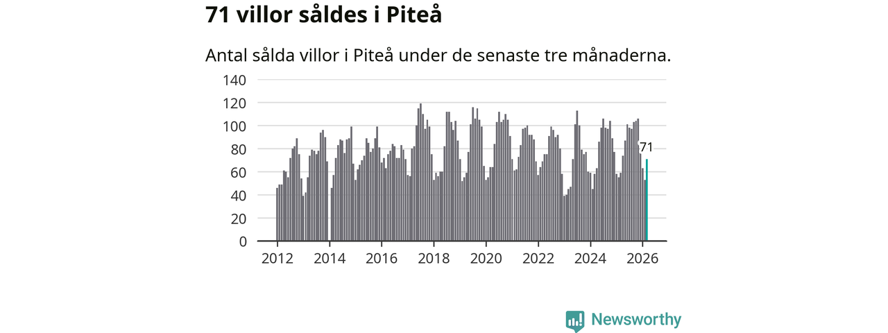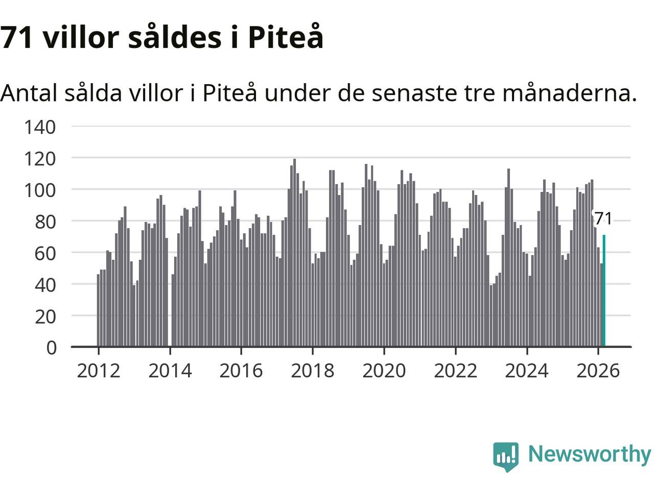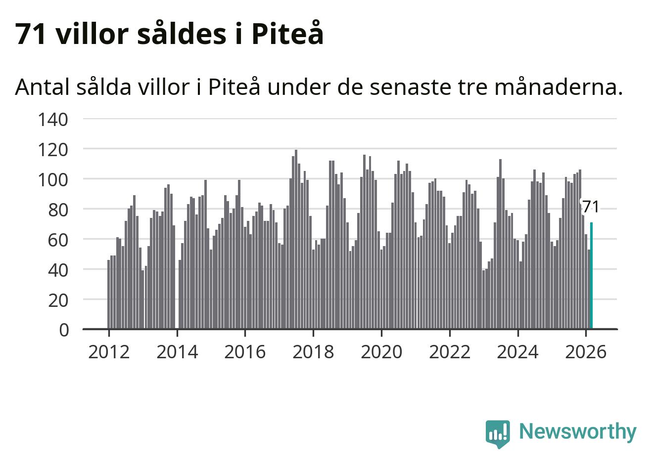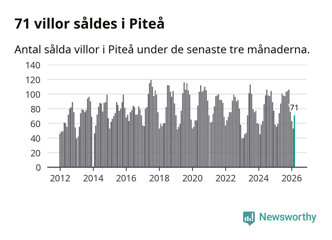 Sammanlagt såldes 71 villor i Piteå kommun mellan januari och mars till ett genomsnittligt pris på 2,4 miljoner kronor. I fjol gjordes 59 affärer vid den här tiden på året.