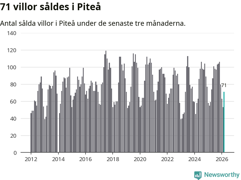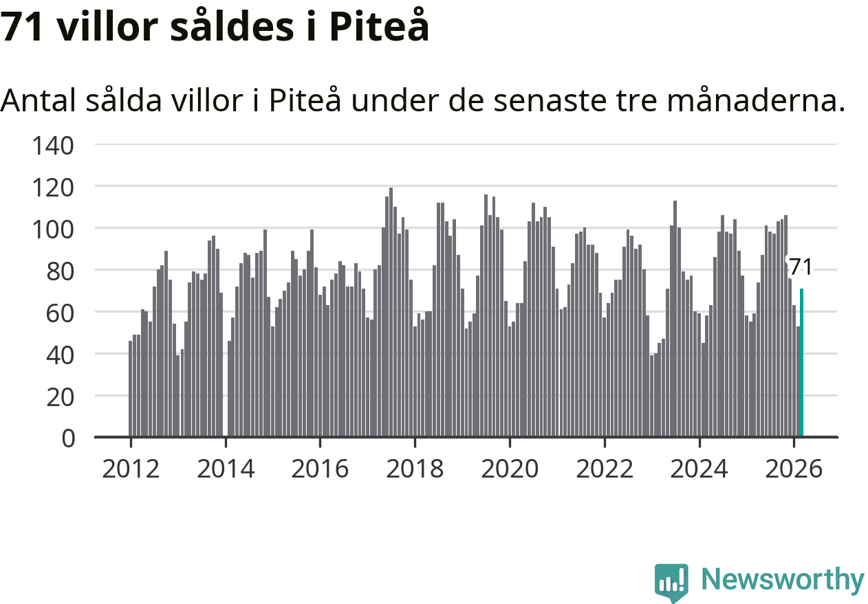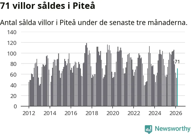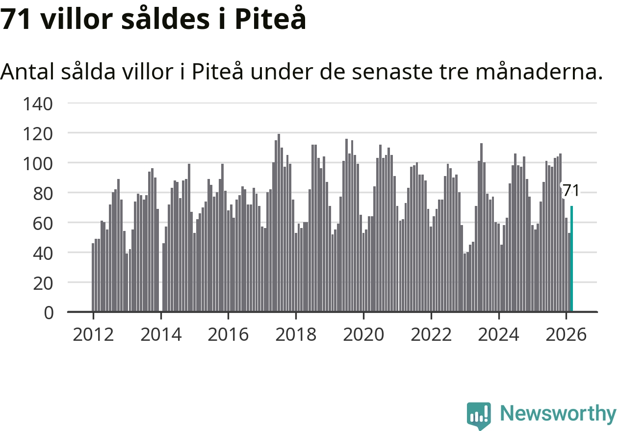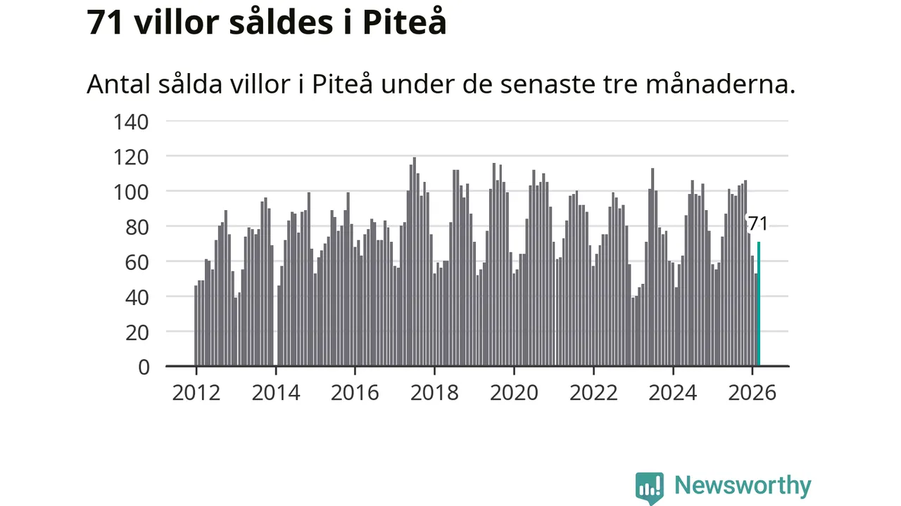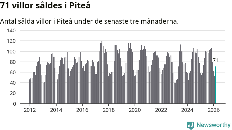 Sammanlagt såldes 71 villor i Piteå kommun mellan januari och mars till ett genomsnittligt pris på 2,4 miljoner kronor. I fjol gjordes 59 affärer vid den här tiden på året.
