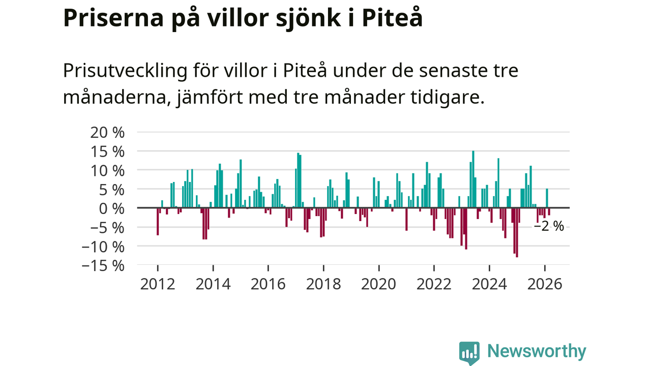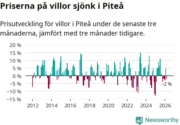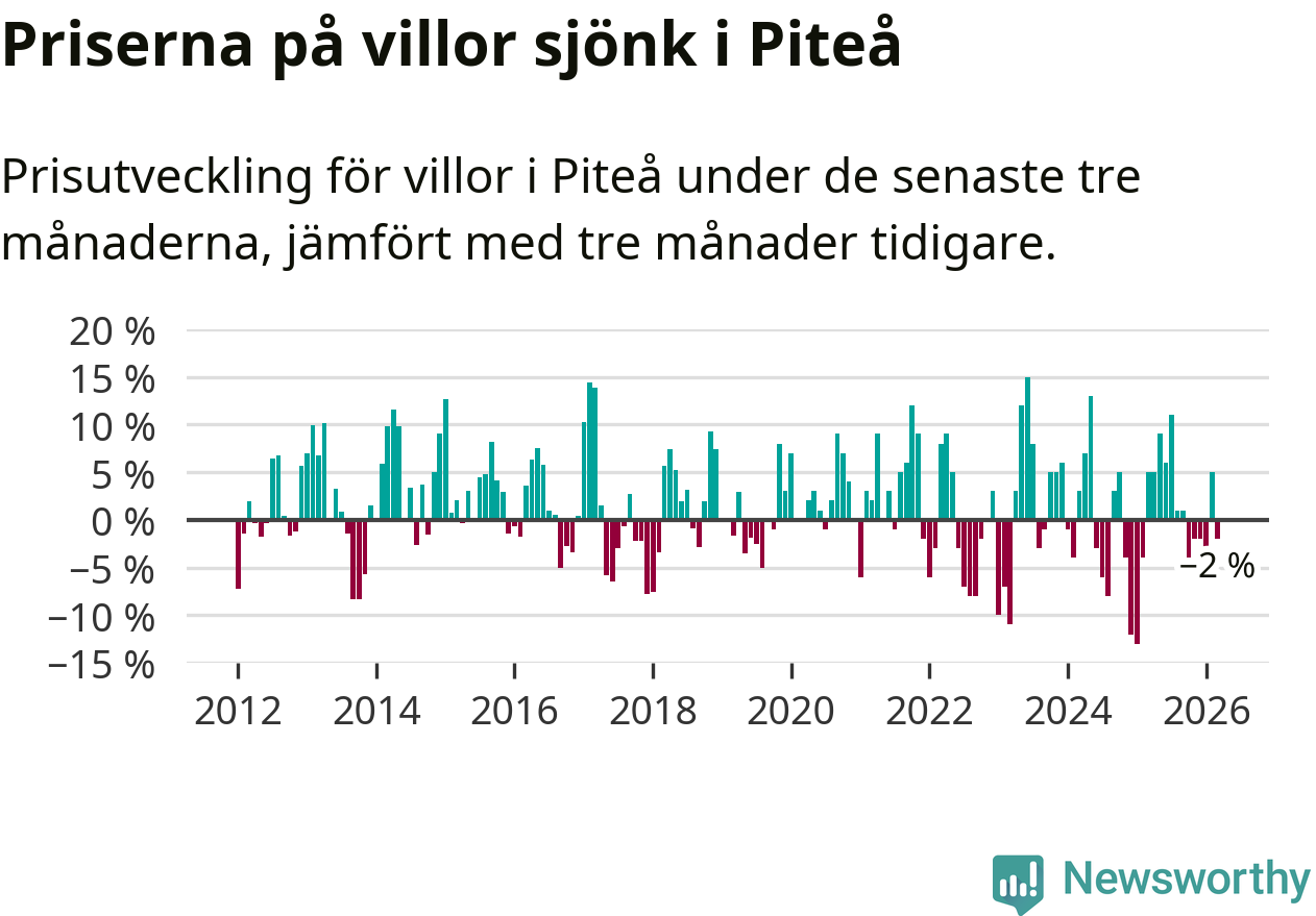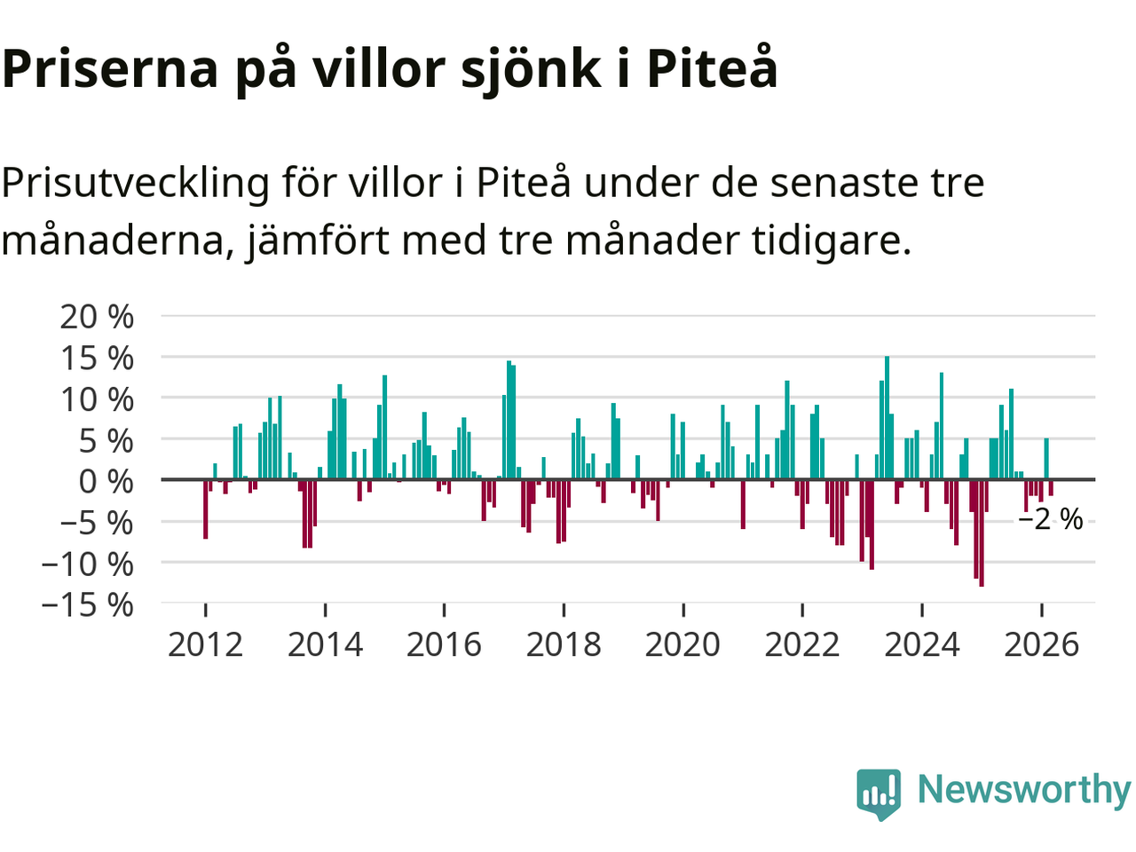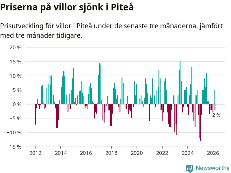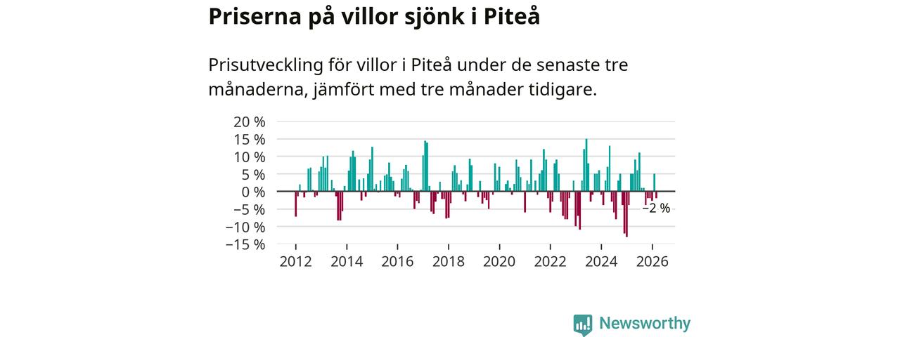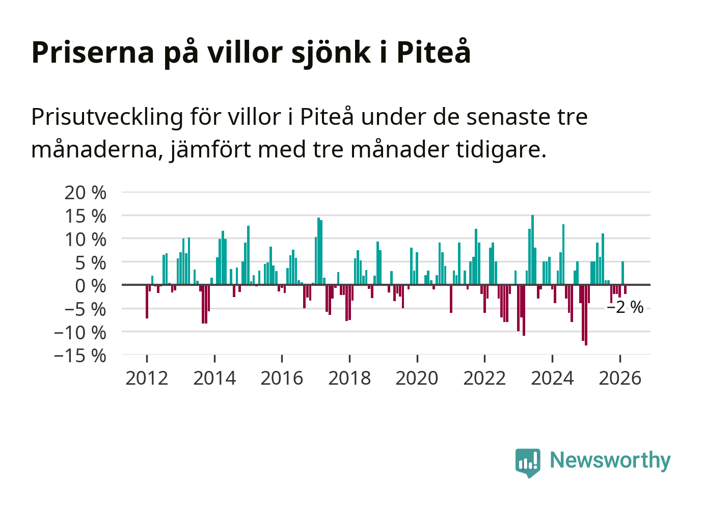 Villapriserna har gått ner i Piteå kommun. Medelpriset på försäljningarna under de senaste tre månaderna visar på en nedgång med 2 procent.