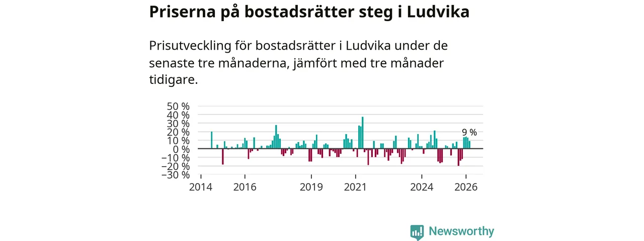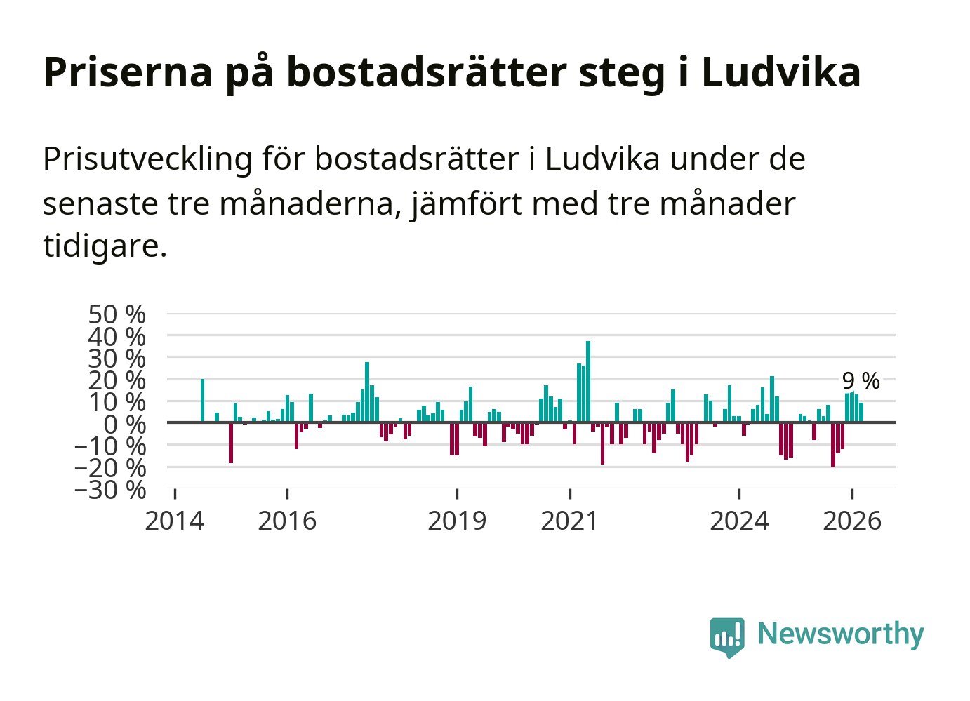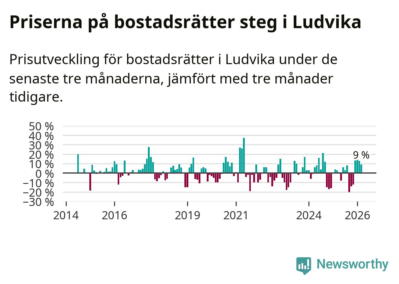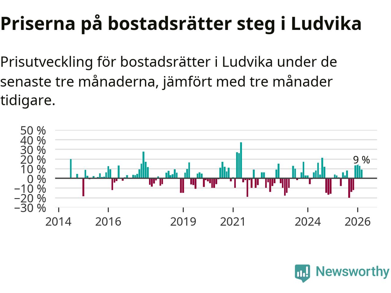 Priserna på bostadsrätter har gått upp i Ludvika kommun. Medelpriset på försäljningarna under de senaste tre månaderna visar på en uppgång med 9 procent.