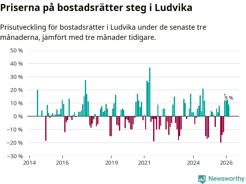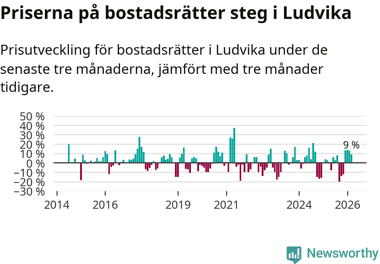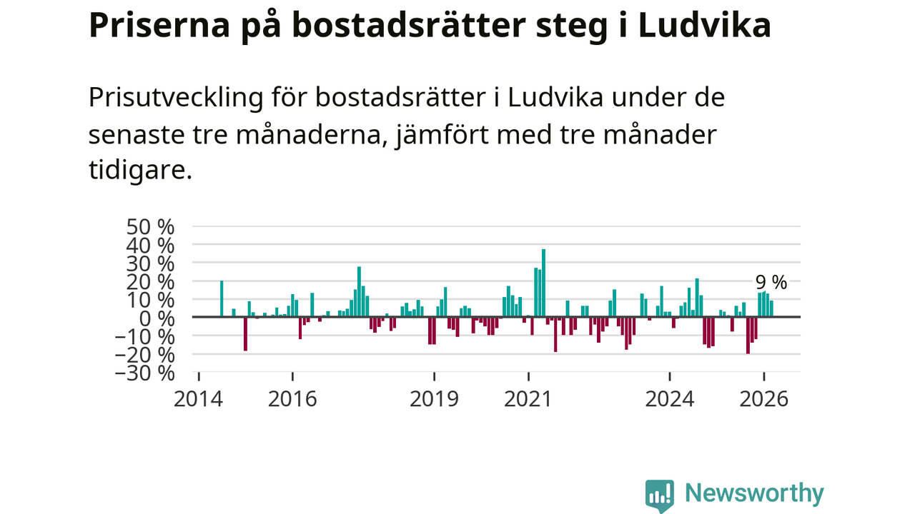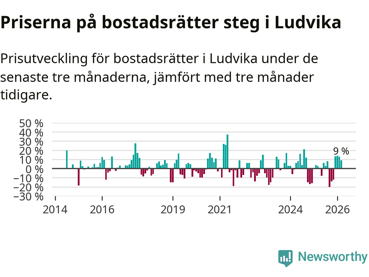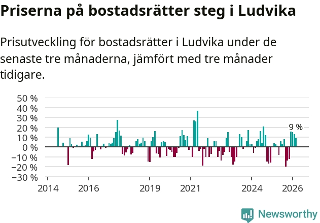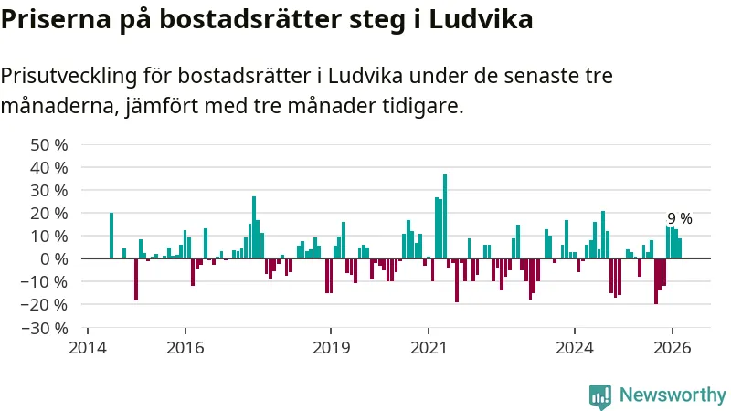 Priserna på bostadsrätter har gått upp i Ludvika kommun. Medelpriset på försäljningarna under de senaste tre månaderna visar på en uppgång med 9 procent.