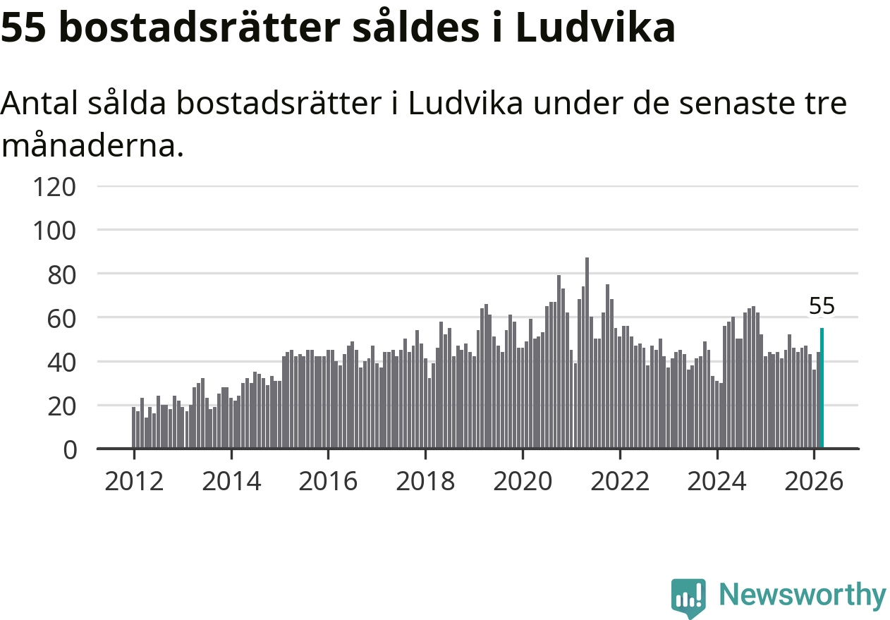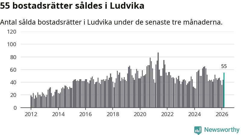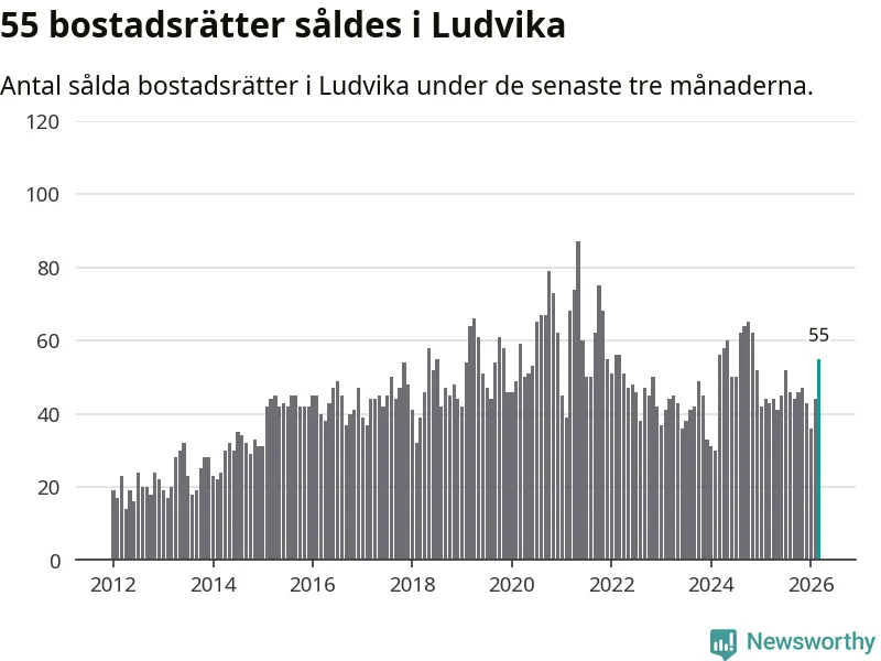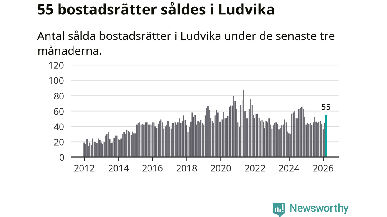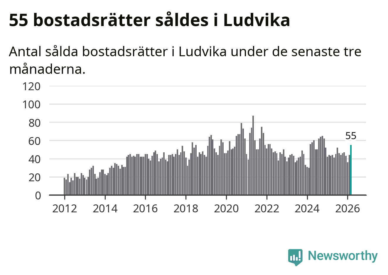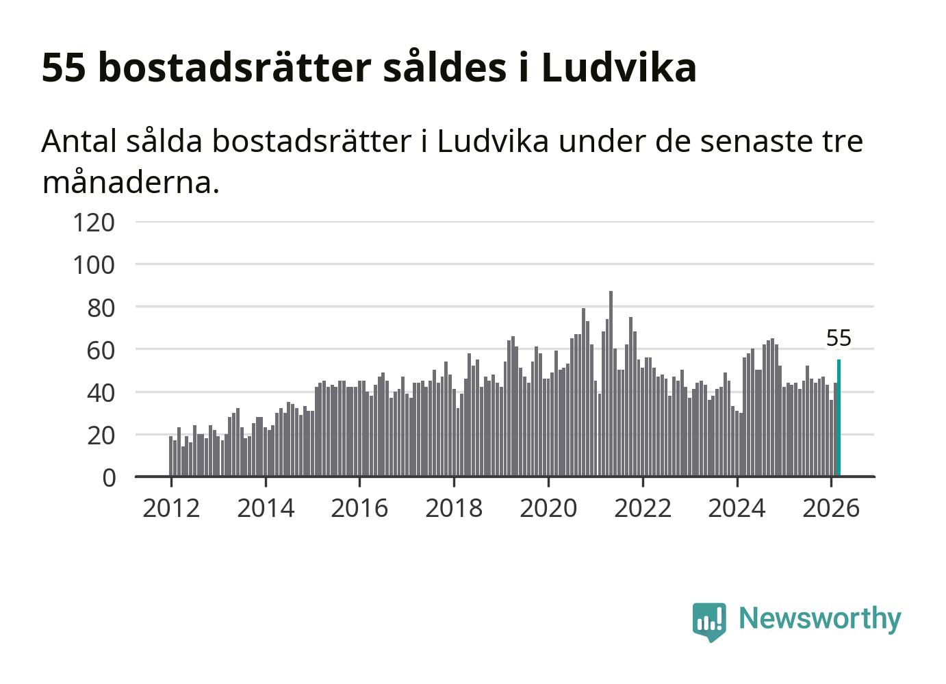 Sammanlagt såldes 55 bostadsrätter i Ludvika kommun mellan januari och mars till ett genomsnittligt pris på 0,7 miljoner kronor. I fjol gjordes 43 affärer vid den här tiden på året.