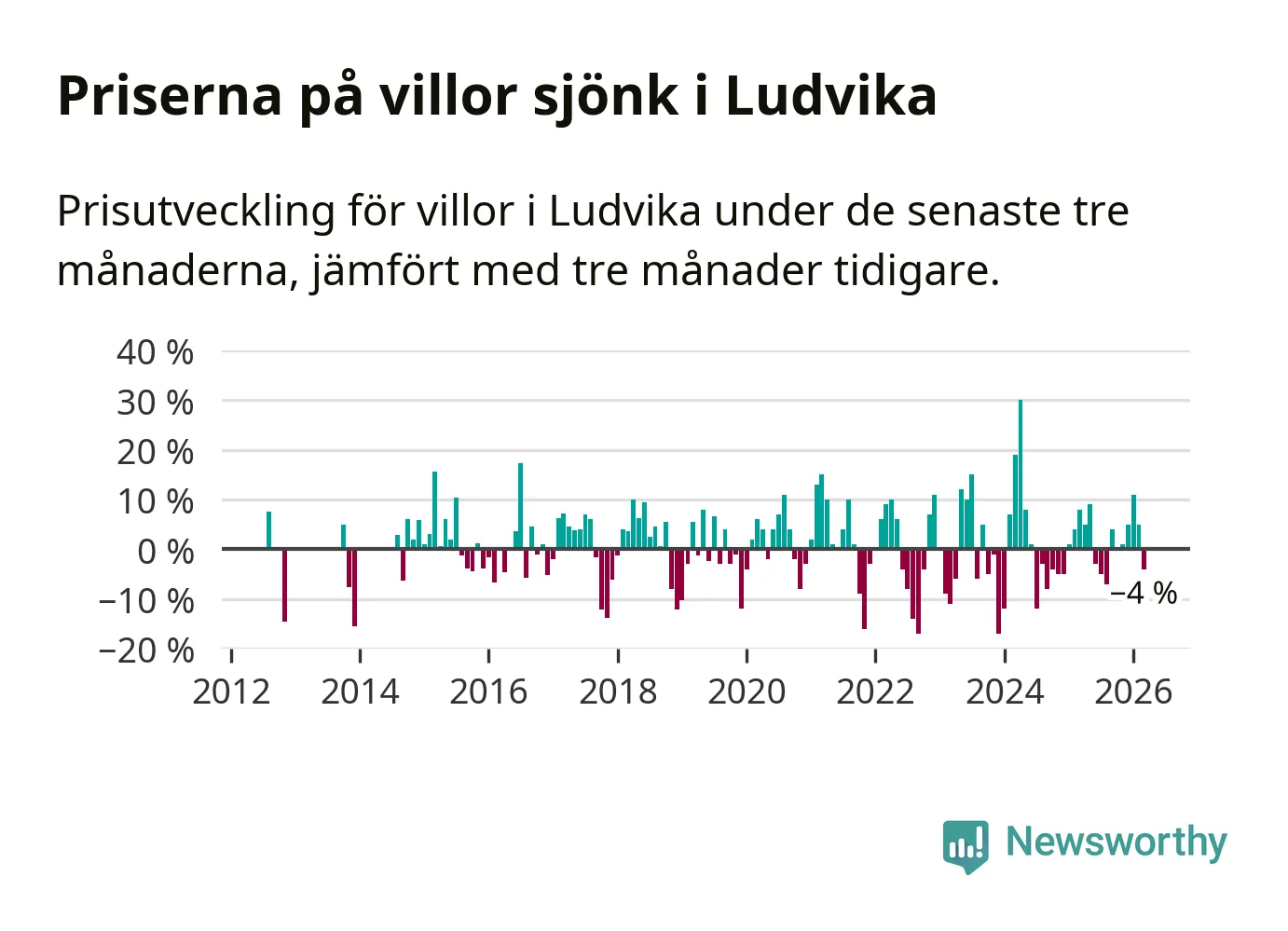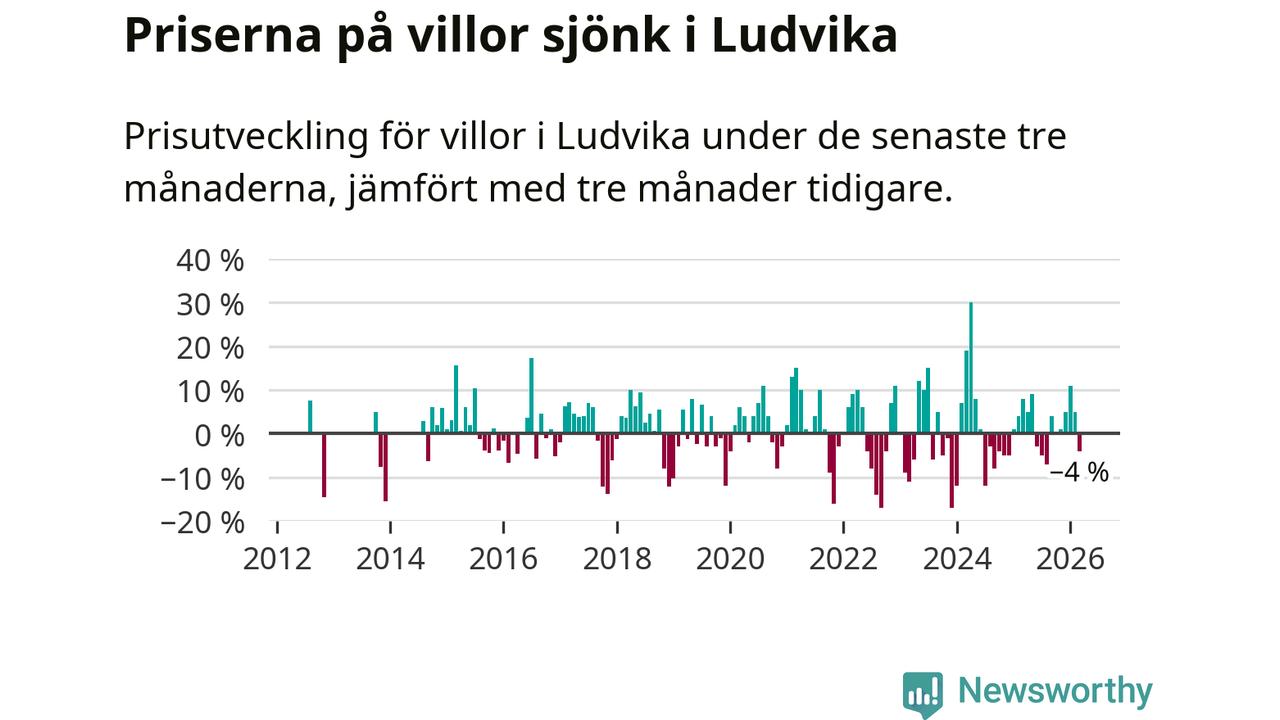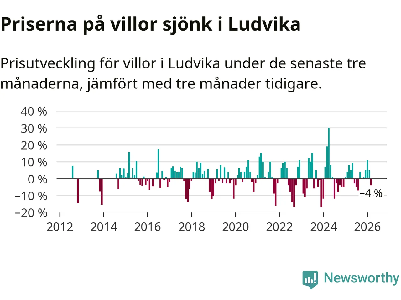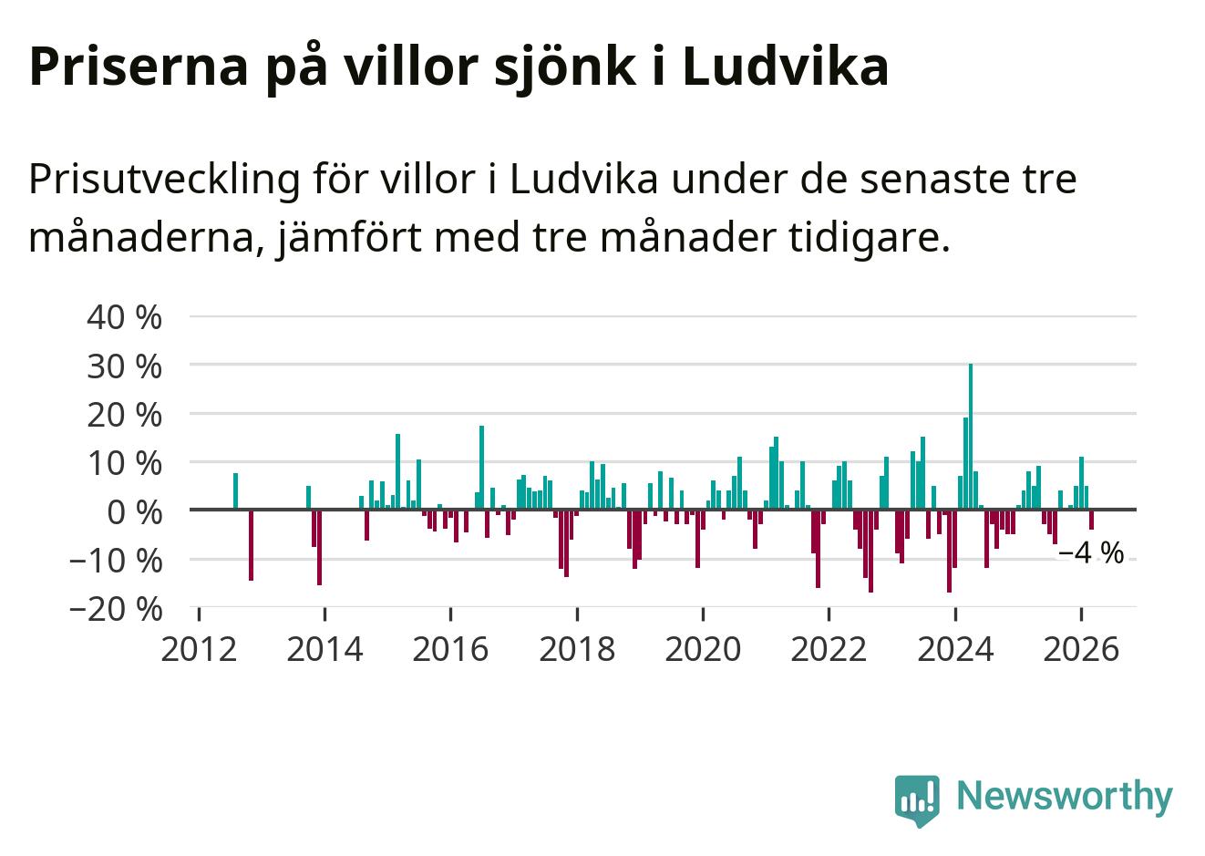 Villapriserna har gått ner i Ludvika kommun. Medelpriset på försäljningarna under de senaste tre månaderna visar på en nedgång med 4 procent.