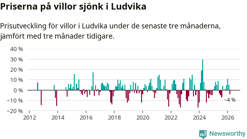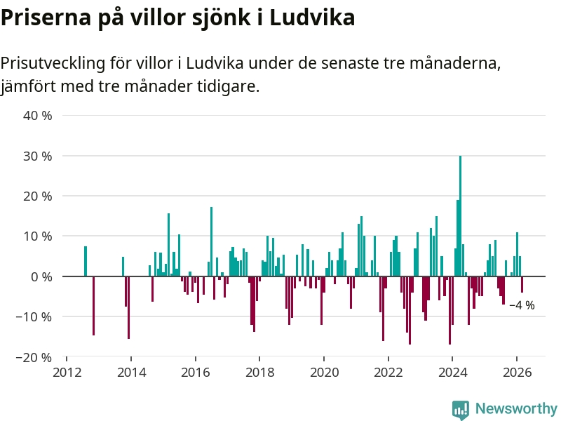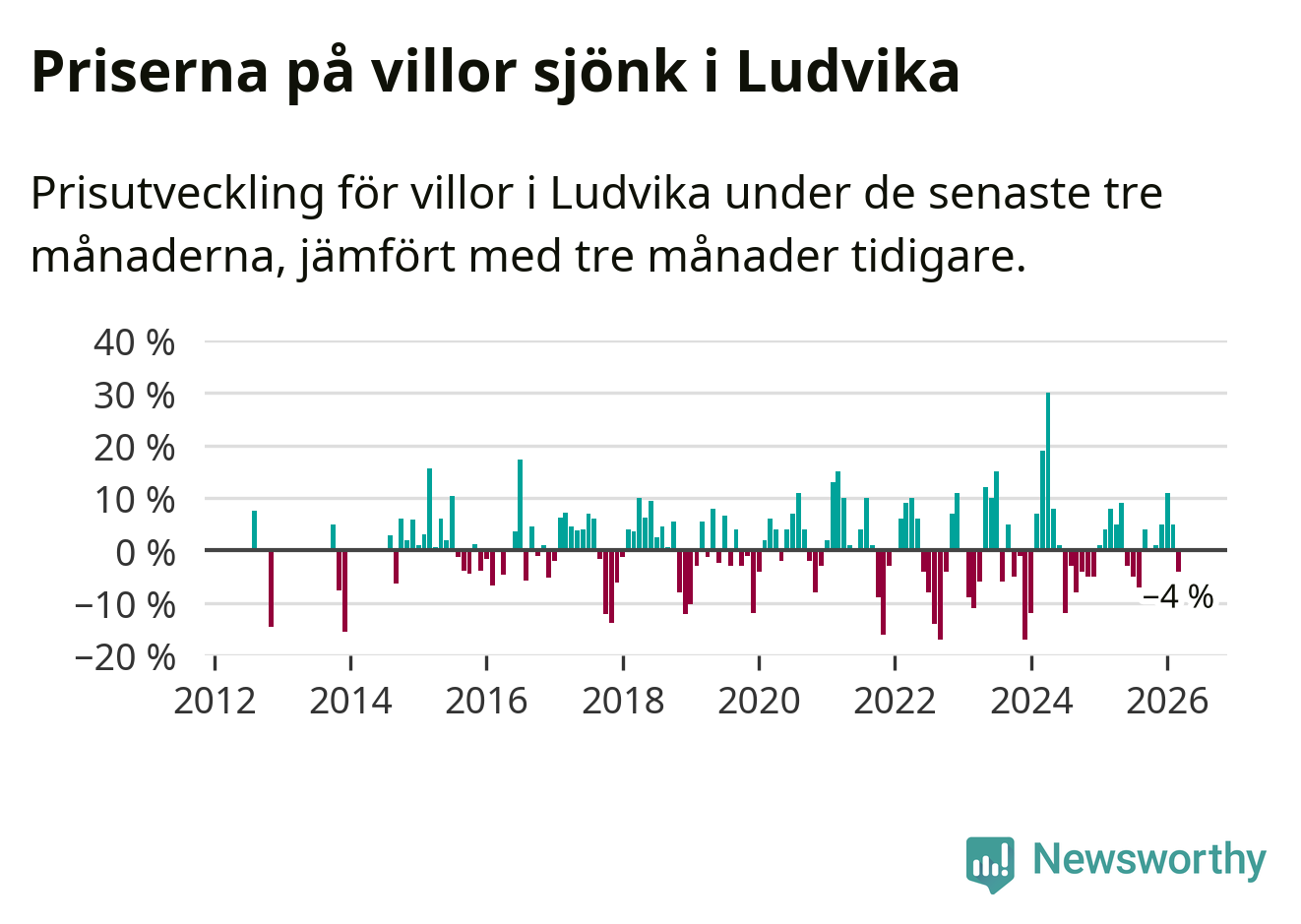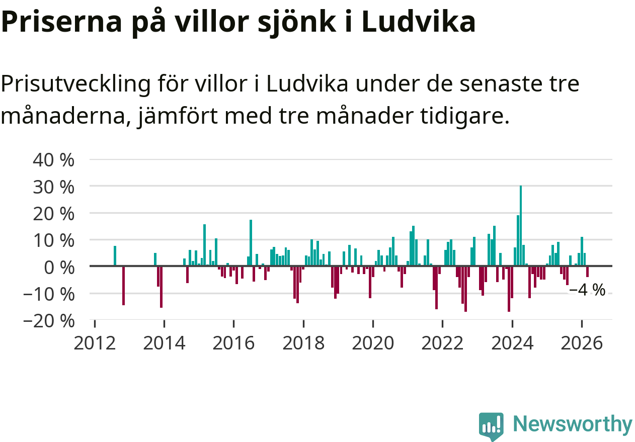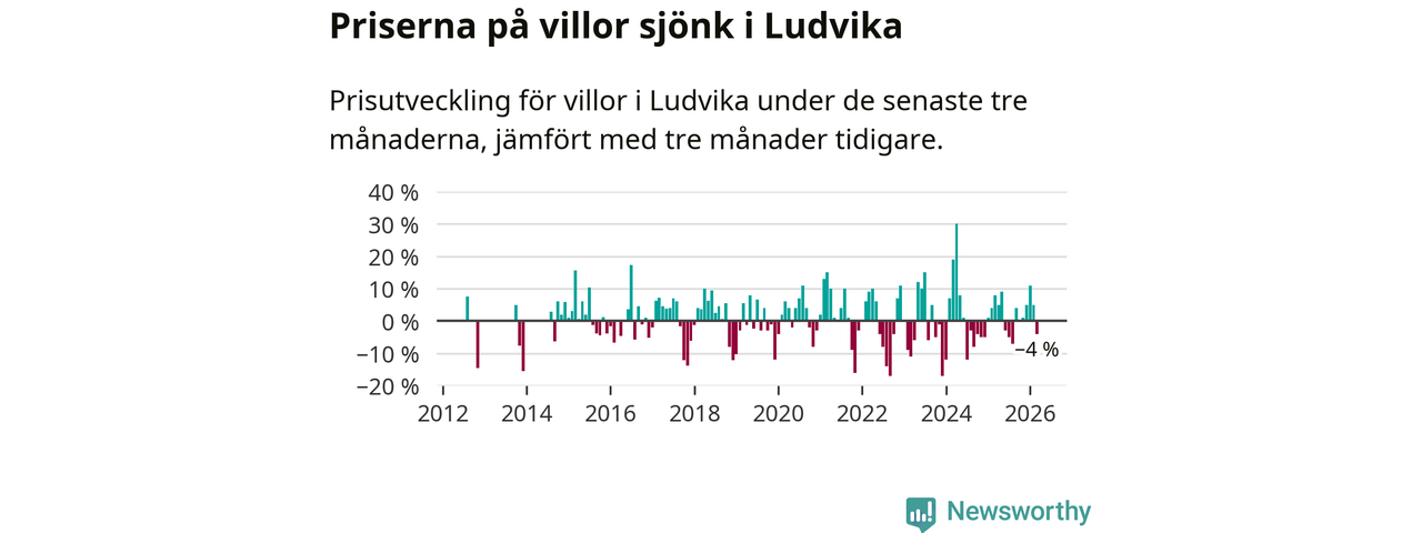 Villapriserna har gått ner i Ludvika kommun. Medelpriset på försäljningarna under de senaste tre månaderna visar på en nedgång med 4 procent.