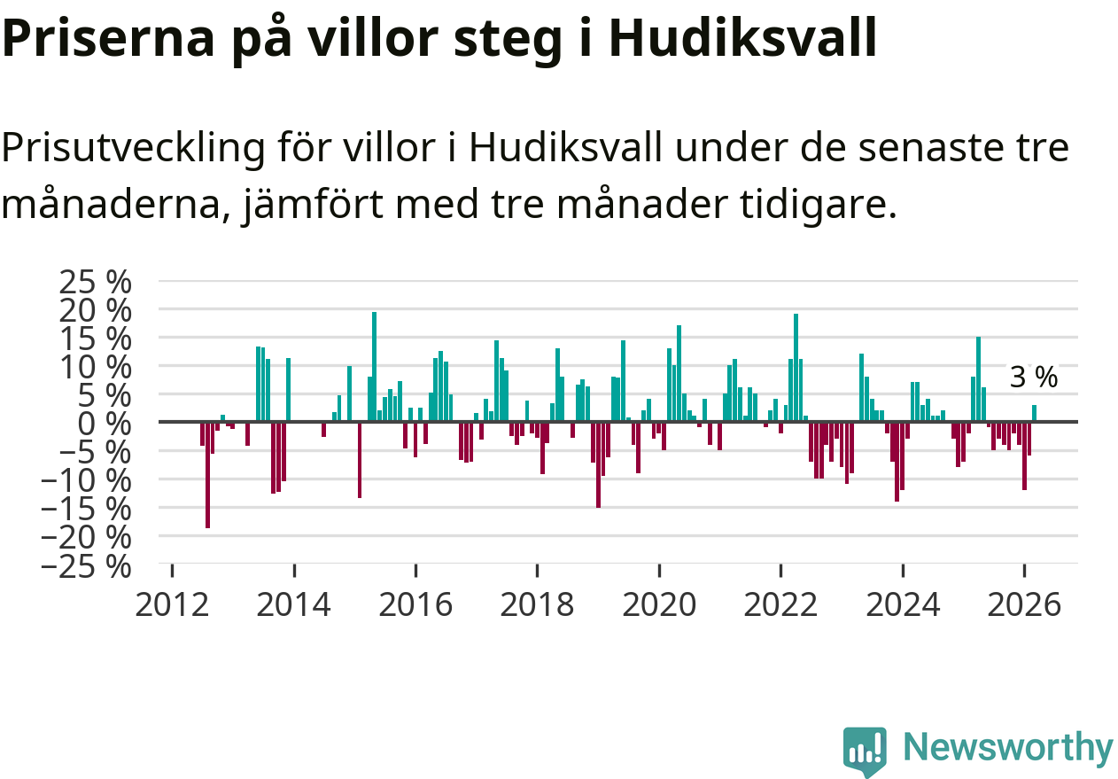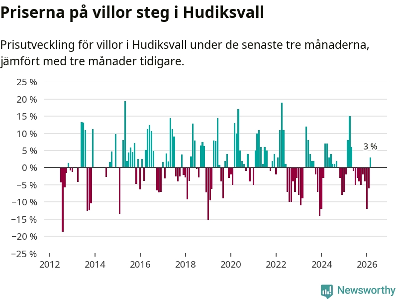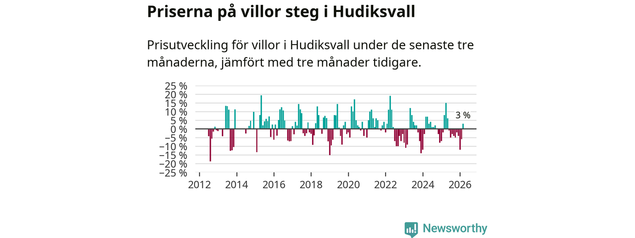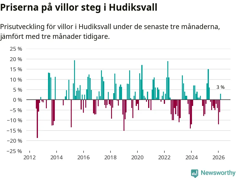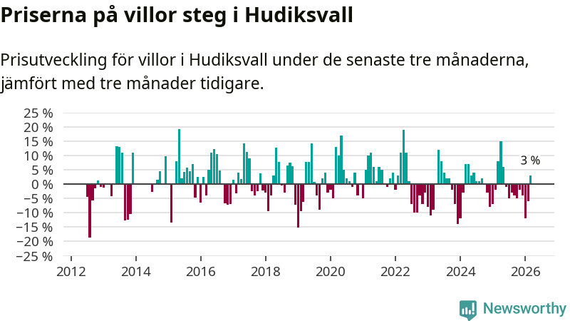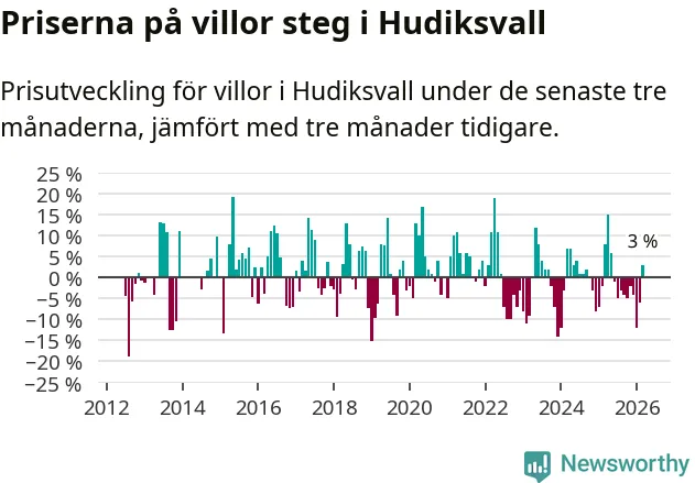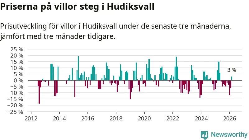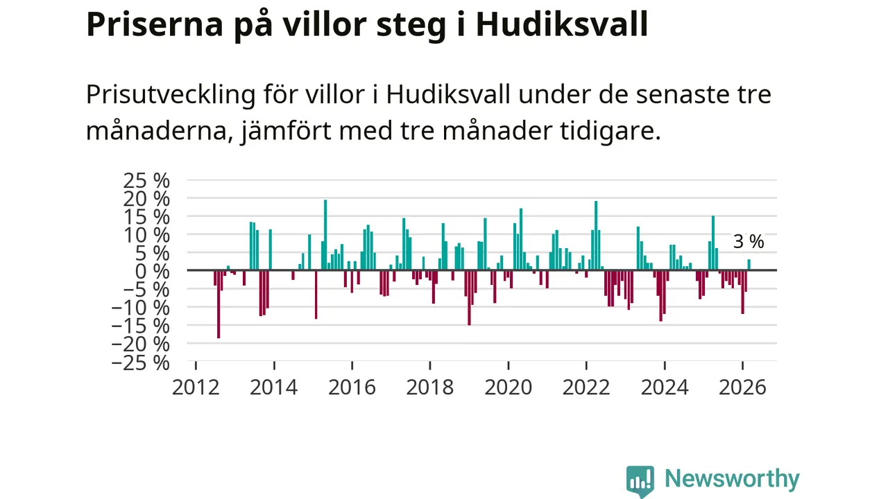 Sedan maj 2025 har villapriserna sjunkit i Hudiksvalls kommun, men försäljningarna under de senaste tre månaderna visar på en uppgång med 3 procent.