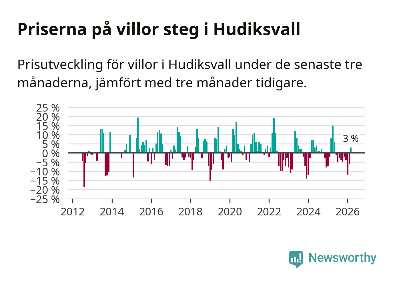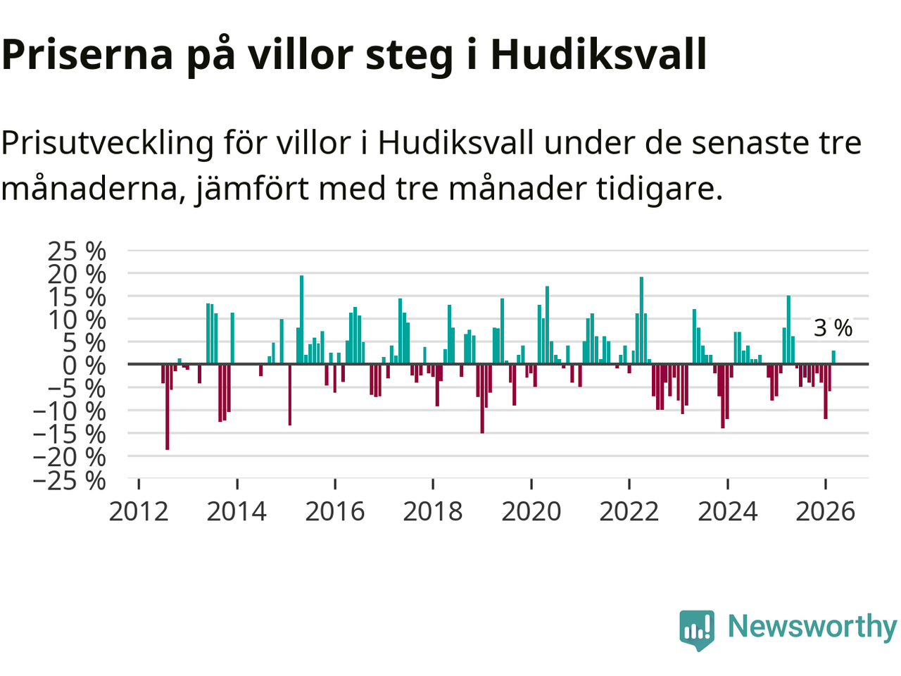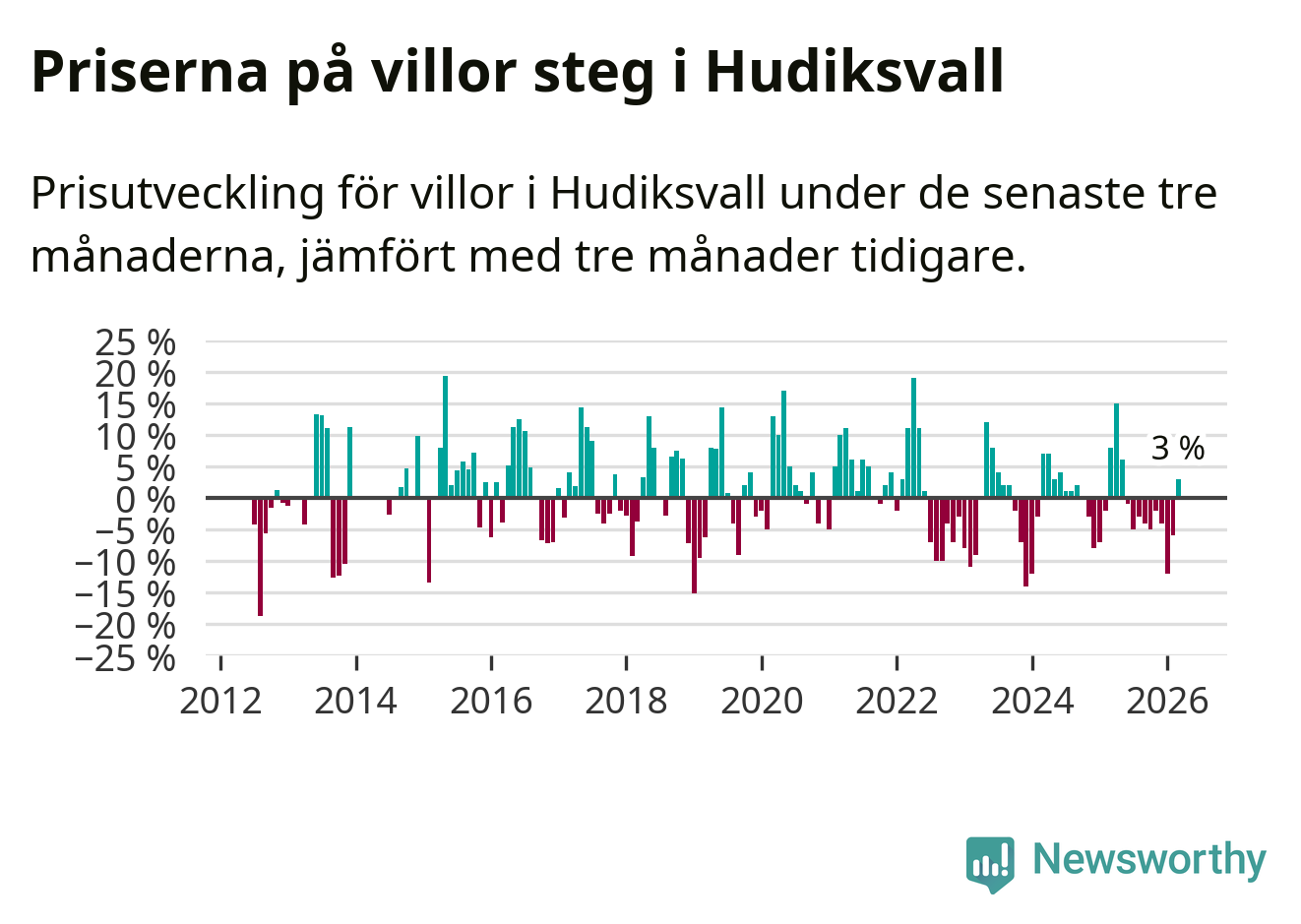 Sedan maj 2025 har villapriserna sjunkit i Hudiksvalls kommun, men försäljningarna under de senaste tre månaderna visar på en uppgång med 3 procent.