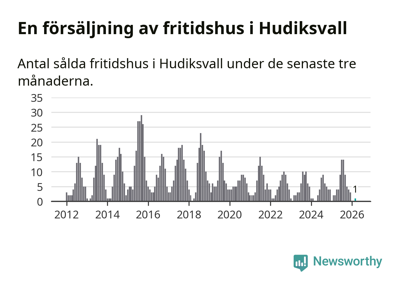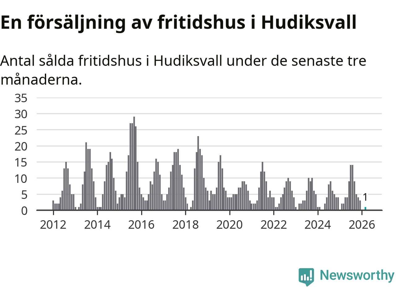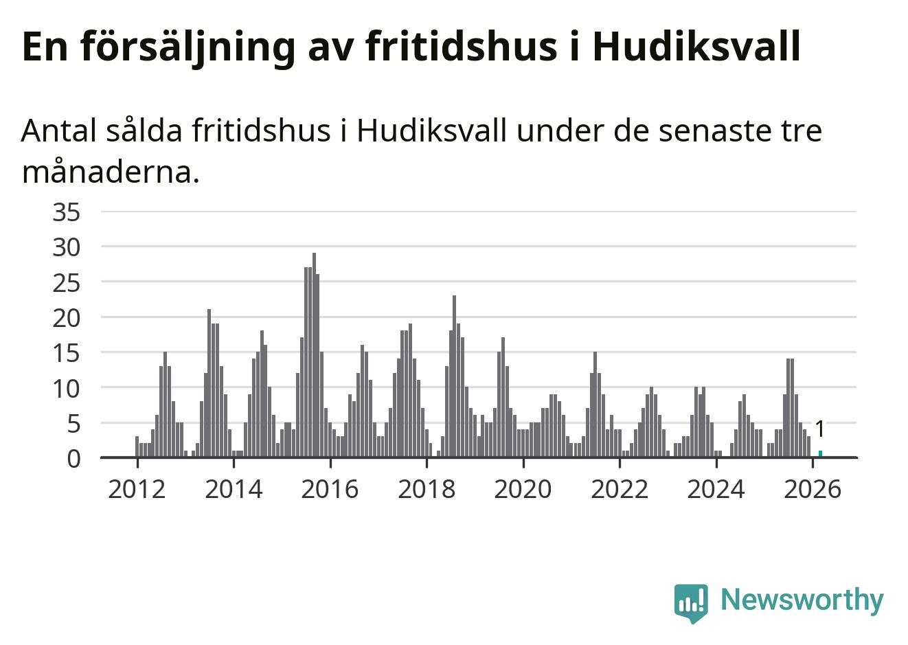 Mellan januari och mars gjordes sammanlagt en affär med fritidshus i Hudiksvalls kommun. Det kan jämföras med två vid motsvarande tid i fjol.