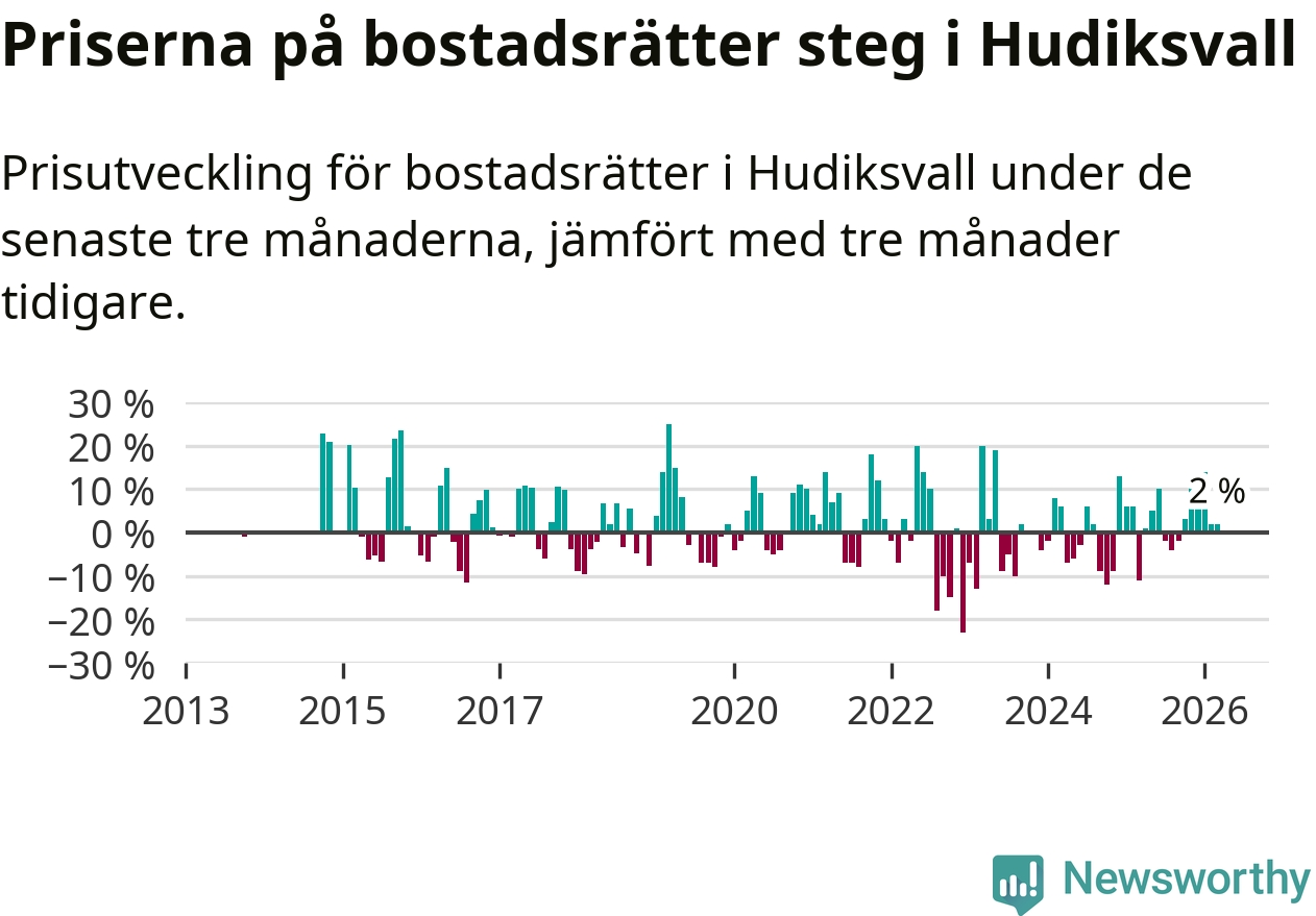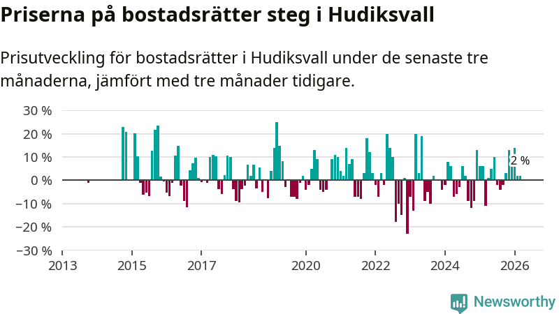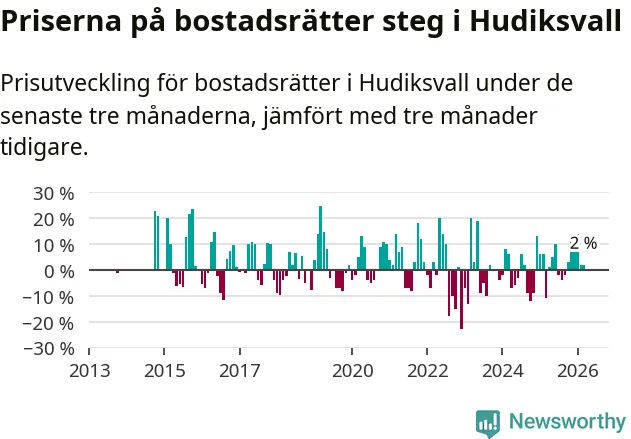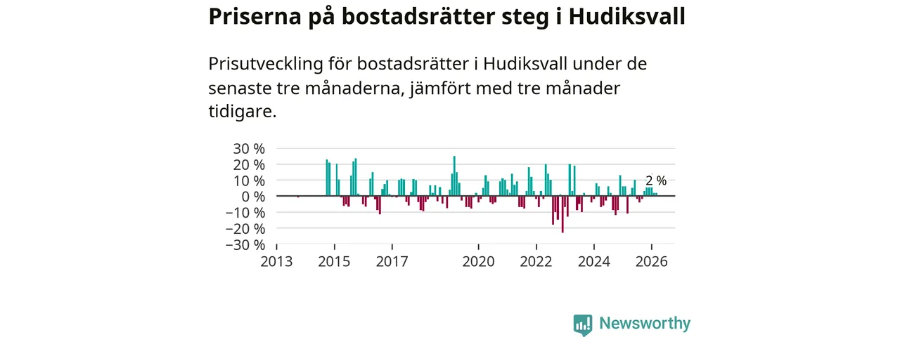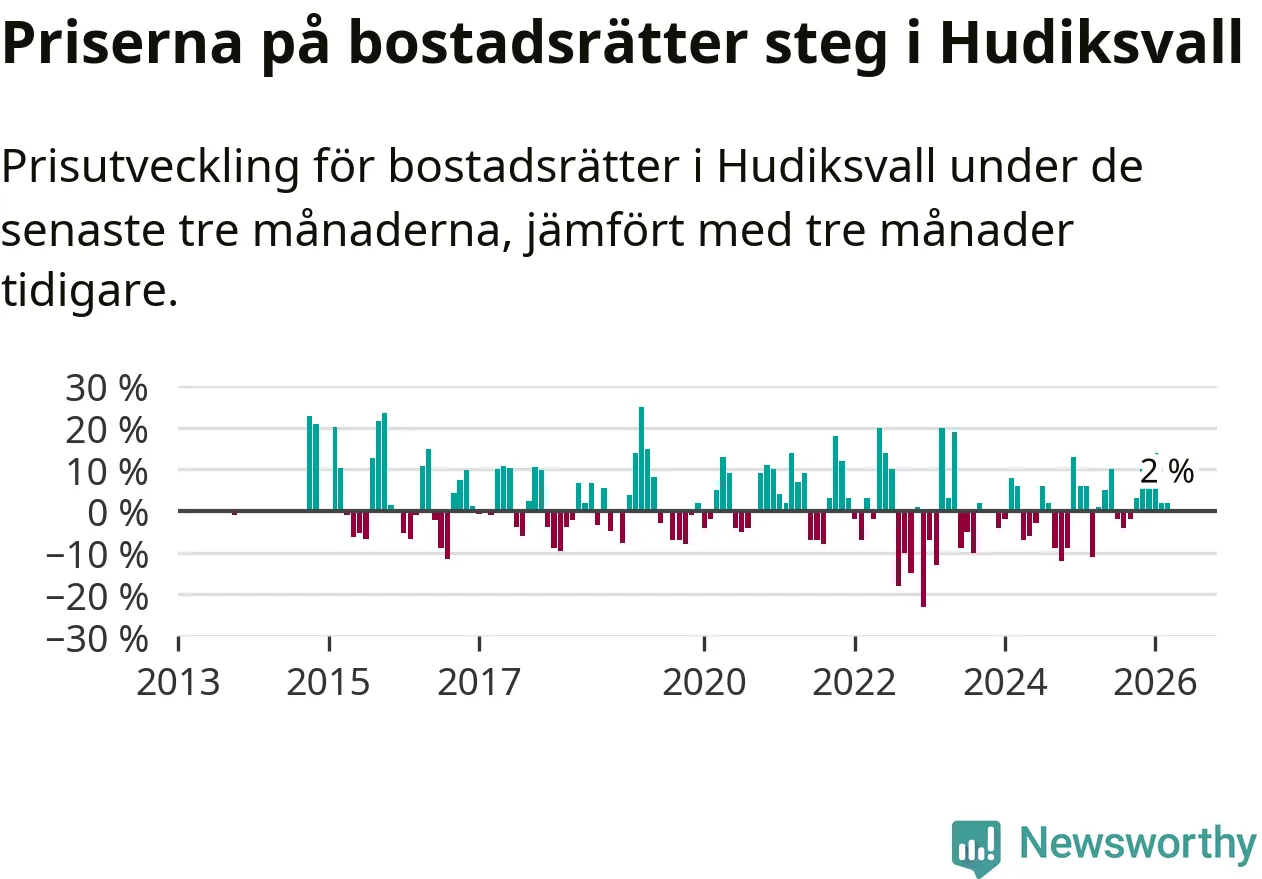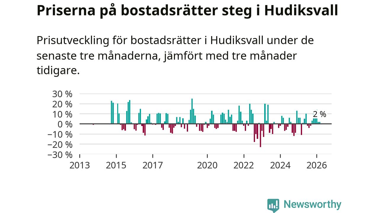 Priserna på bostadsrätter har gått upp i Hudiksvalls kommun. Medelpriset på försäljningarna under de senaste tre månaderna visar på en uppgång med 2 procent.