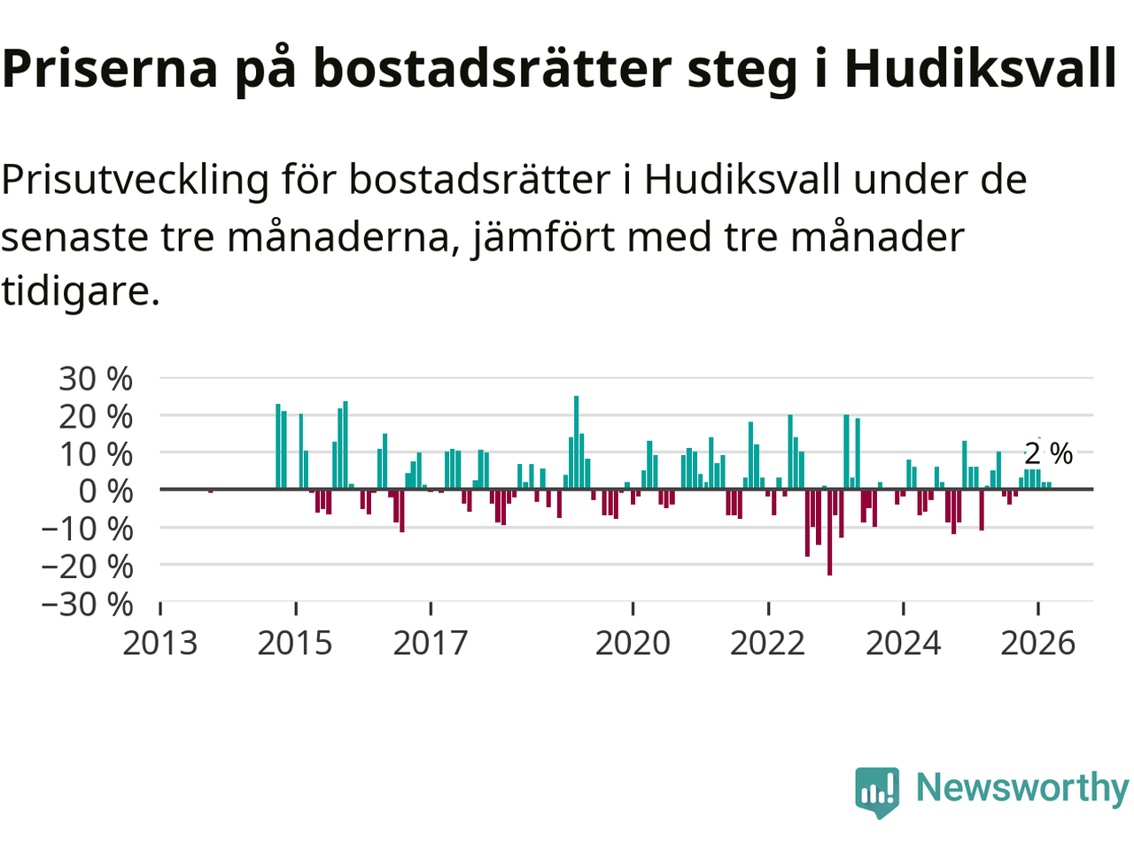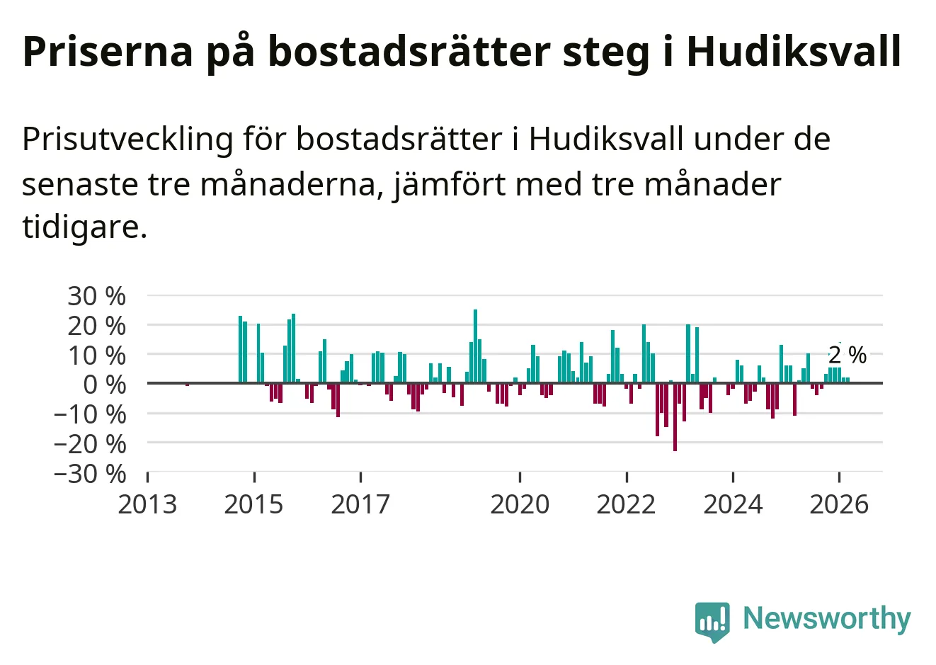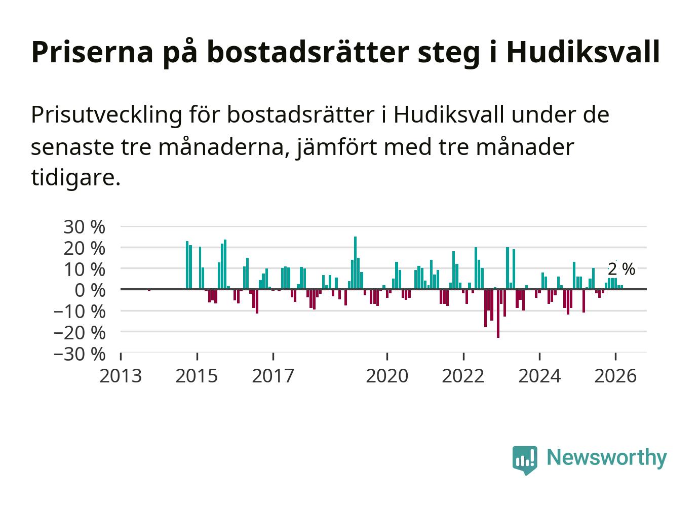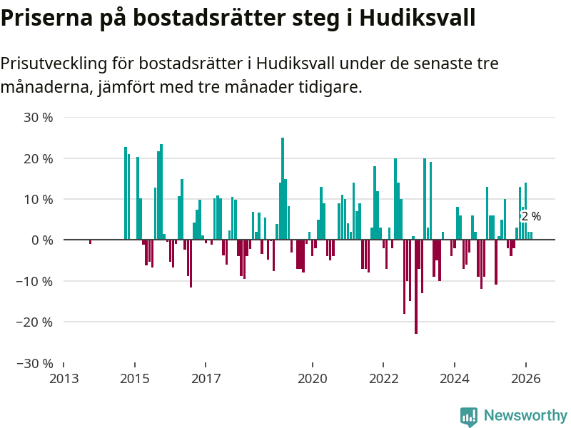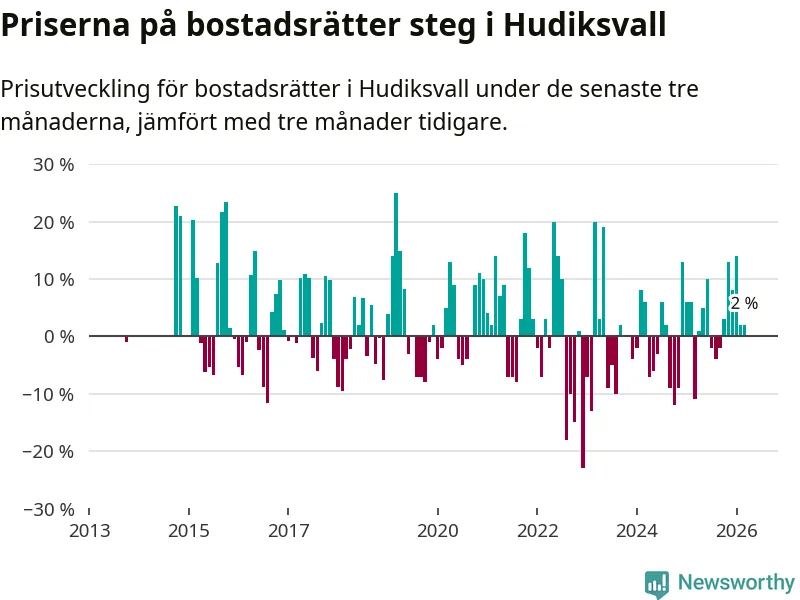 Priserna på bostadsrätter har gått upp i Hudiksvalls kommun. Medelpriset på försäljningarna under de senaste tre månaderna visar på en uppgång med 2 procent.