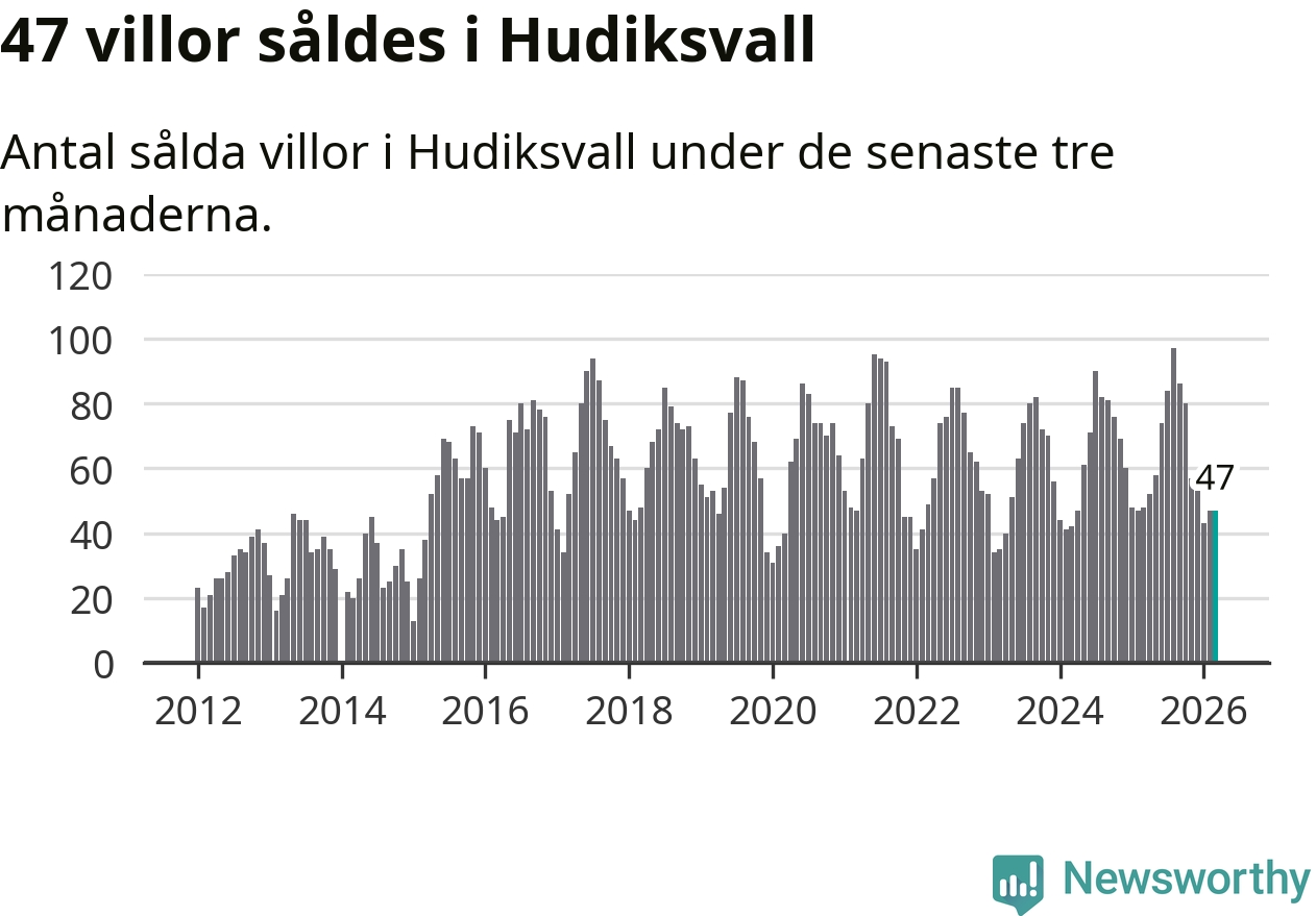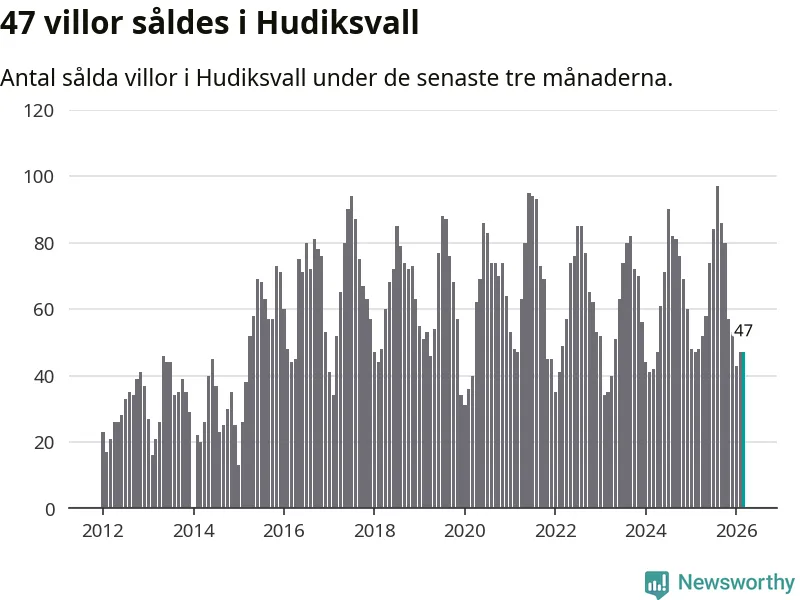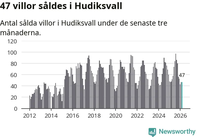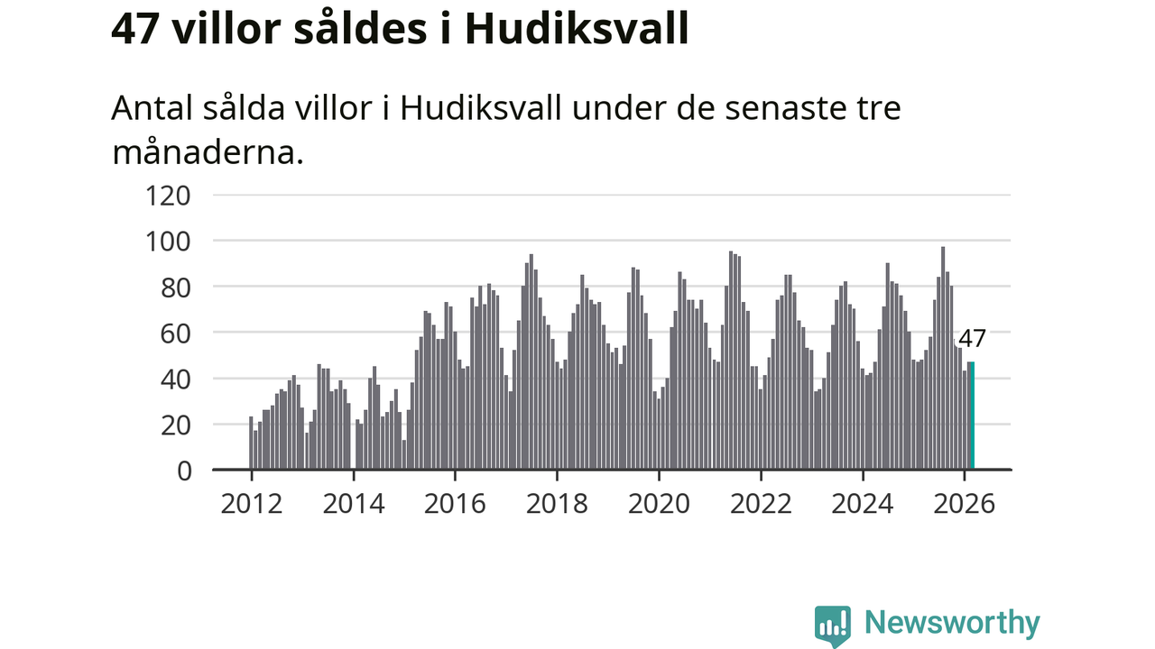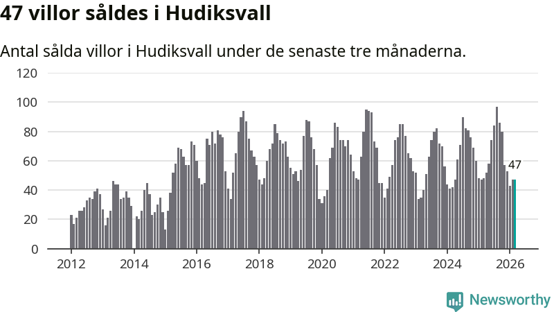 Sammanlagt såldes 47 villor i Hudiksvalls kommun mellan januari och mars till ett genomsnittligt pris på 2,2 miljoner kronor. I fjol gjordes 48 affärer vid den här tiden på året.