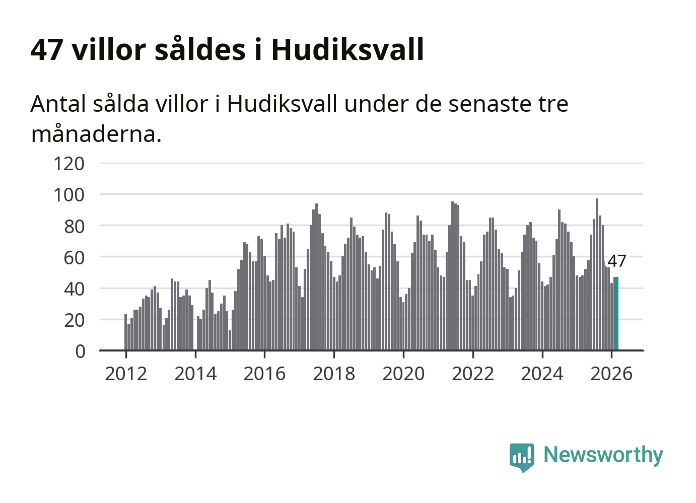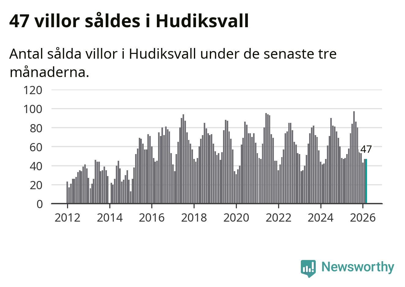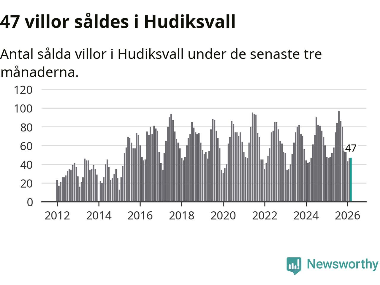 Sammanlagt såldes 47 villor i Hudiksvalls kommun mellan januari och mars till ett genomsnittligt pris på 2,2 miljoner kronor. I fjol gjordes 48 affärer vid den här tiden på året.