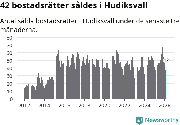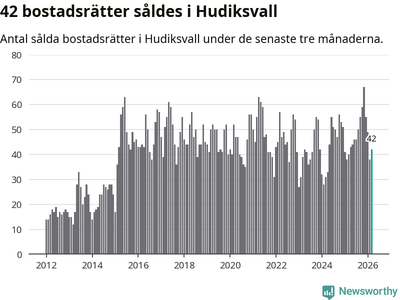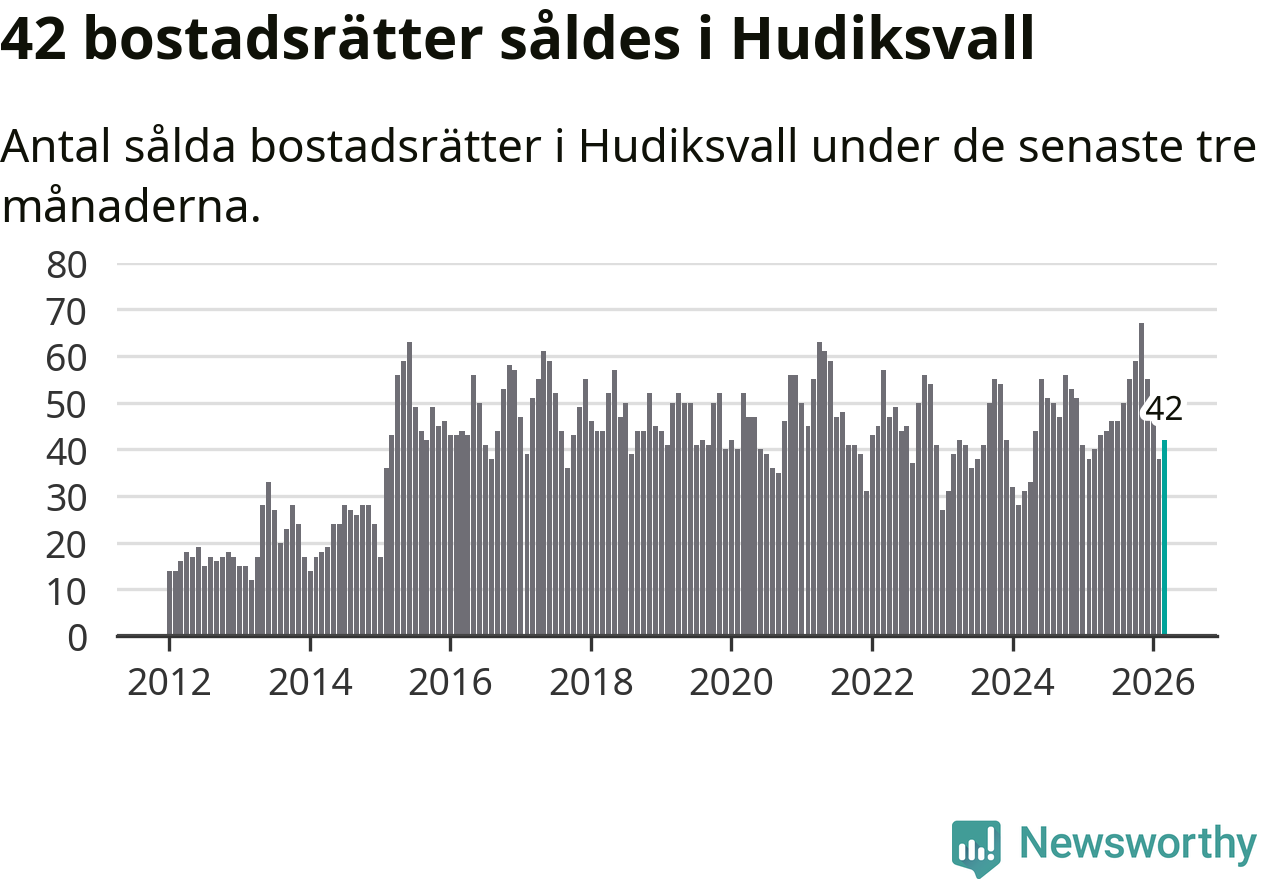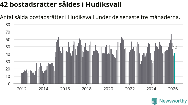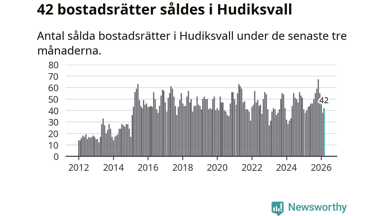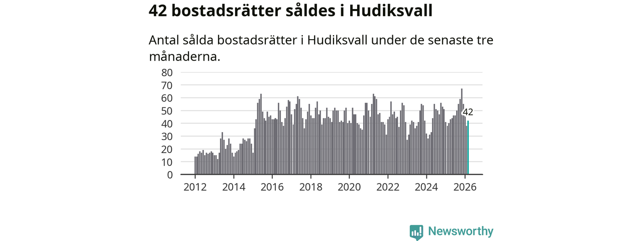 Sammanlagt såldes 42 bostadsrätter i Hudiksvalls kommun mellan januari och mars till ett genomsnittligt pris på 1,3 miljoner kronor. I fjol gjordes 40 affärer vid den här tiden på året.