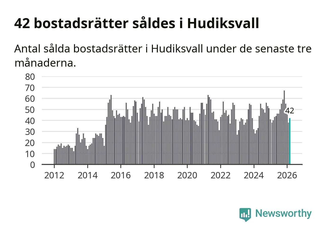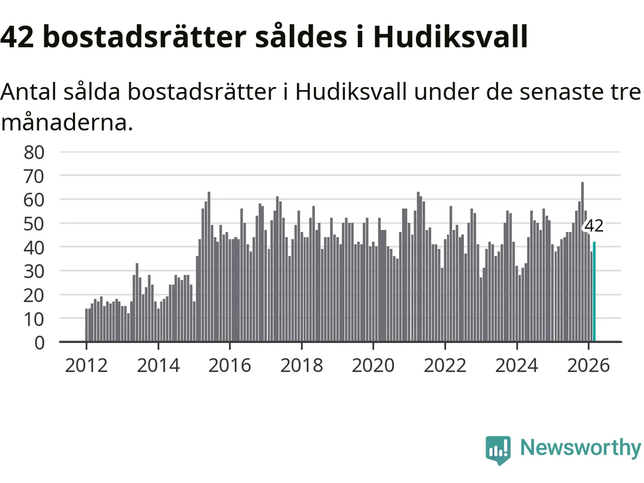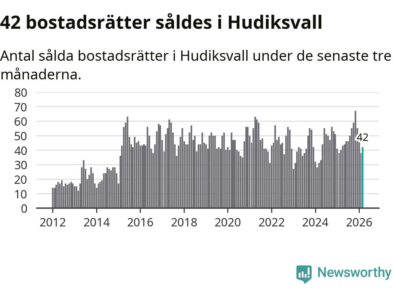 Sammanlagt såldes 42 bostadsrätter i Hudiksvalls kommun mellan januari och mars till ett genomsnittligt pris på 1,3 miljoner kronor. I fjol gjordes 40 affärer vid den här tiden på året.