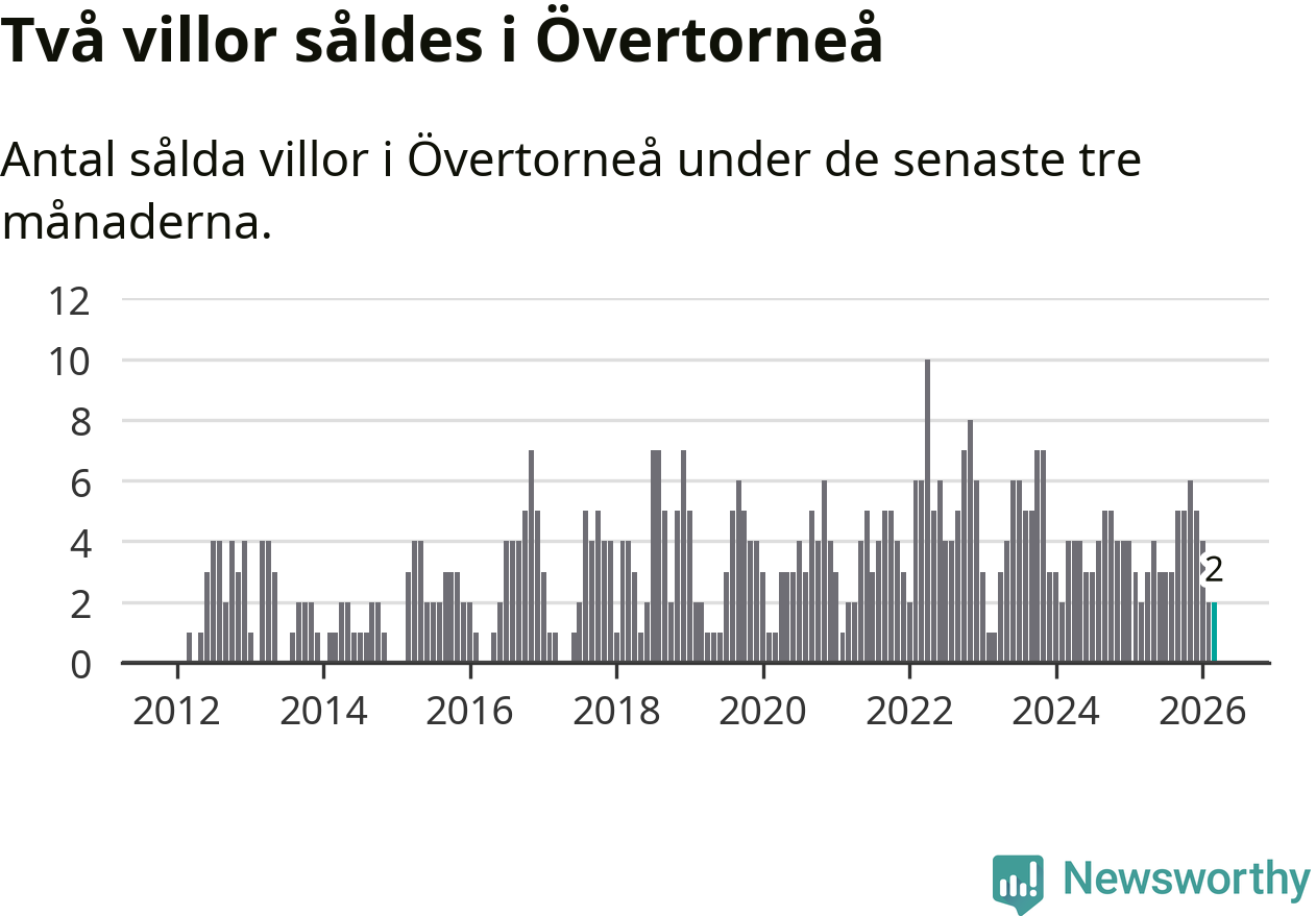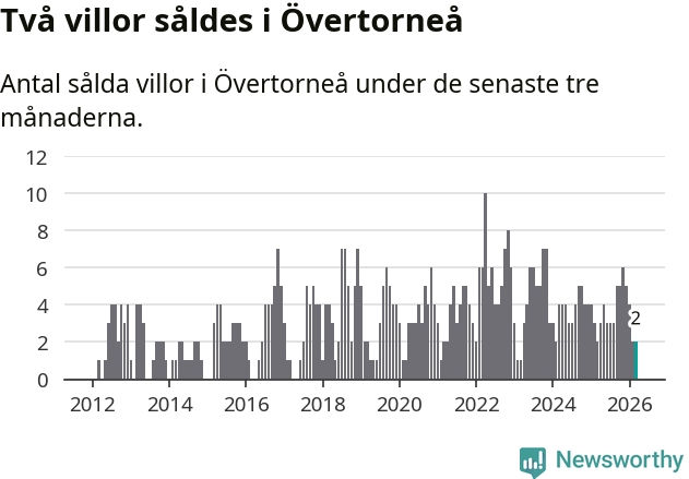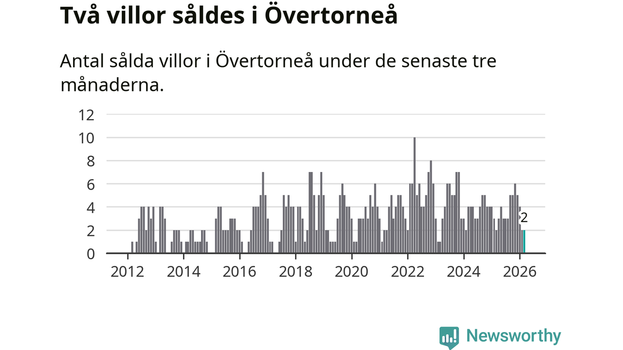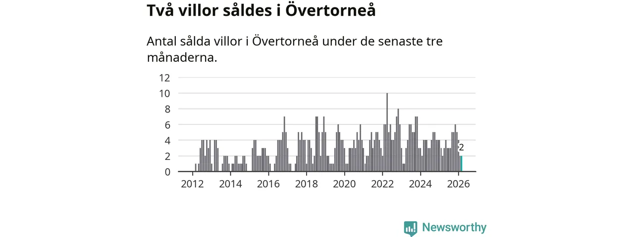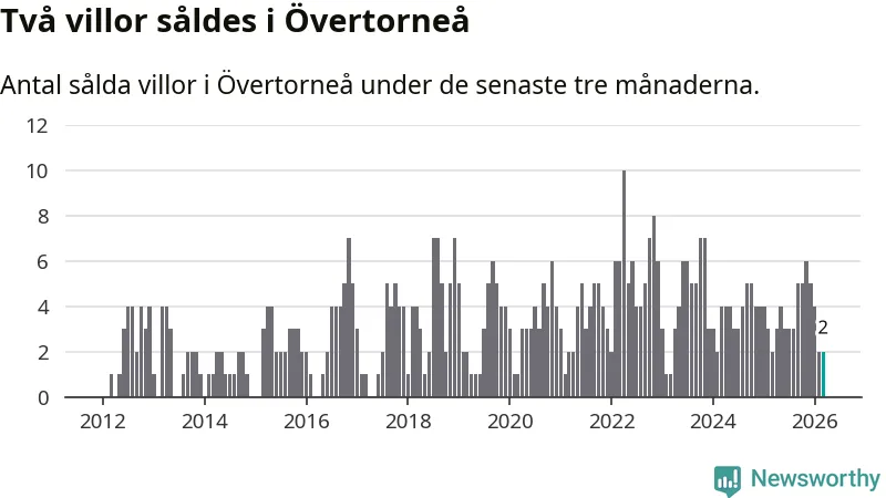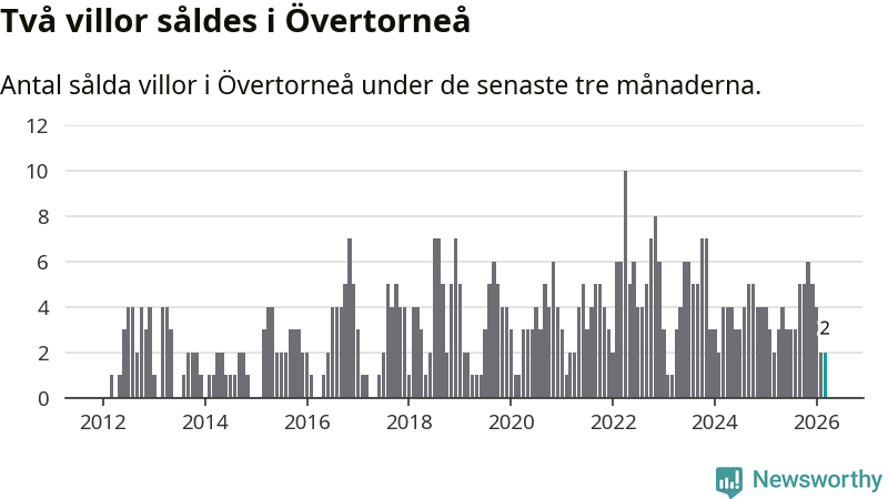 Mellan januari och mars gjordes sammanlagt två affärer med villor i Övertorneå kommun. Det är lika många affärer som vid motsvarande tid i fjol.