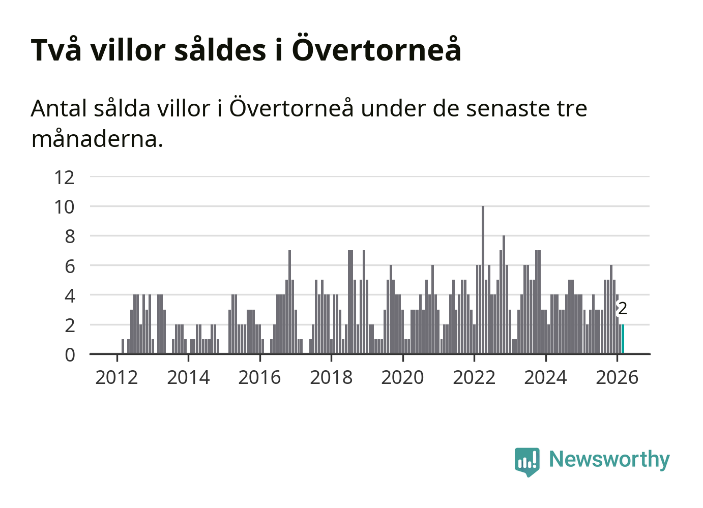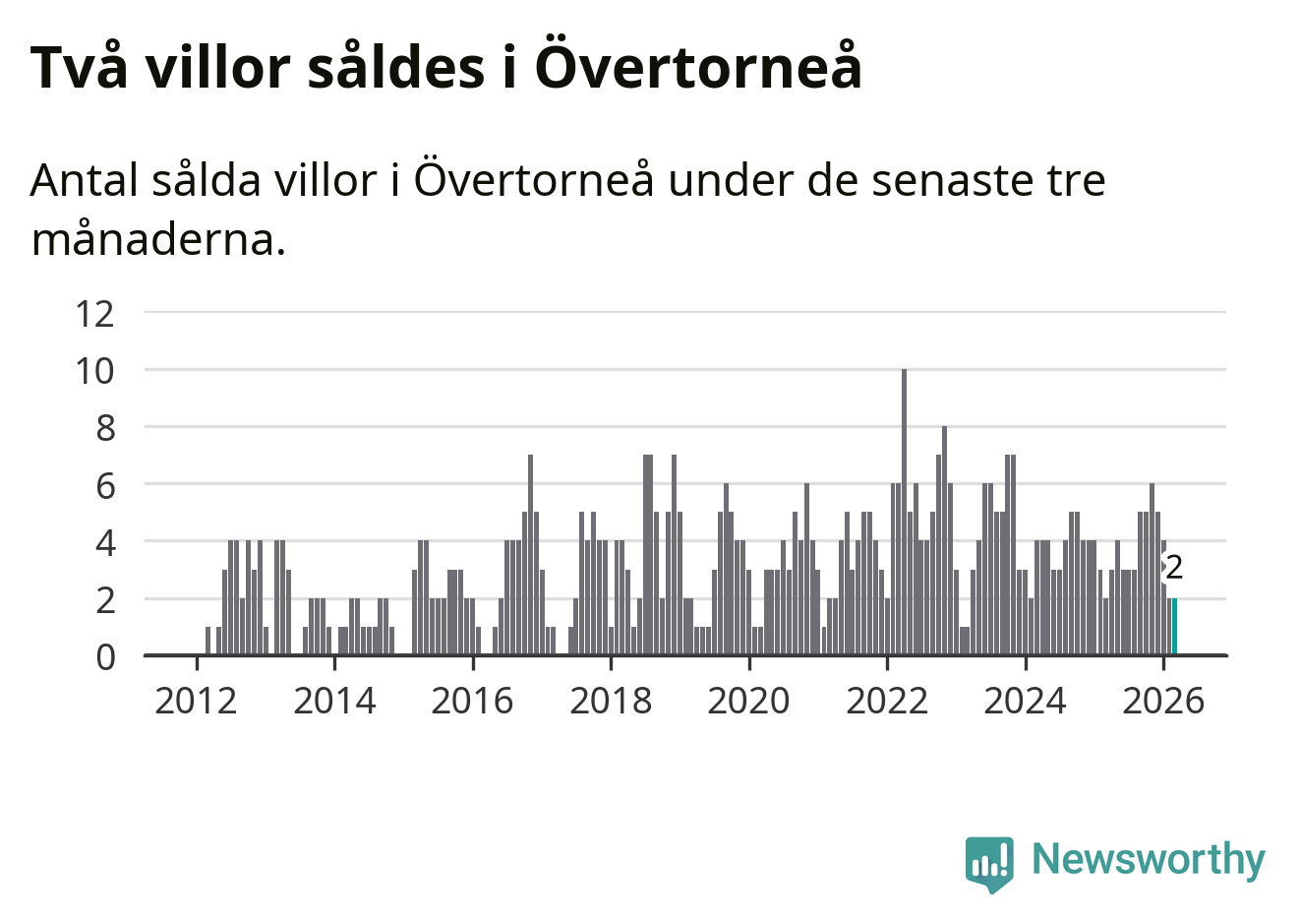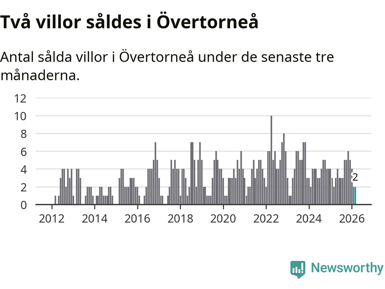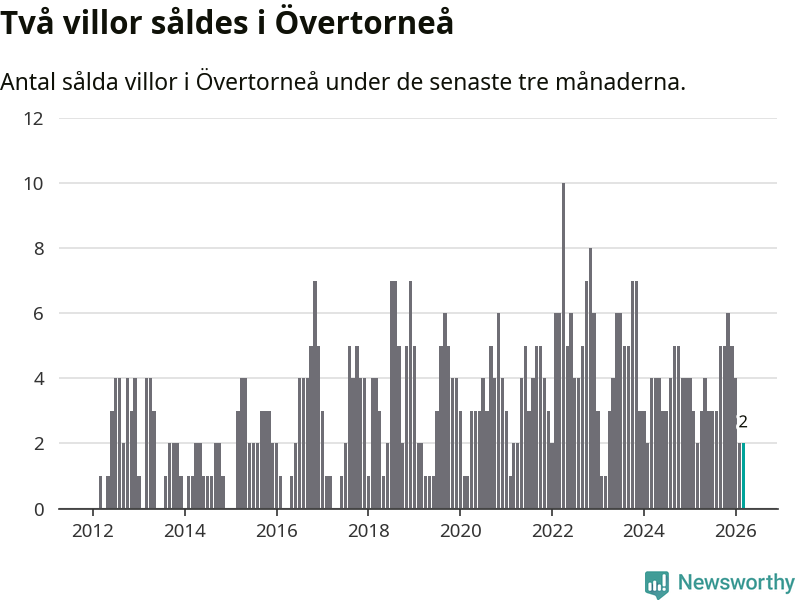 Mellan januari och mars gjordes sammanlagt två affärer med villor i Övertorneå kommun. Det är lika många affärer som vid motsvarande tid i fjol.