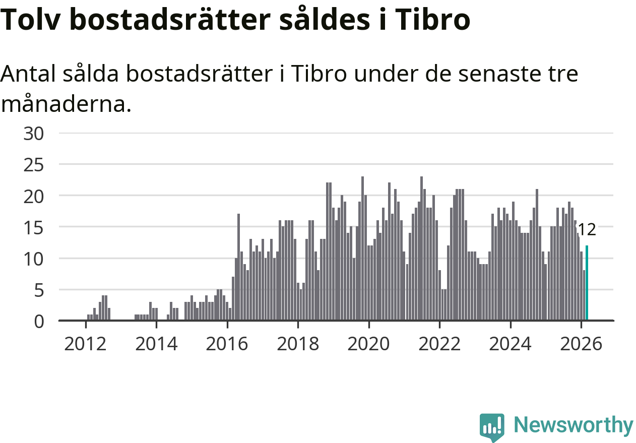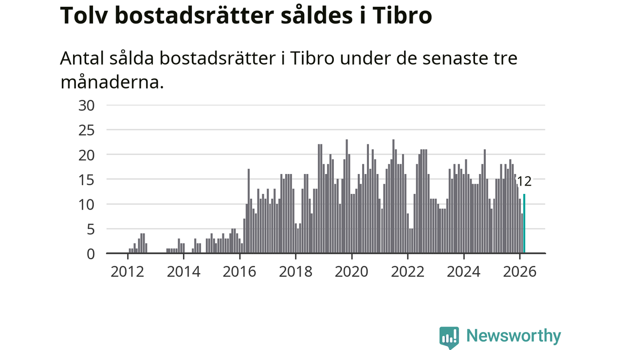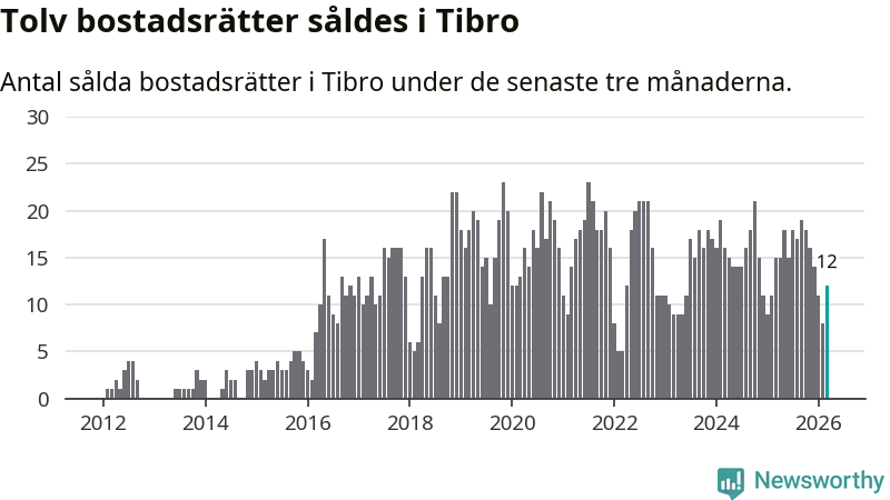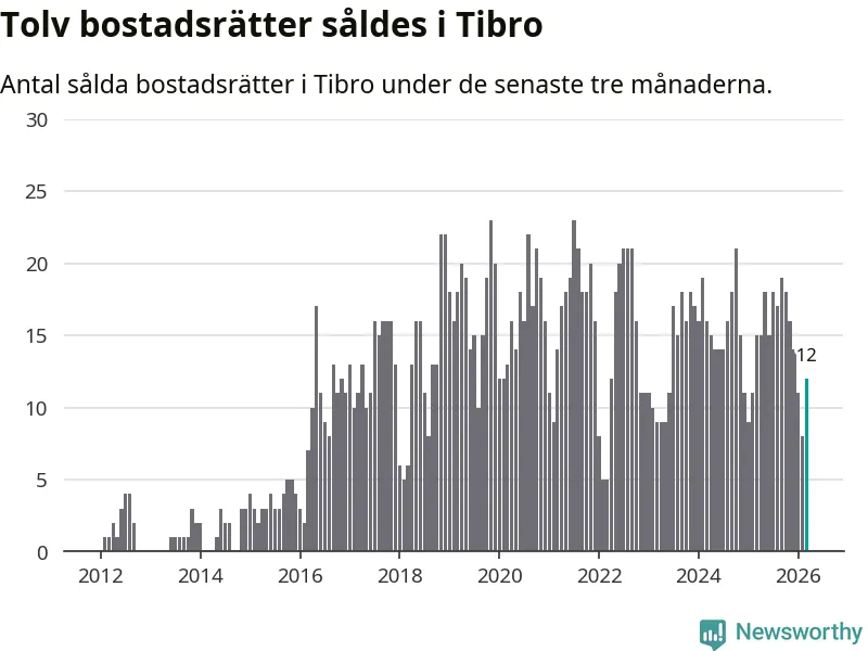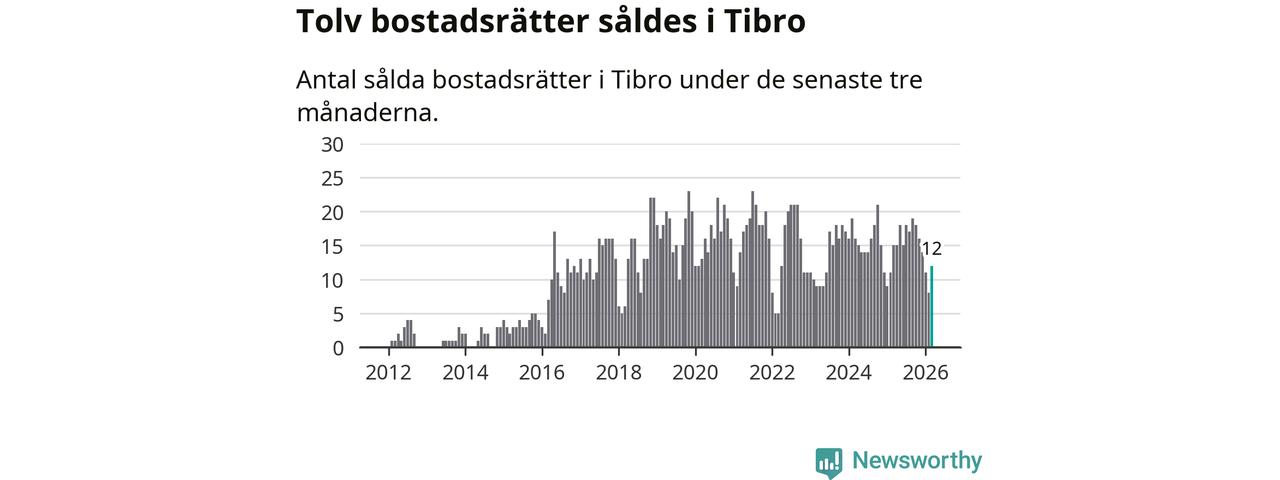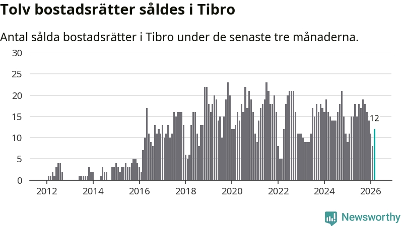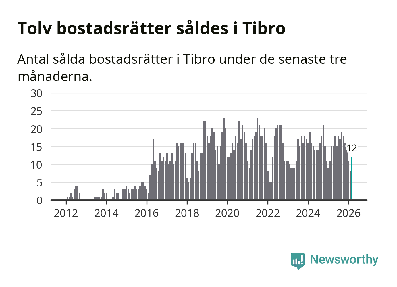 Mellan januari och mars gjordes sammanlagt tolv affärer med bostadsrätter i Tibro kommun. Det kan jämföras med 15 vid motsvarande tid i fjol.