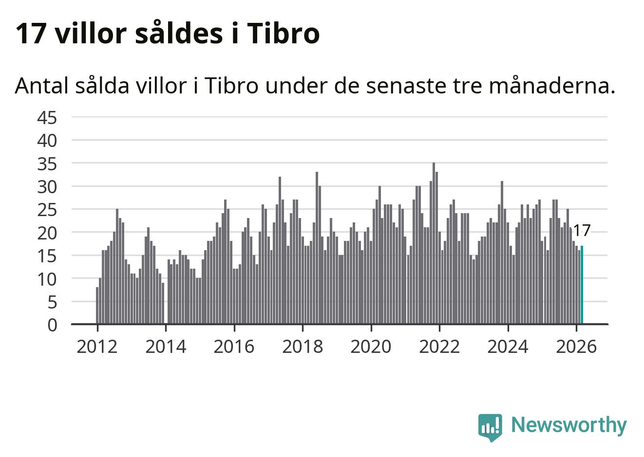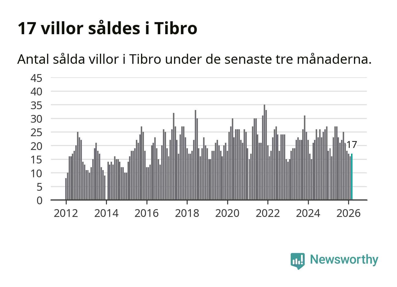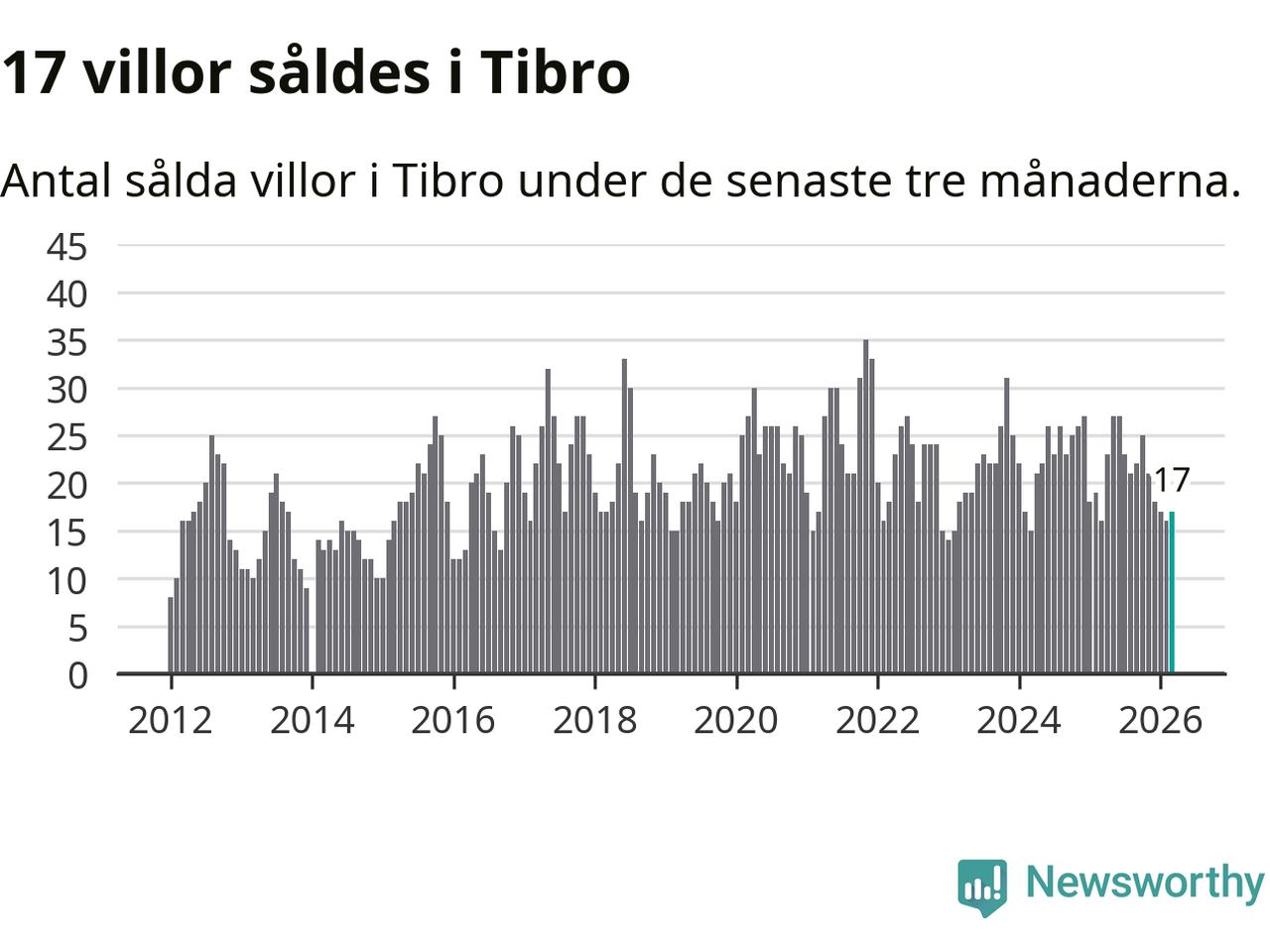 Mellan januari och mars gjordes sammanlagt 17 affärer med villor i Tibro kommun. Det kan jämföras med 16 vid motsvarande tid i fjol.