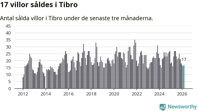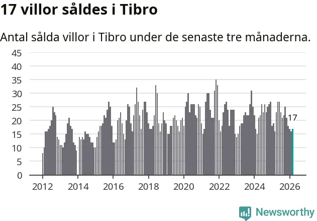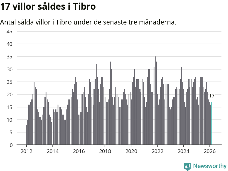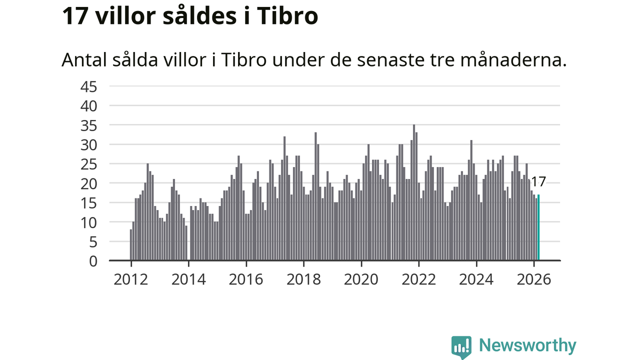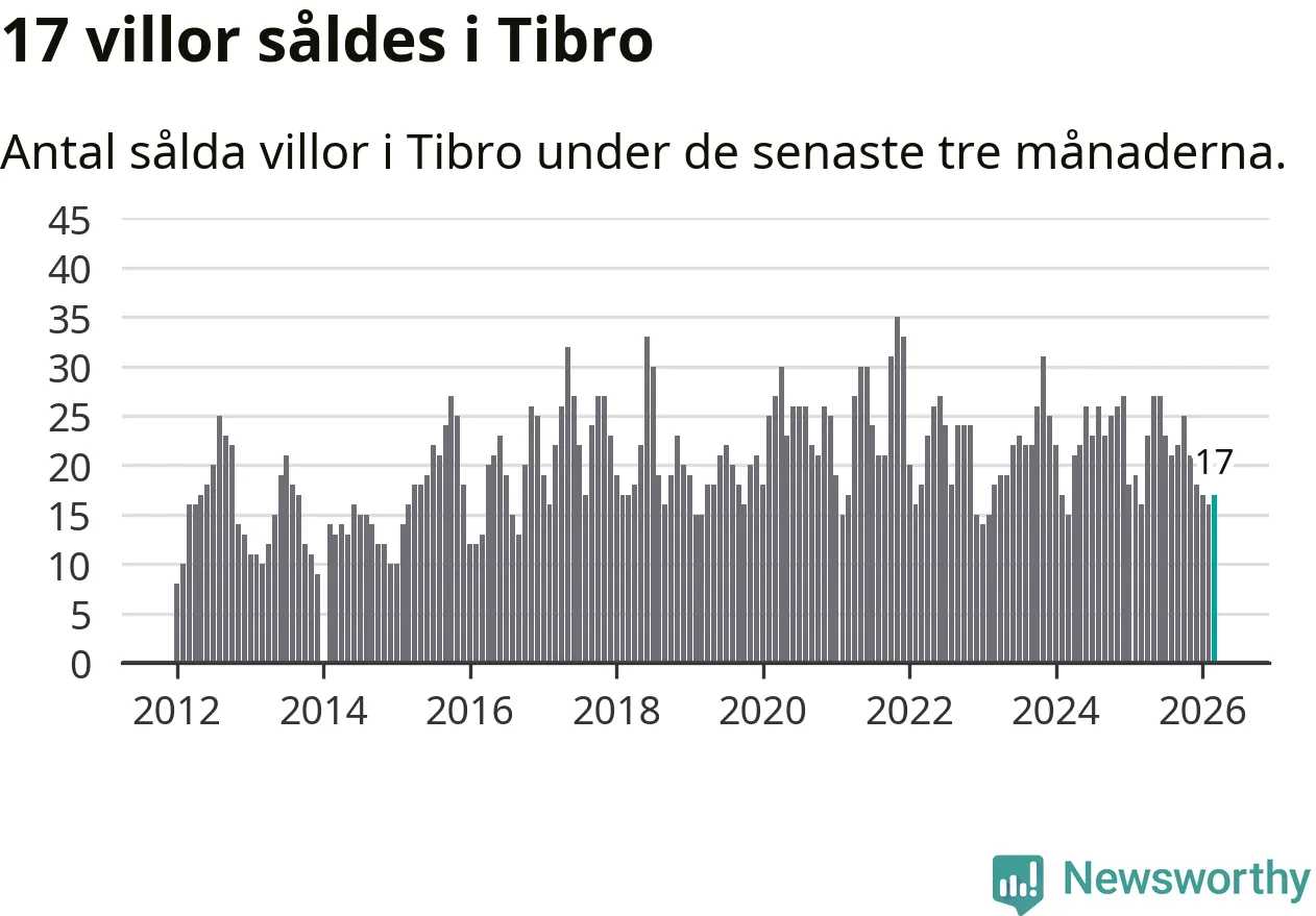 Mellan januari och mars gjordes sammanlagt 17 affärer med villor i Tibro kommun. Det kan jämföras med 16 vid motsvarande tid i fjol.