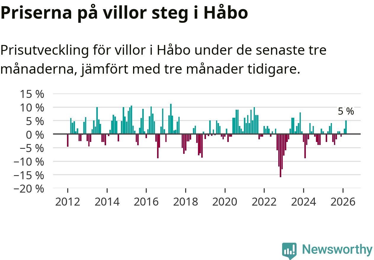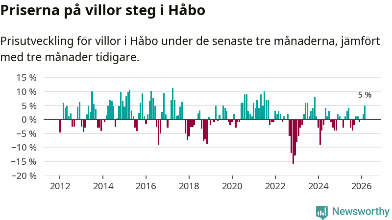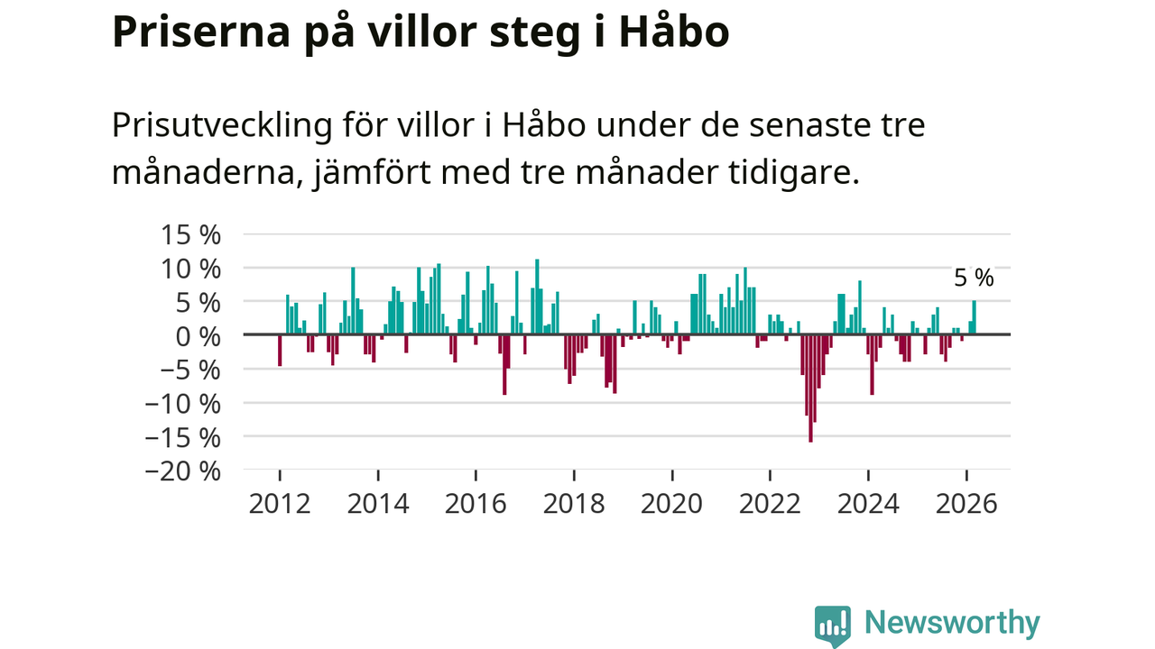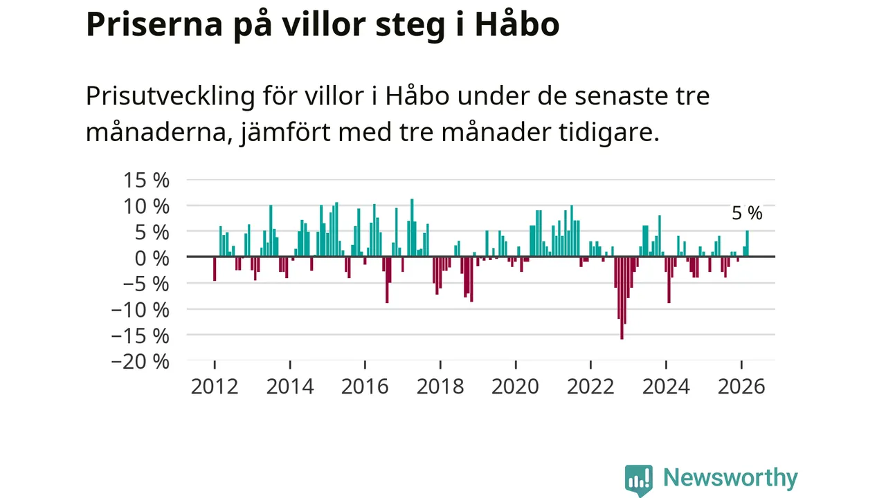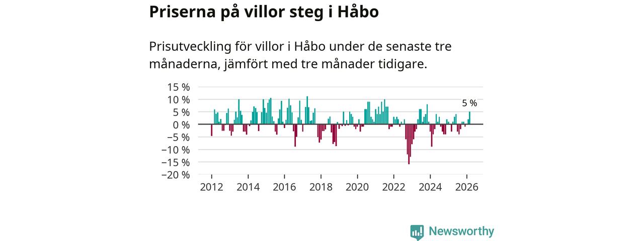 Villapriserna har gått upp i Håbo kommun. Medelpriset på försäljningarna under de senaste tre månaderna visar på en uppgång med 5 procent.
