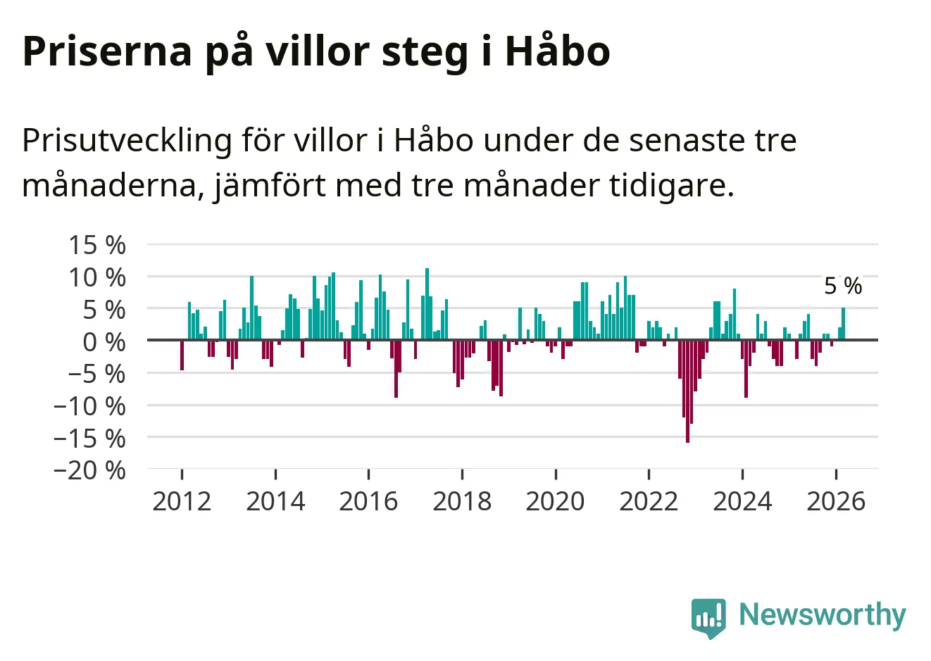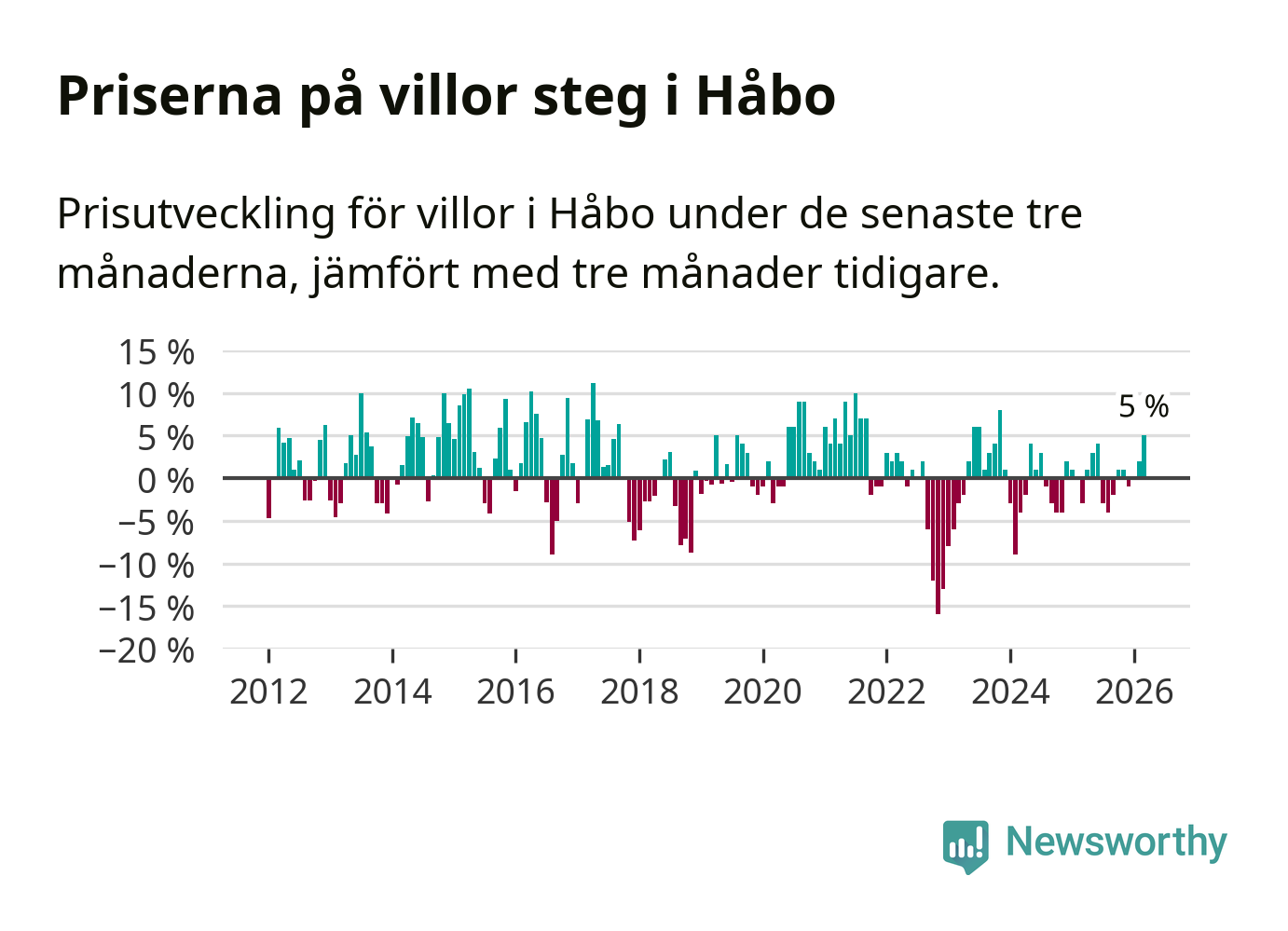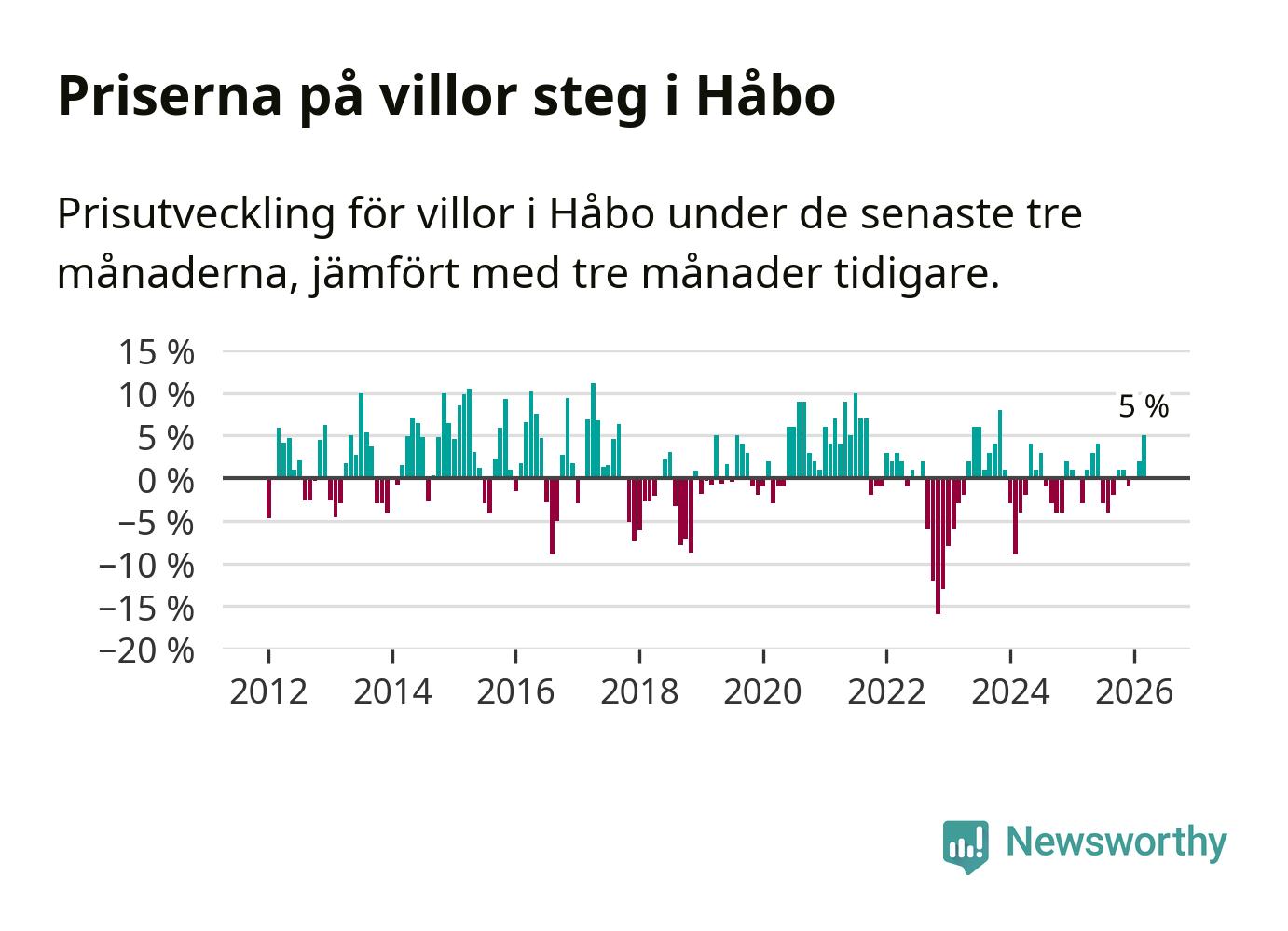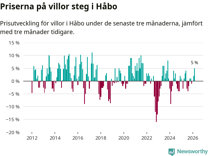 Villapriserna har gått upp i Håbo kommun. Medelpriset på försäljningarna under de senaste tre månaderna visar på en uppgång med 5 procent.