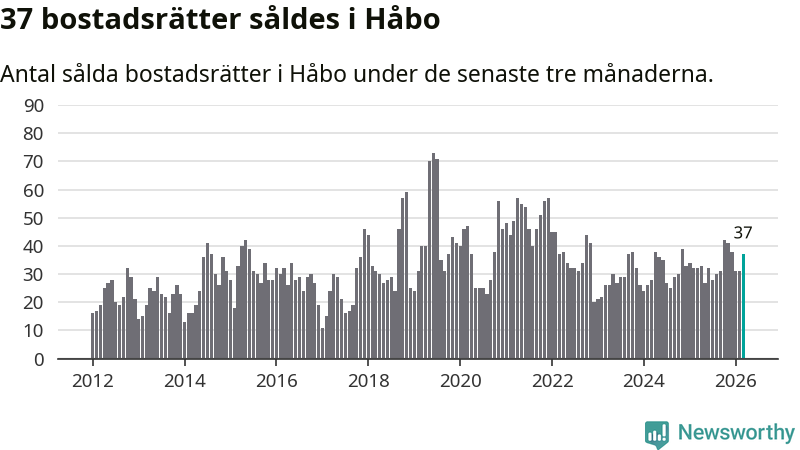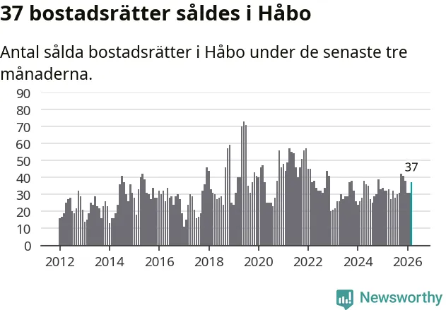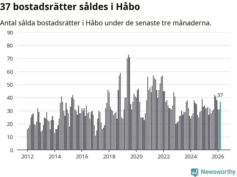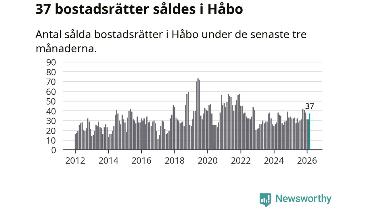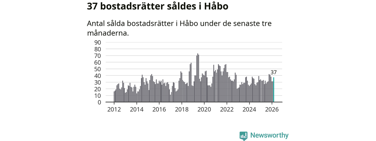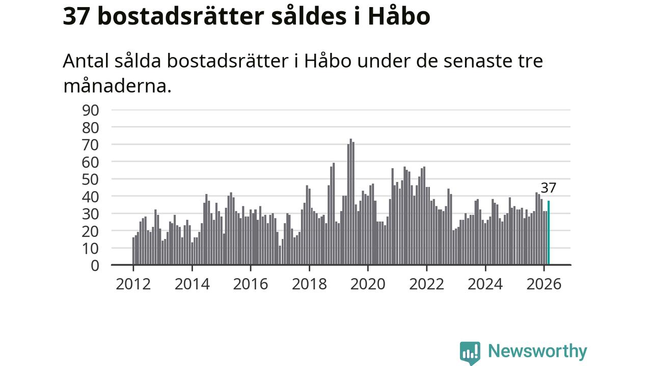 Sammanlagt såldes 37 bostadsrätter i Håbo kommun mellan januari och mars till ett genomsnittligt pris på 2,0 miljoner kronor. I fjol gjordes 32 affärer vid den här tiden på året.