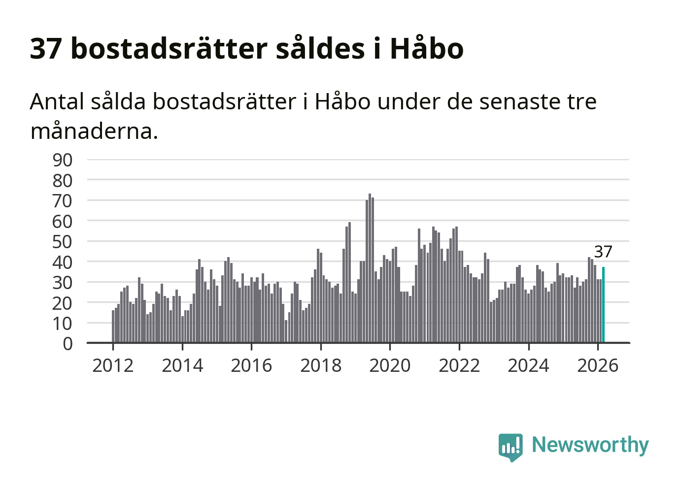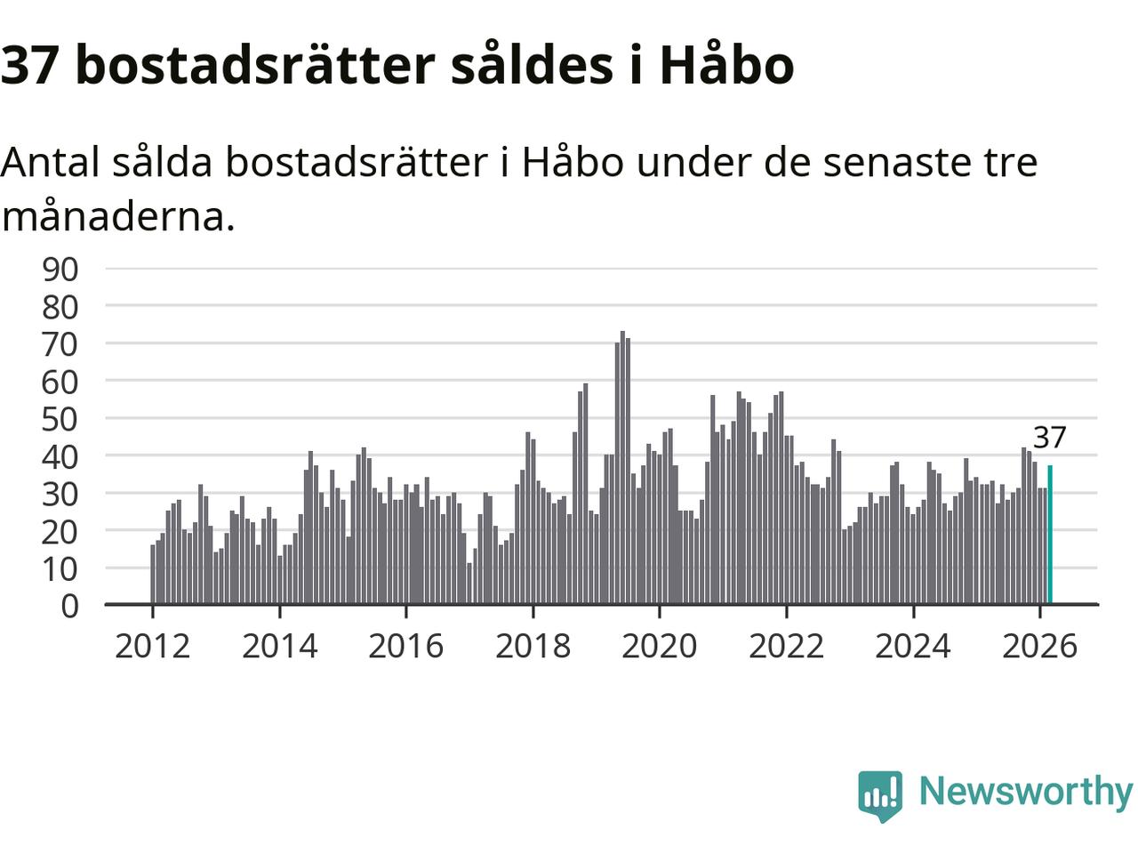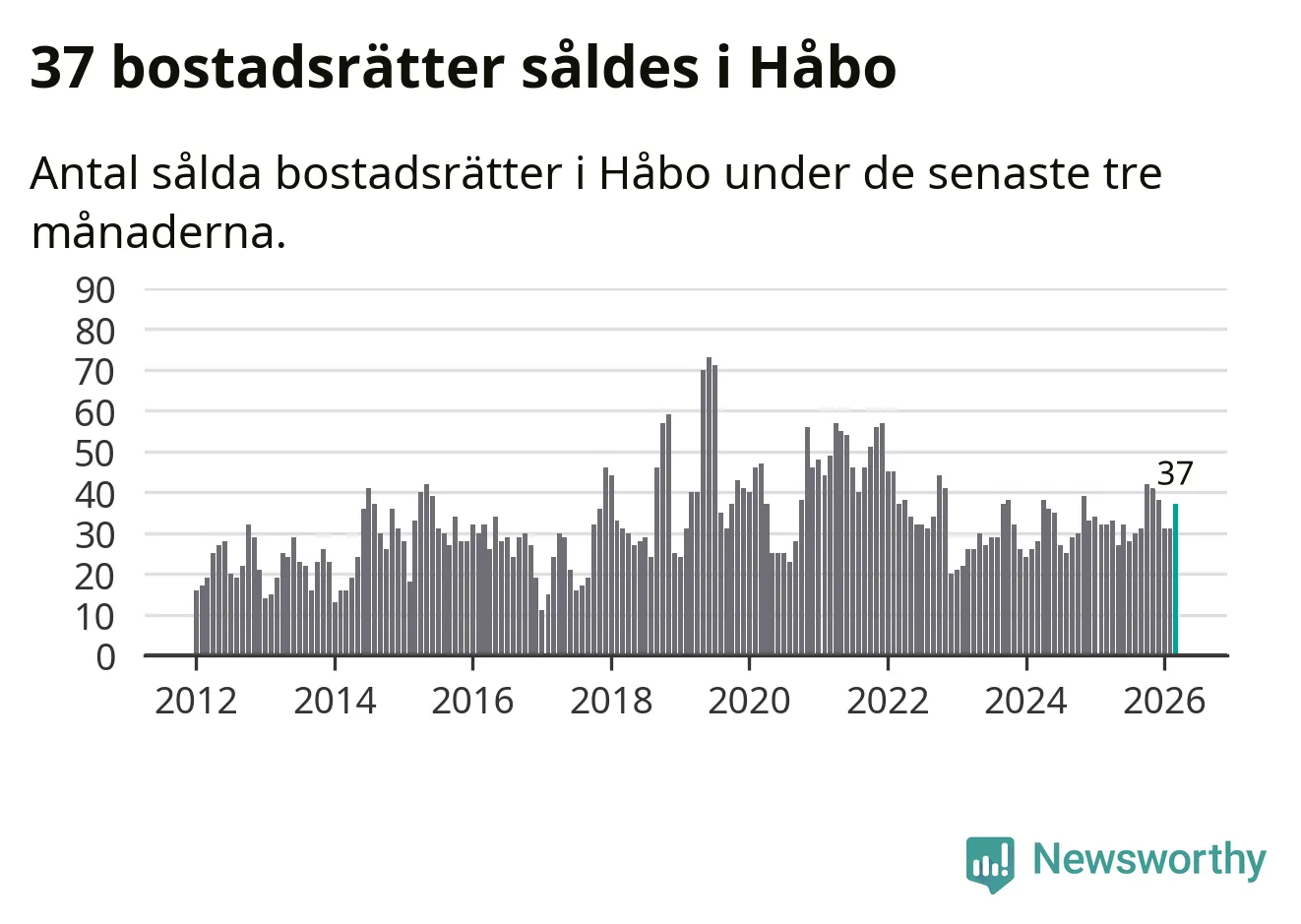 Sammanlagt såldes 37 bostadsrätter i Håbo kommun mellan januari och mars till ett genomsnittligt pris på 2,0 miljoner kronor. I fjol gjordes 32 affärer vid den här tiden på året.
