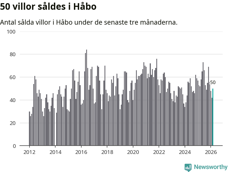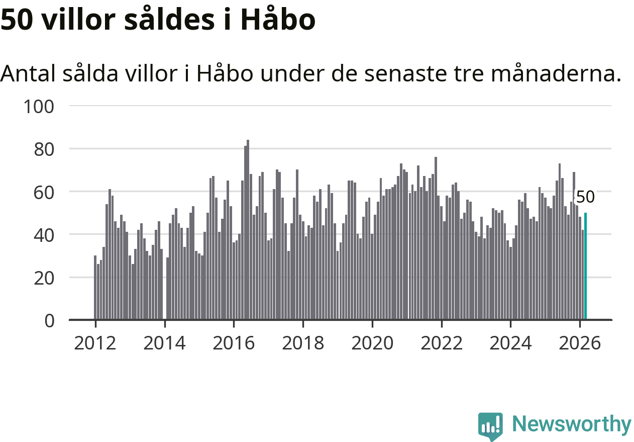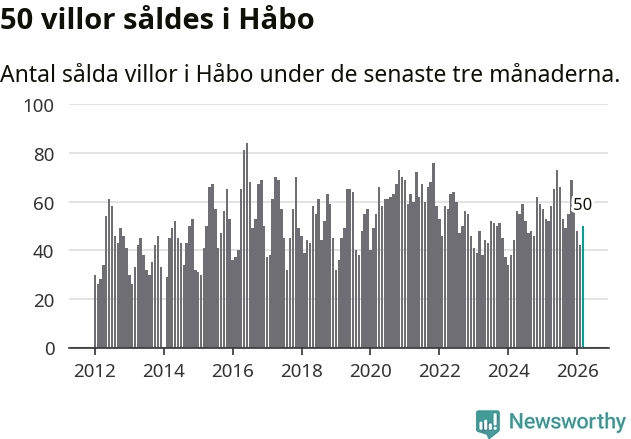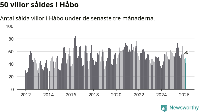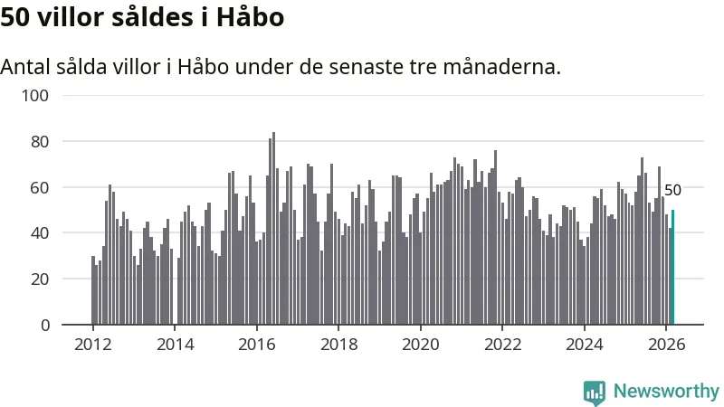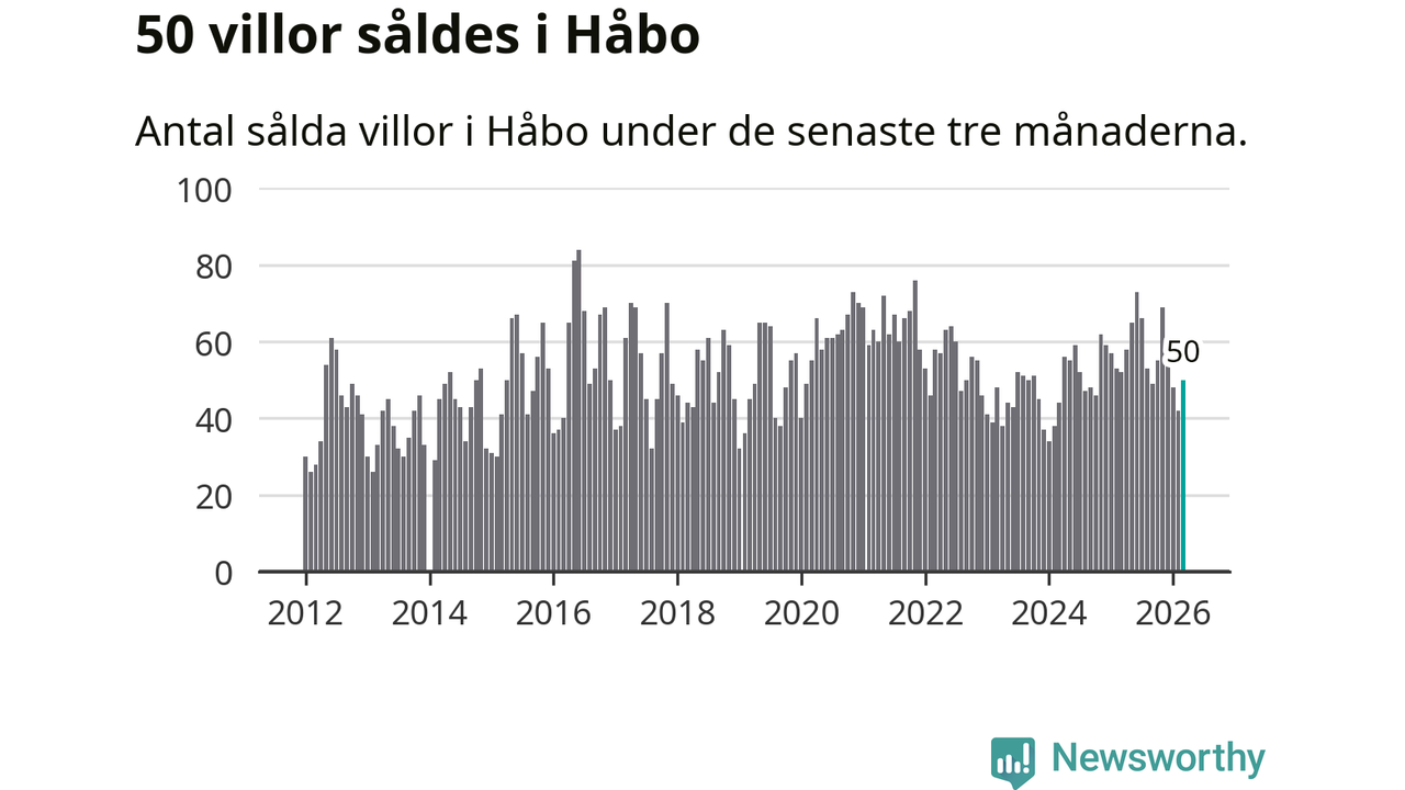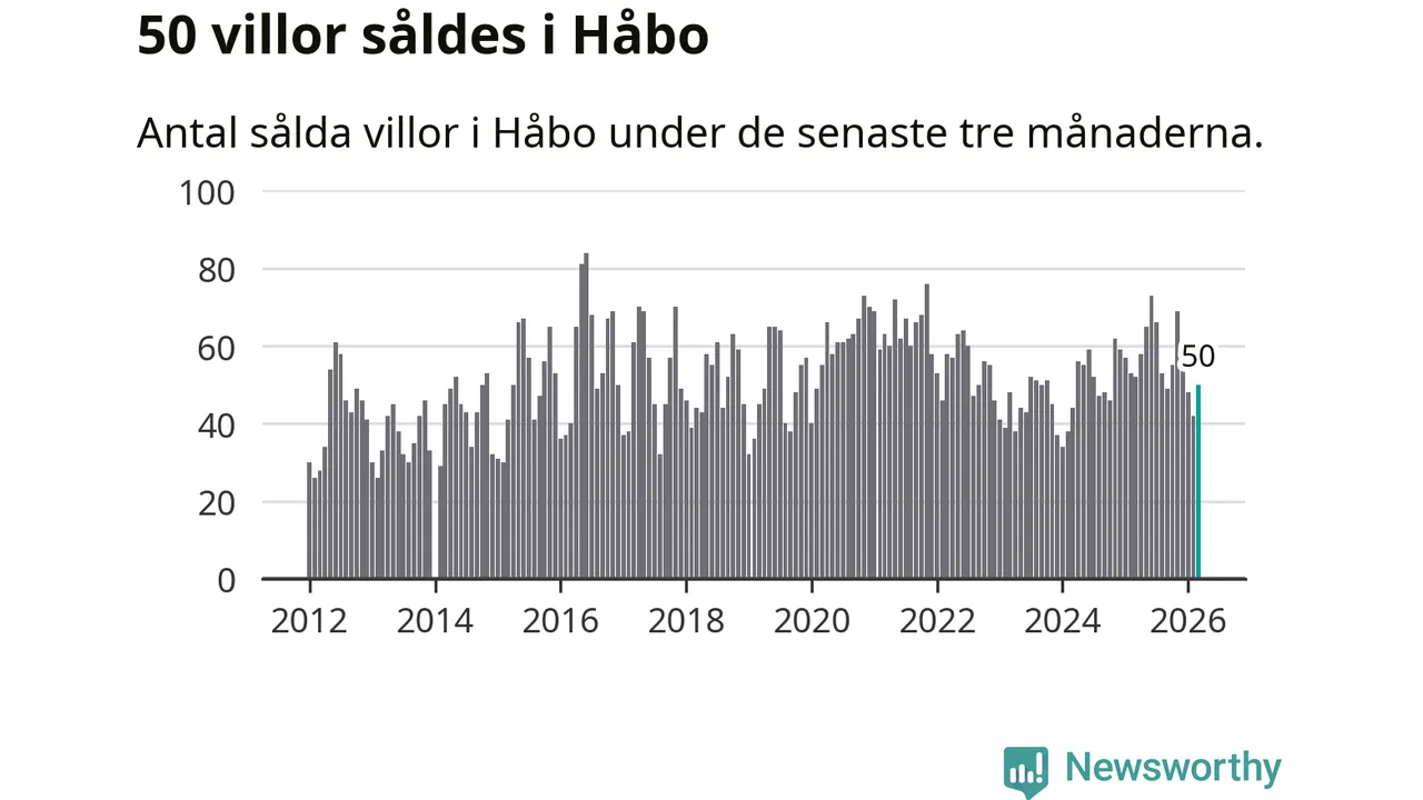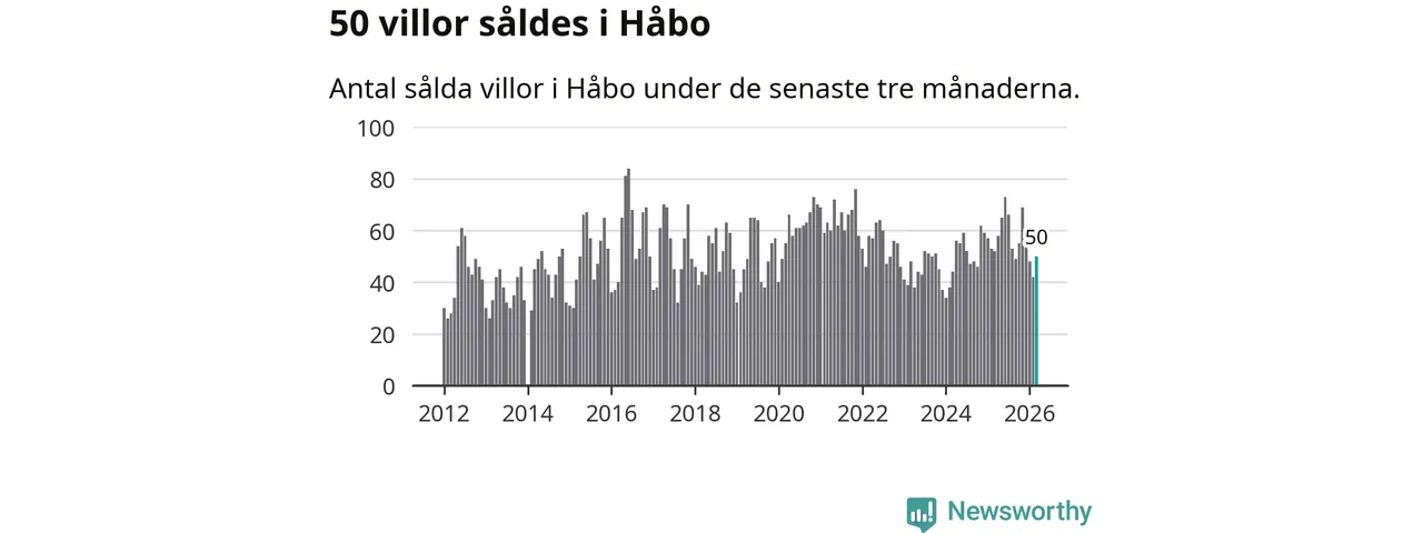 Sammanlagt såldes 50 villor i Håbo kommun mellan januari och mars till ett genomsnittligt pris på 4,4 miljoner kronor. I fjol gjordes 52 affärer vid den här tiden på året.