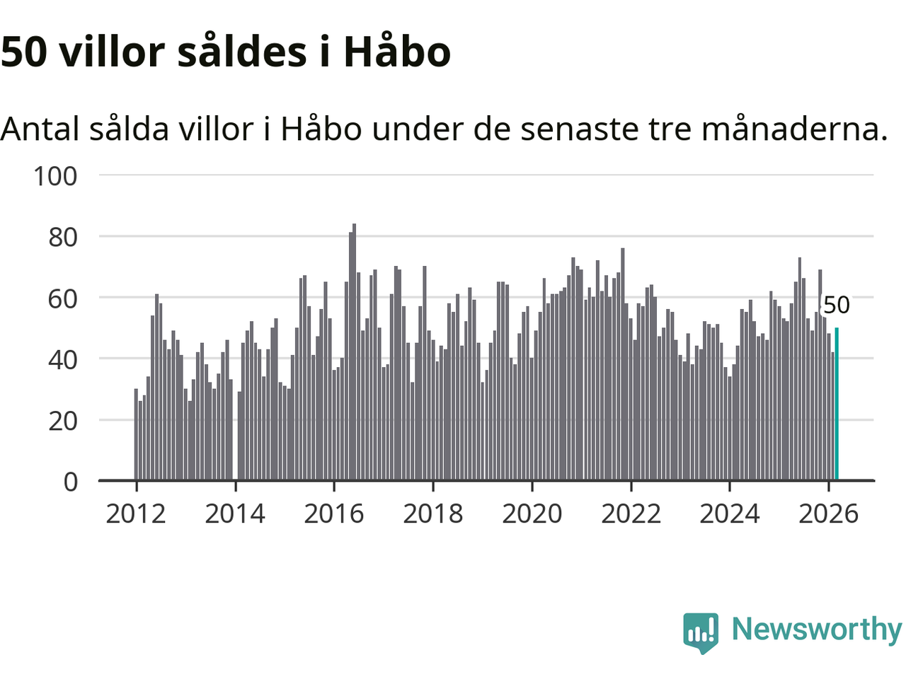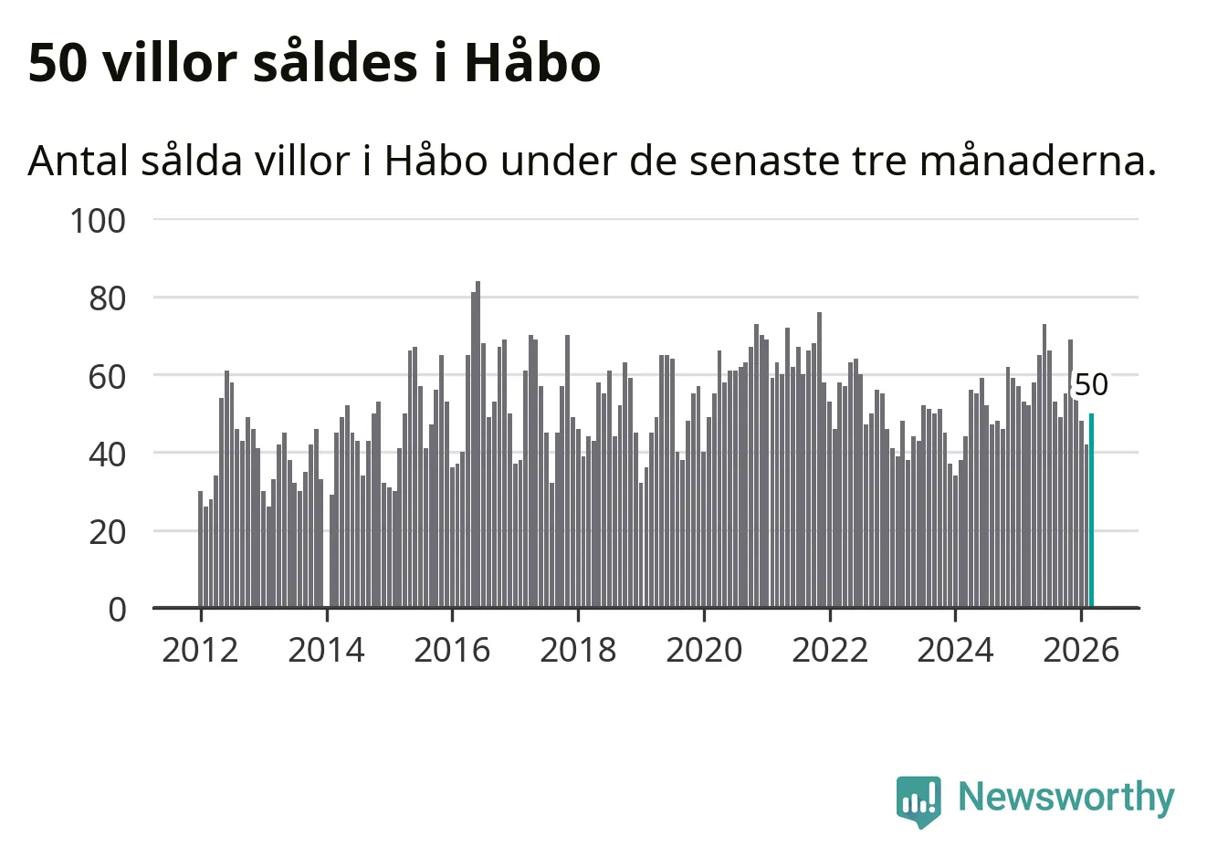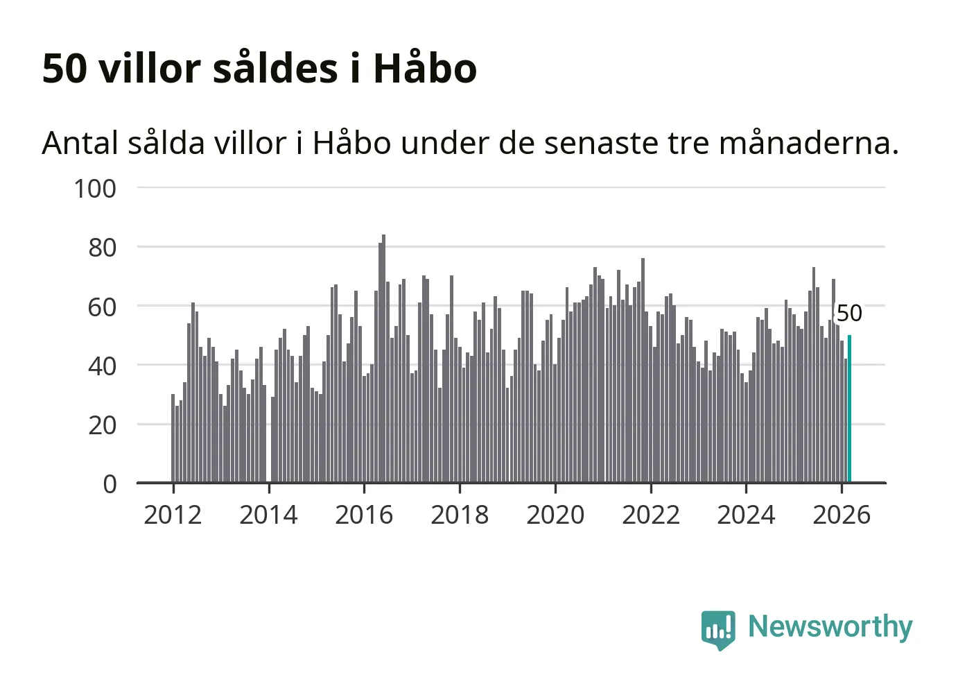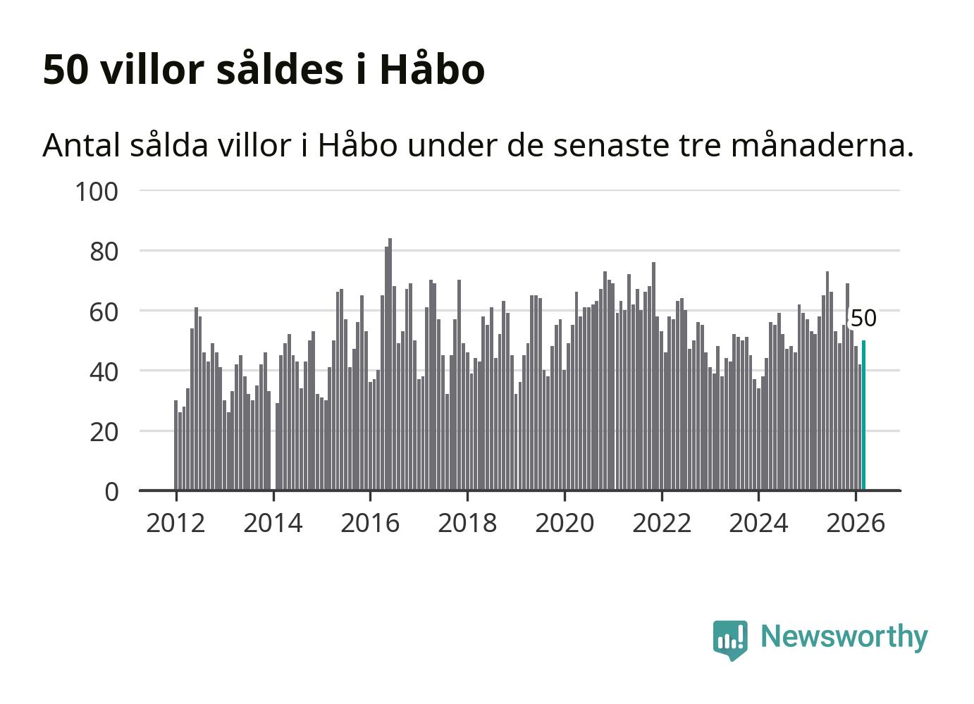 Sammanlagt såldes 50 villor i Håbo kommun mellan januari och mars till ett genomsnittligt pris på 4,4 miljoner kronor. I fjol gjordes 52 affärer vid den här tiden på året.