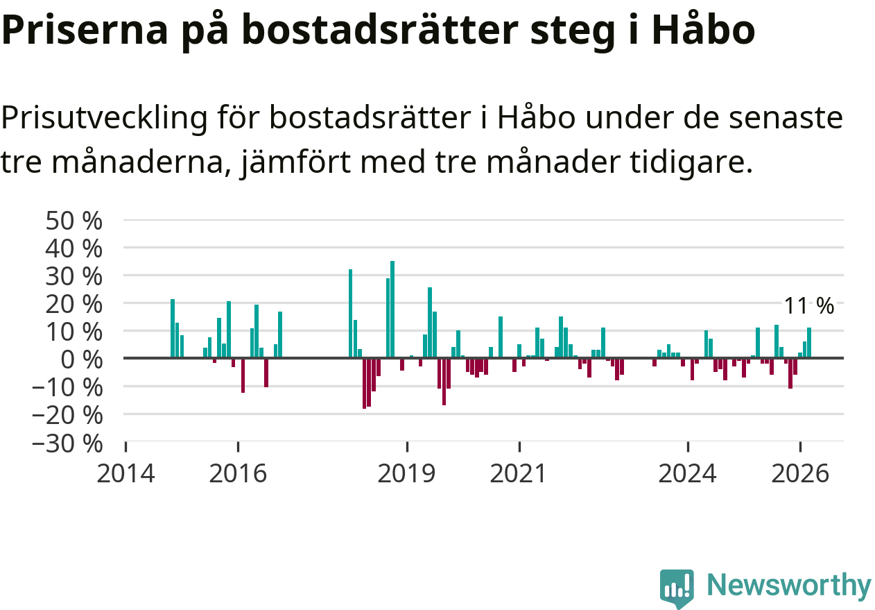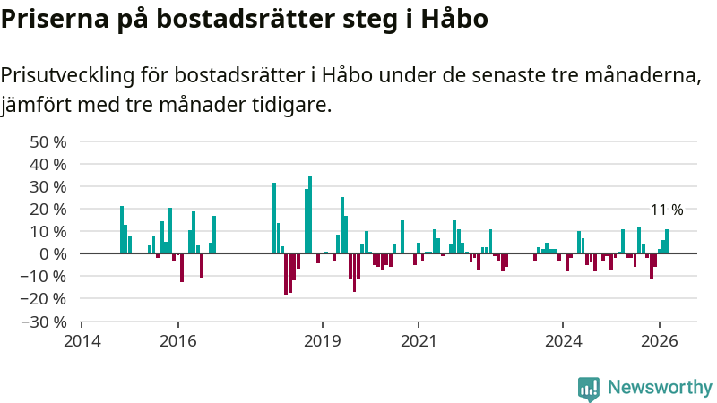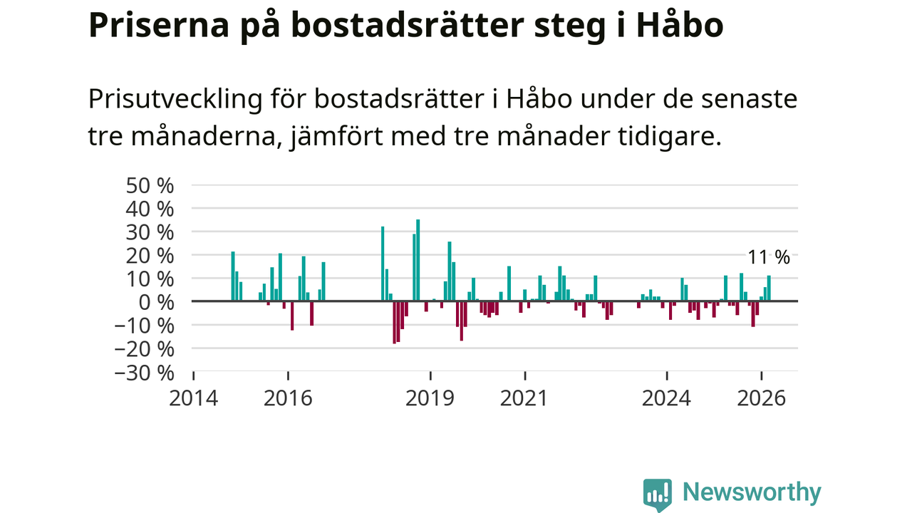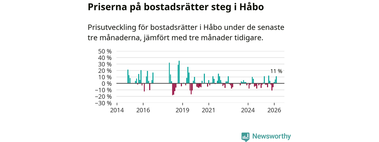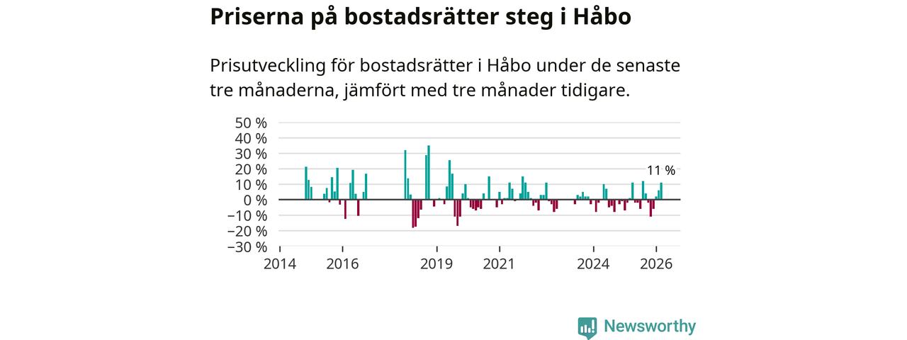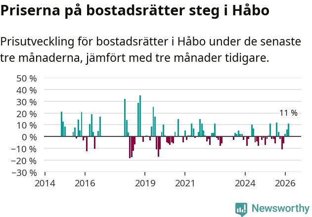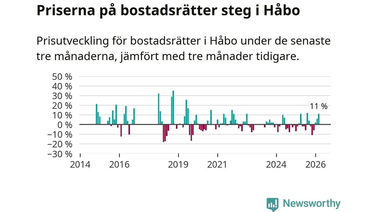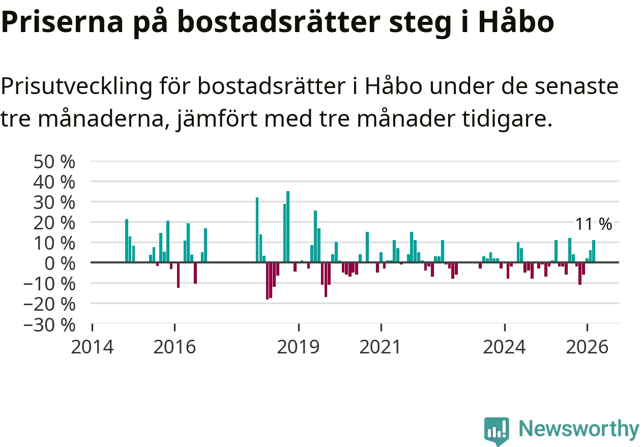 Priserna på bostadsrätter har gått upp i Håbo kommun. Medelpriset på försäljningarna under de senaste tre månaderna visar på en uppgång med 11 procent.