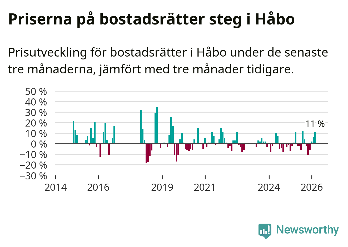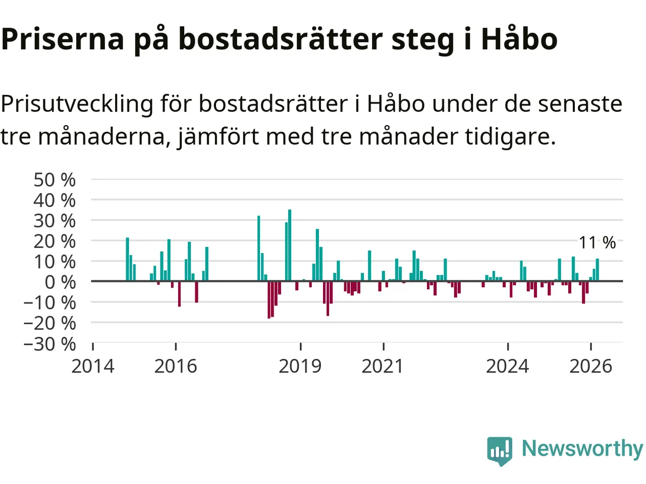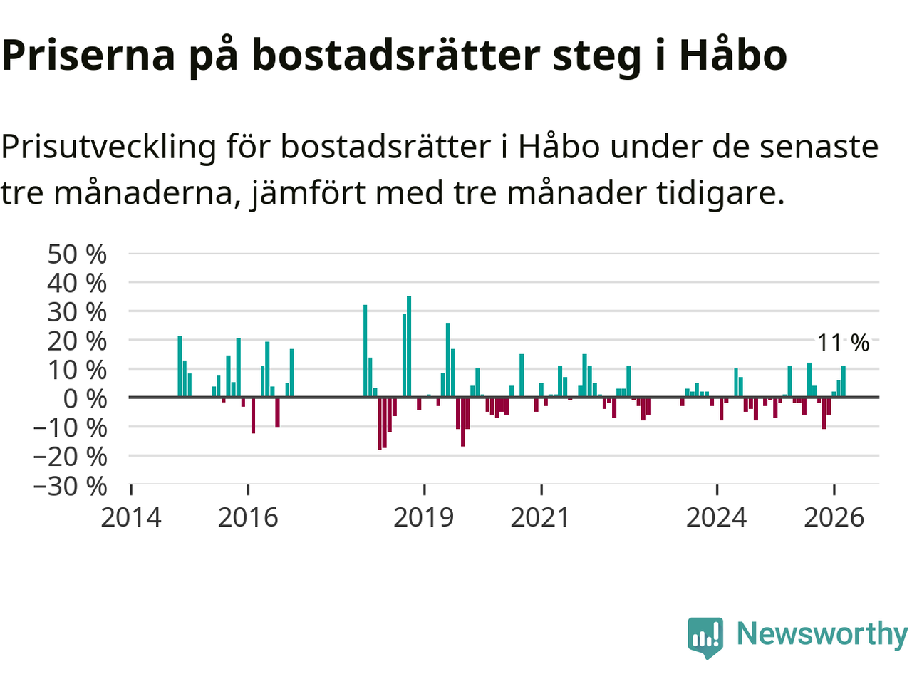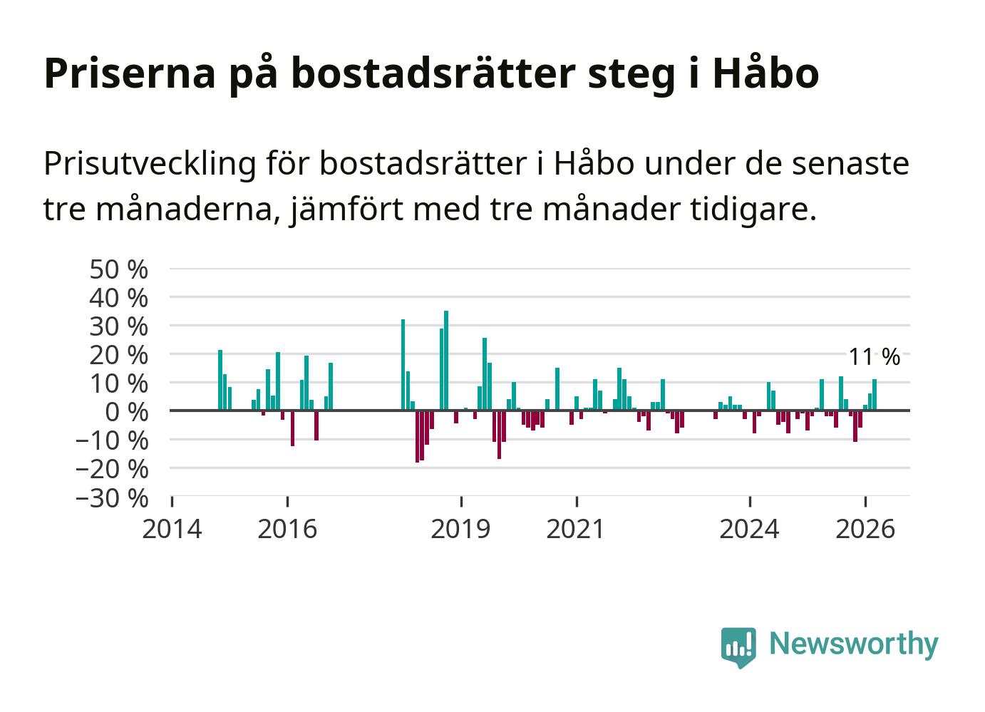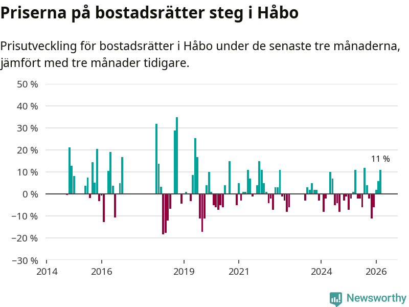 Priserna på bostadsrätter har gått upp i Håbo kommun. Medelpriset på försäljningarna under de senaste tre månaderna visar på en uppgång med 11 procent.
