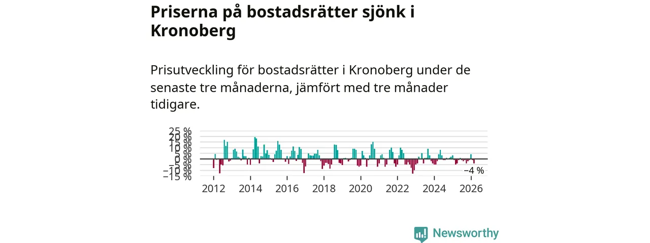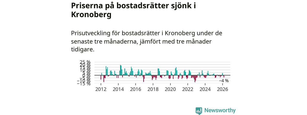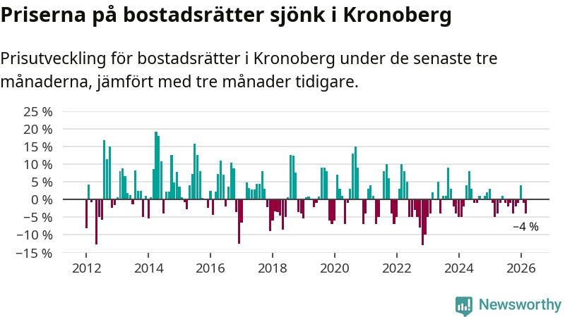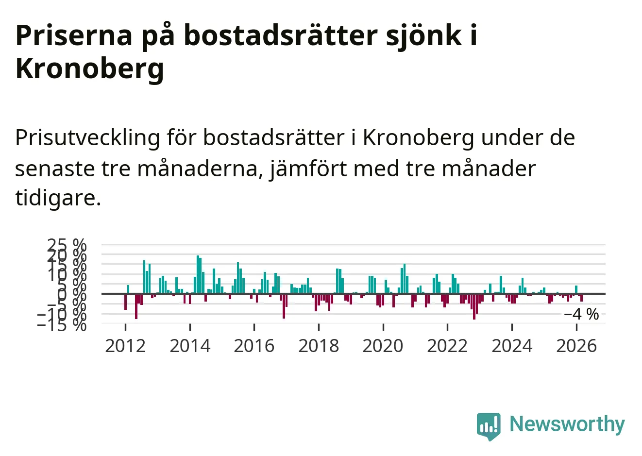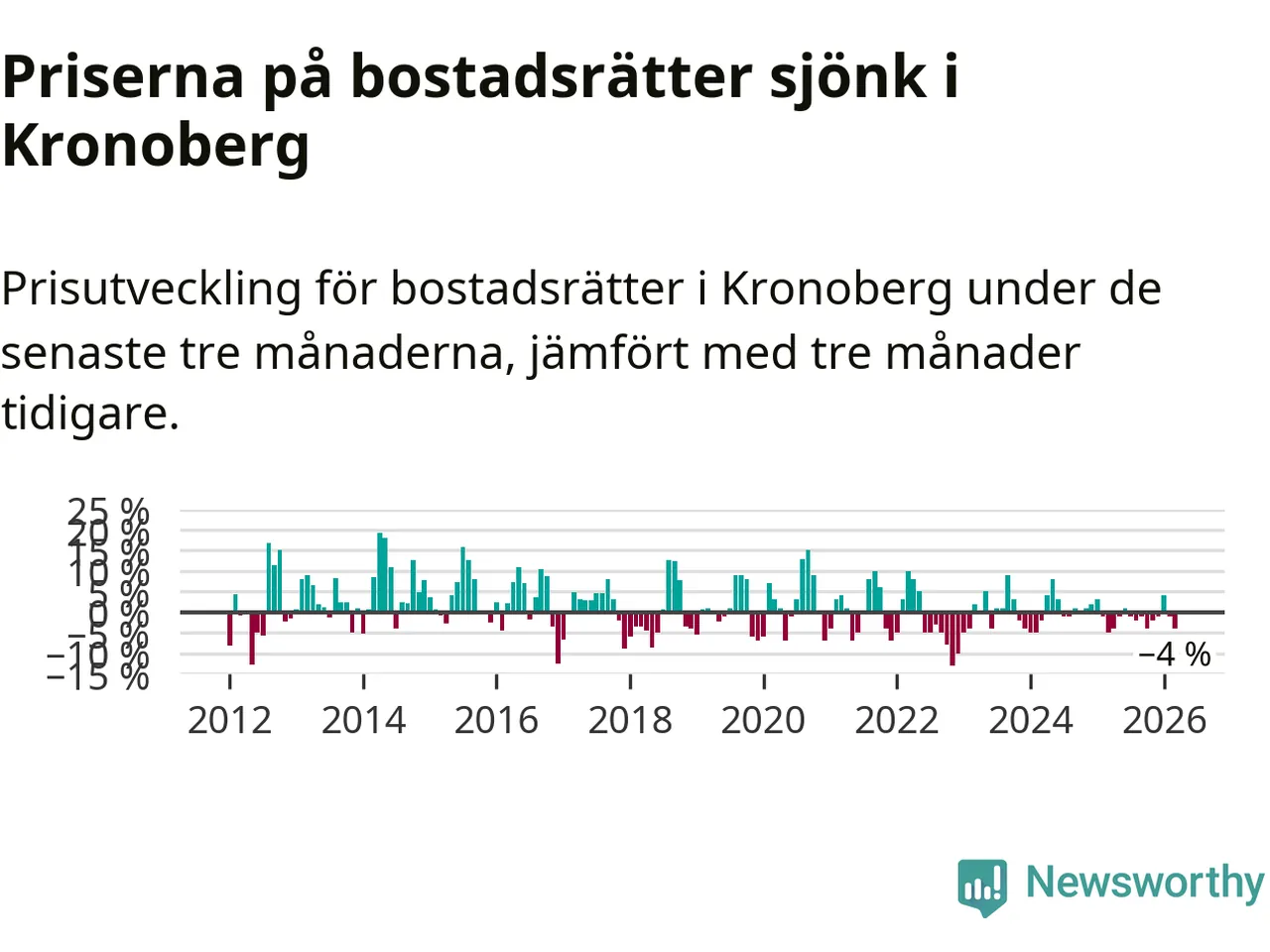 Priserna på bostadsrätter har gått ner i Kronobergs län. Medelpriset på försäljningarna under de senaste tre månaderna visar på en nedgång med 4 procent.