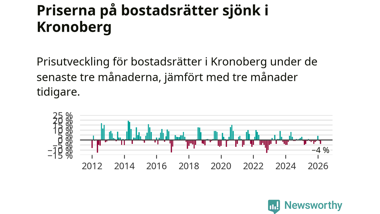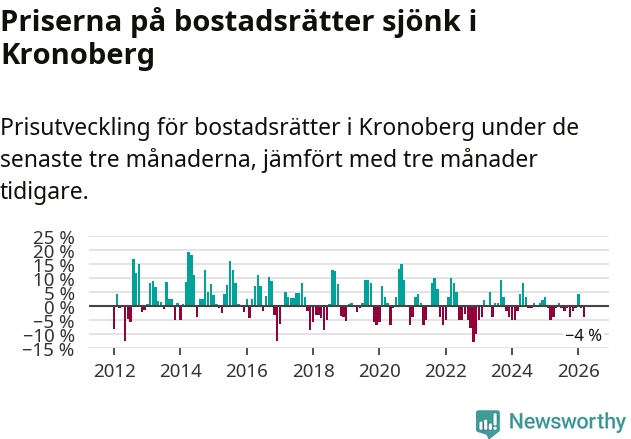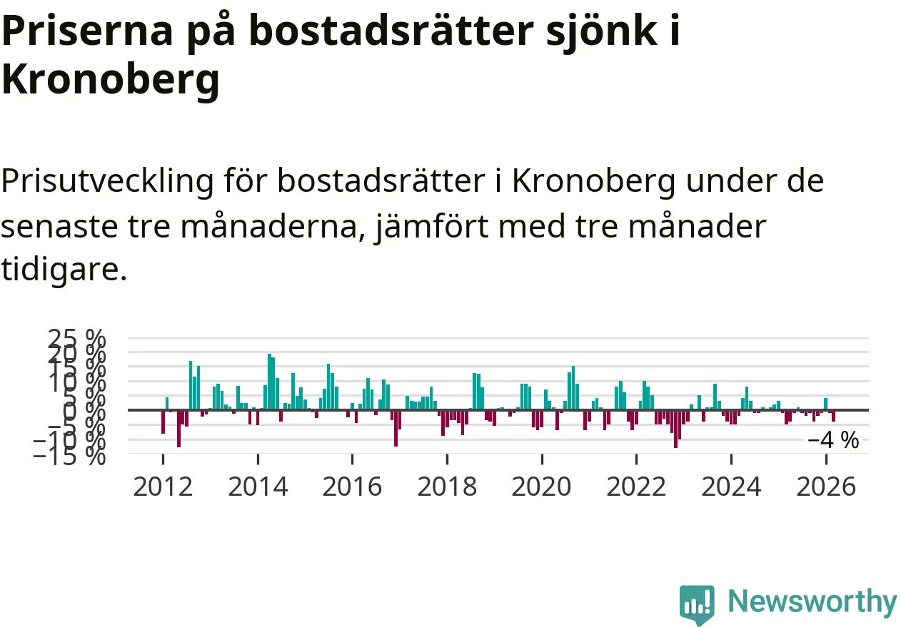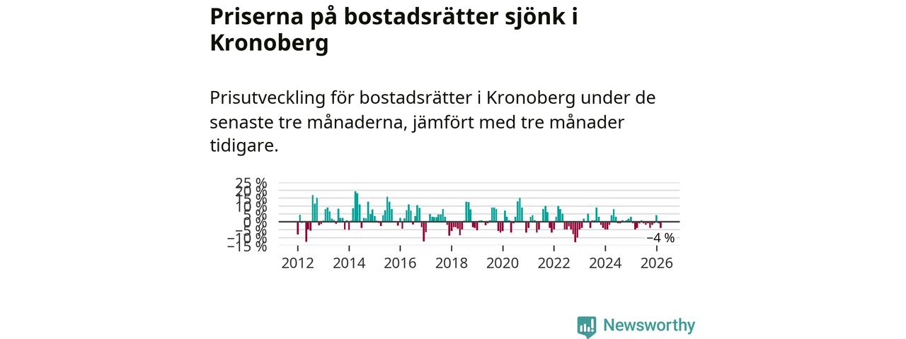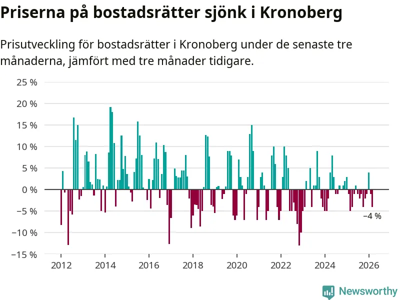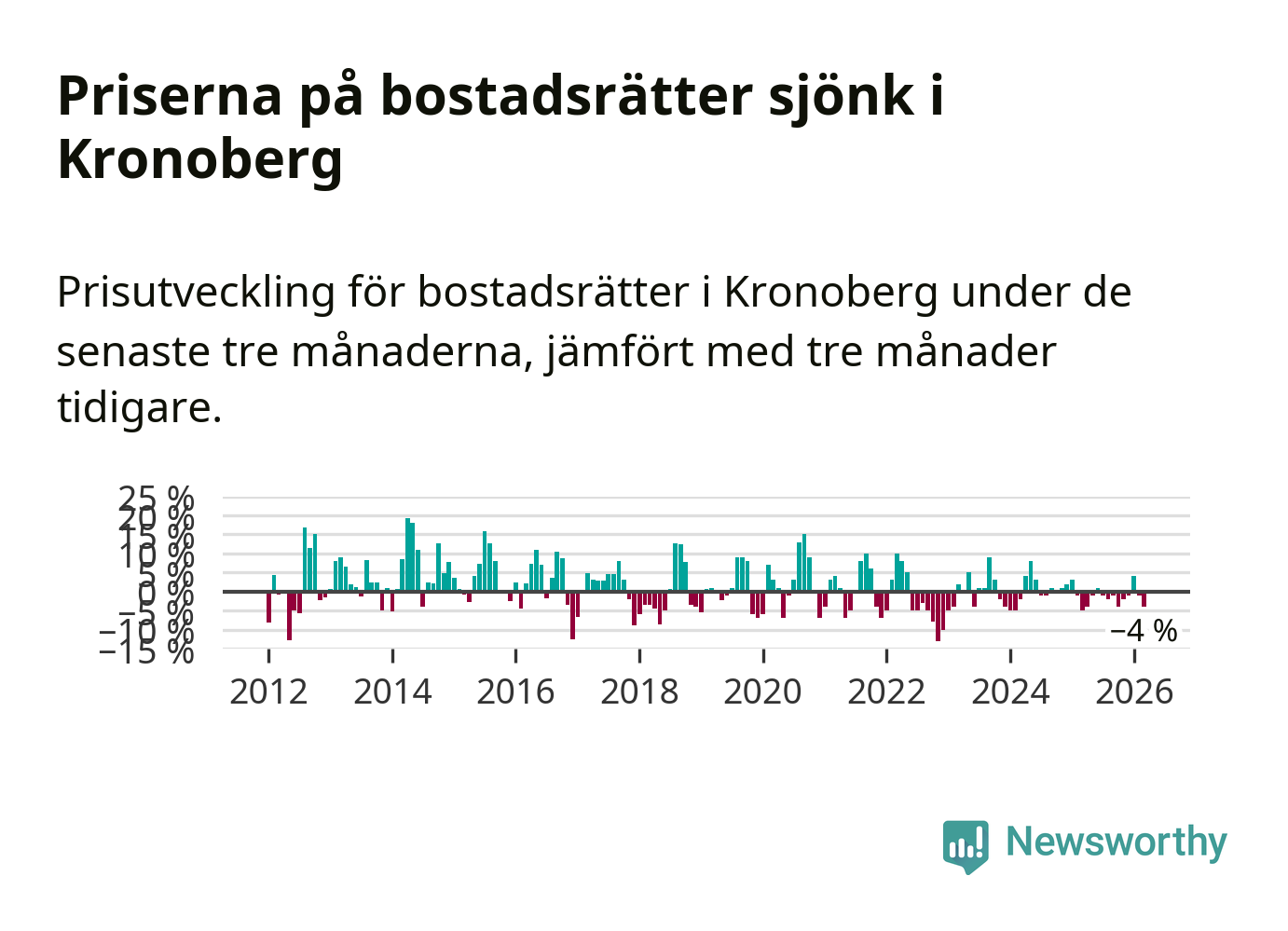 Priserna på bostadsrätter har gått ner i Kronobergs län. Medelpriset på försäljningarna under de senaste tre månaderna visar på en nedgång med 4 procent.