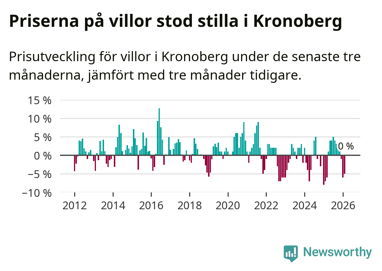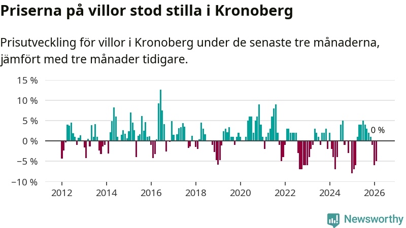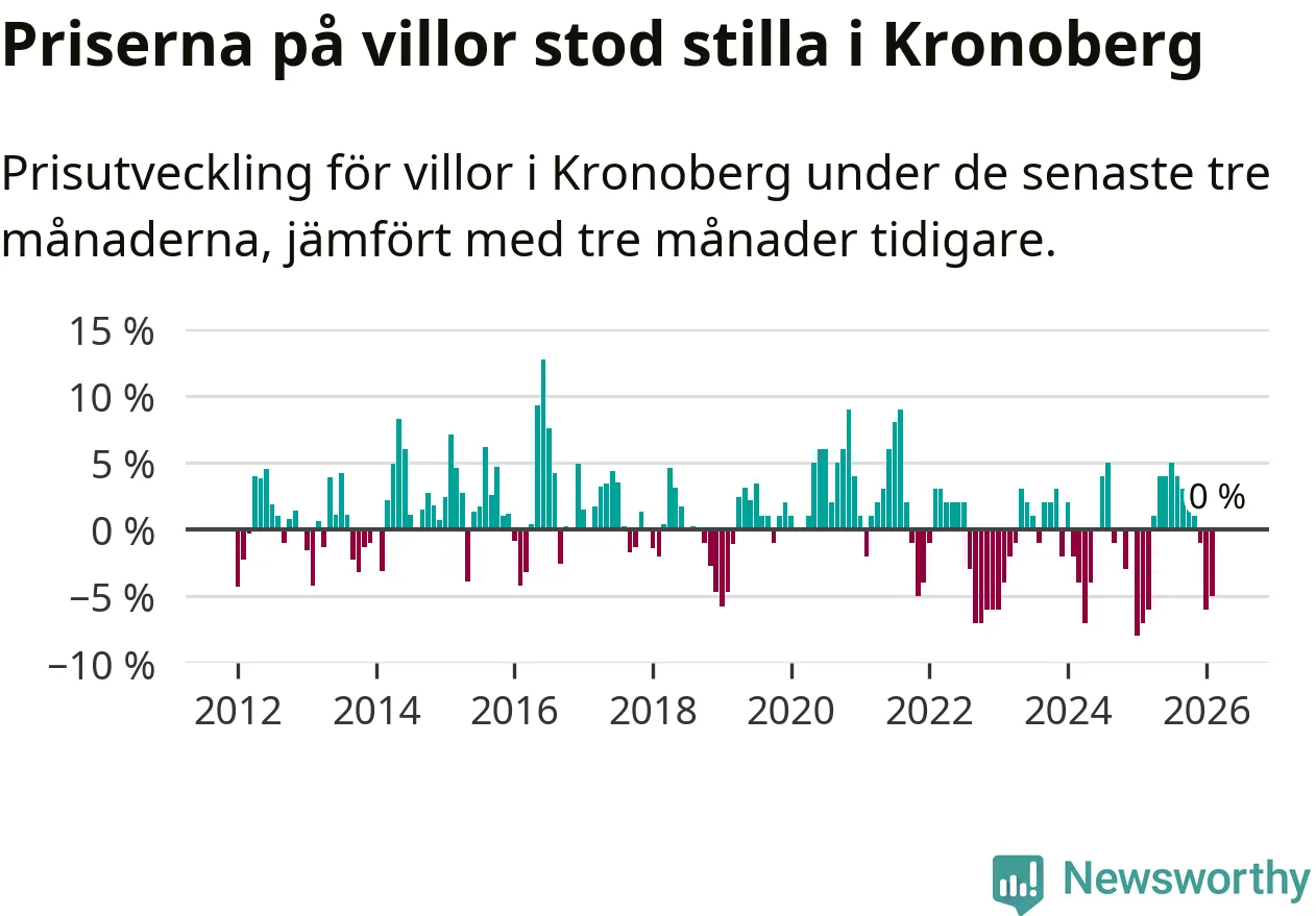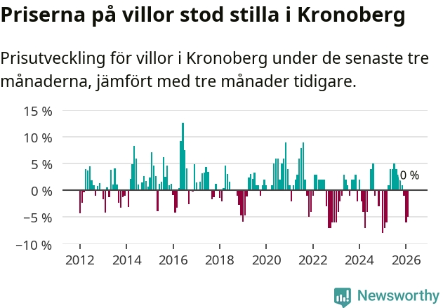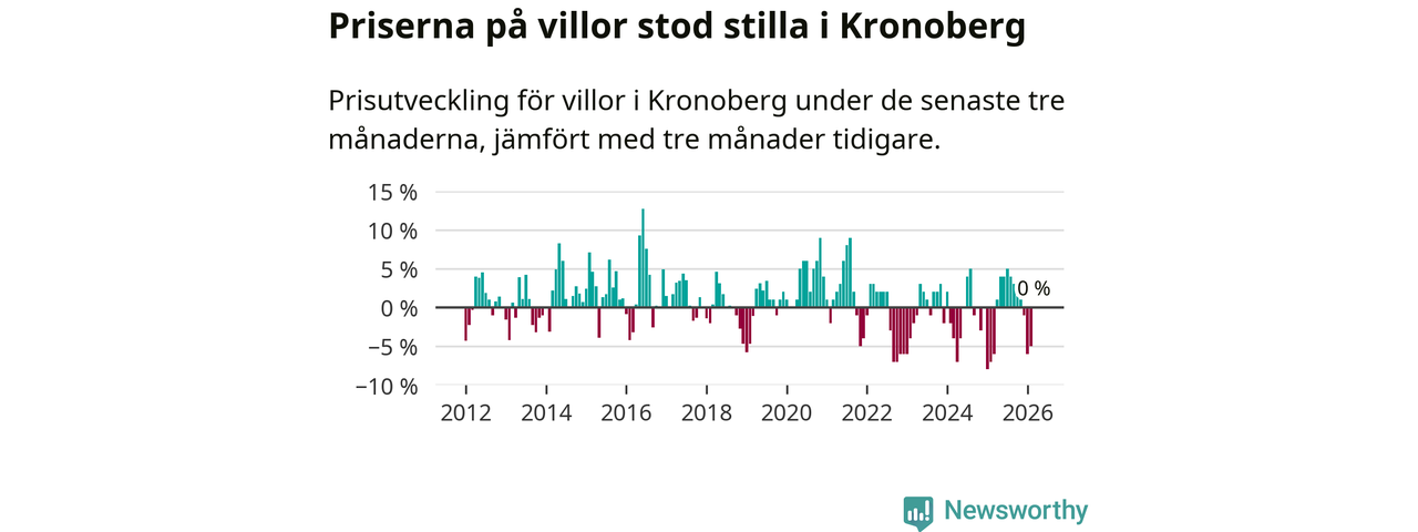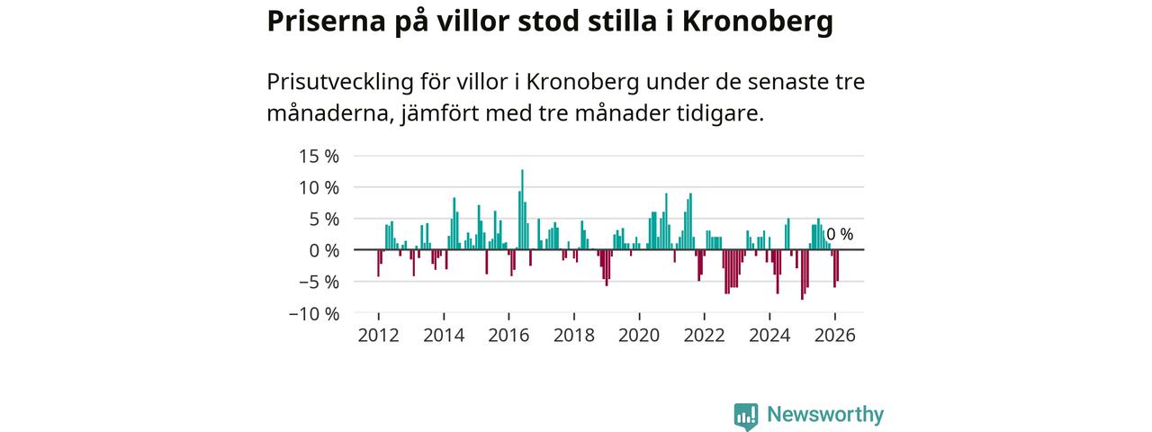 Villapriserna står i stort sett stilla i Kronobergs län. Medelpriset på de på försäljningarna under de senaste tre månaderna låg på samma nivå som för tre månader sedan.