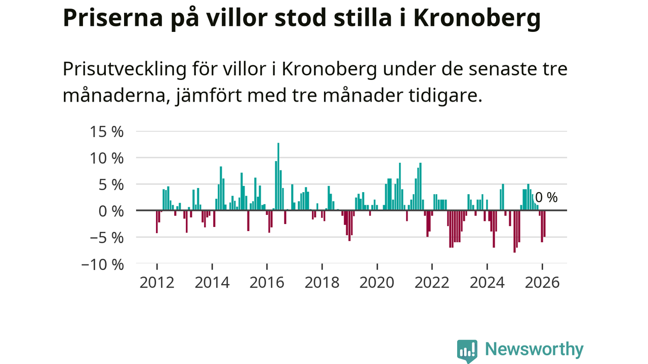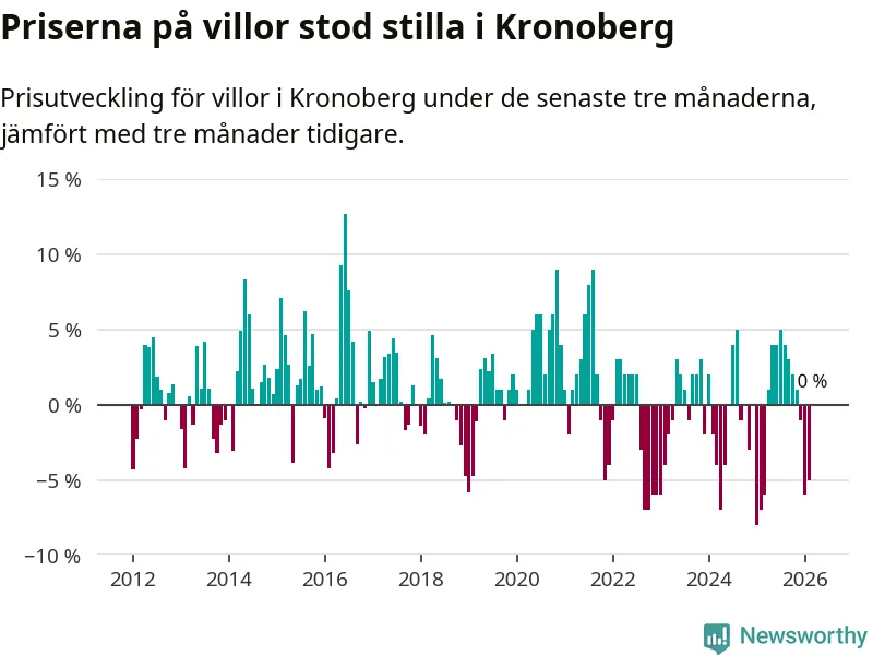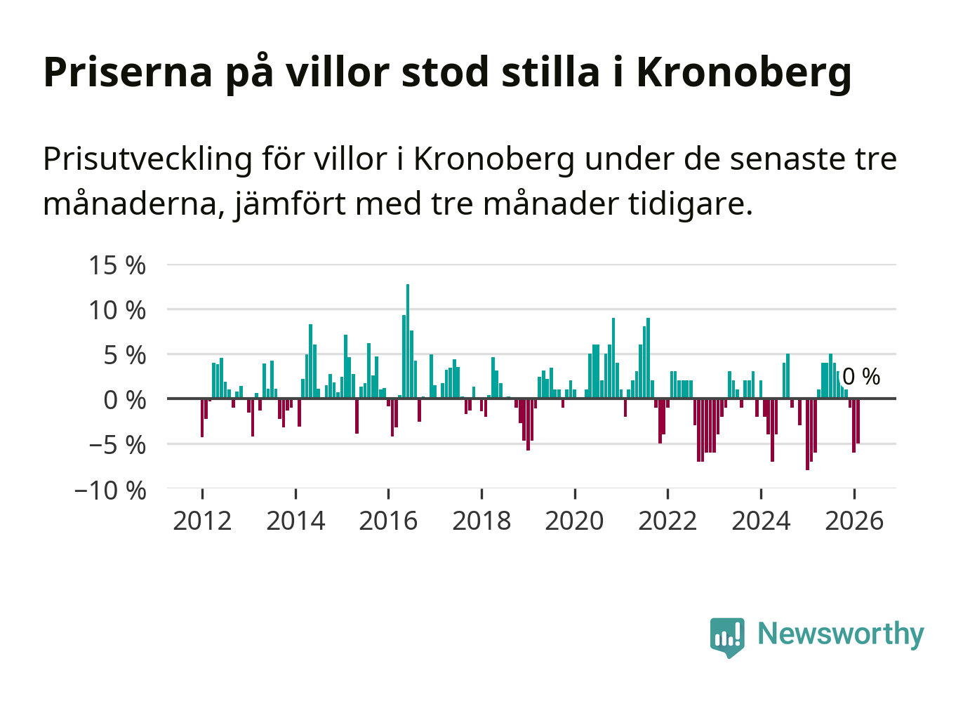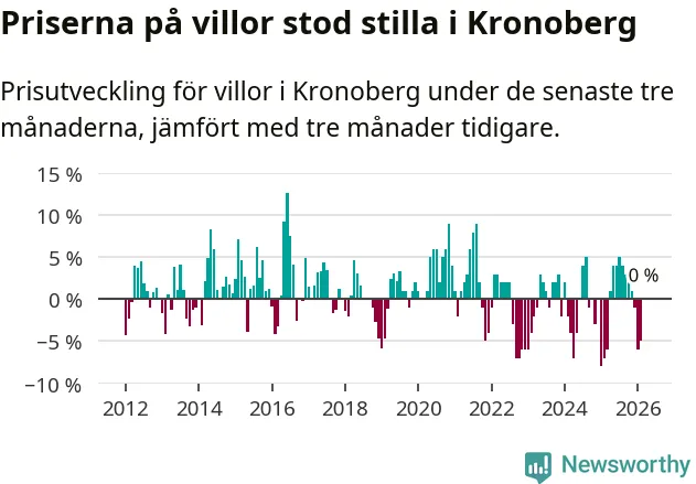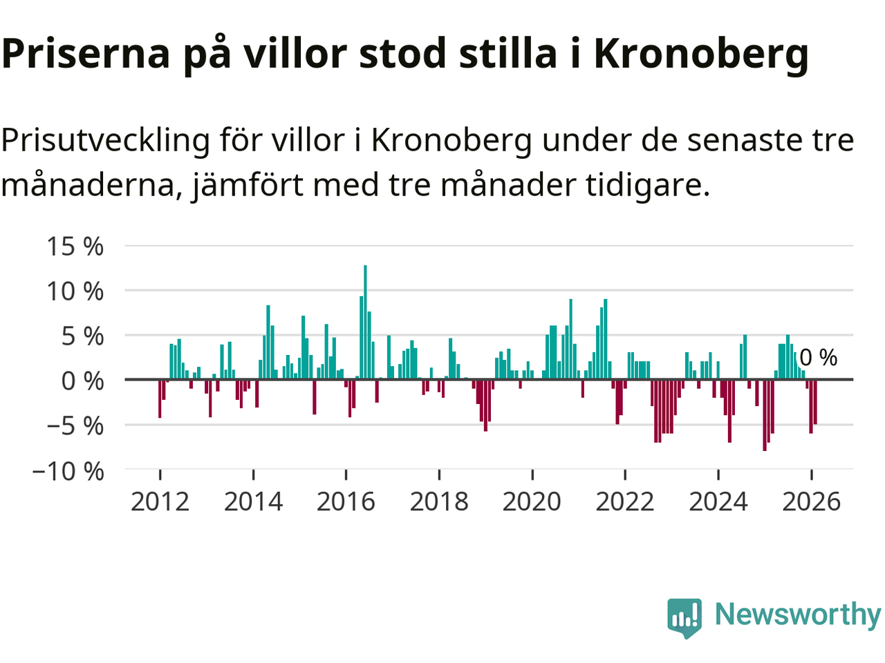 Villapriserna står i stort sett stilla i Kronobergs län. Medelpriset på de på försäljningarna under de senaste tre månaderna låg på samma nivå som för tre månader sedan.