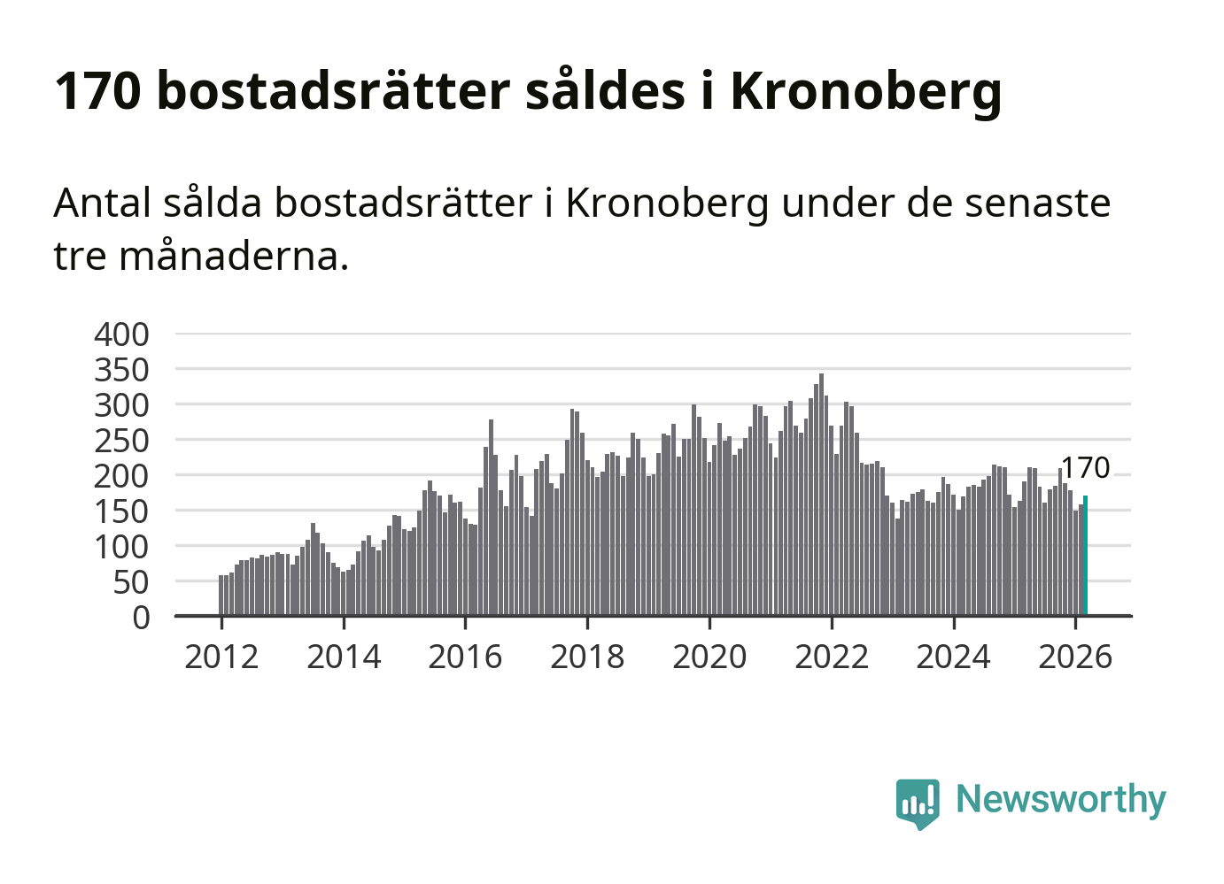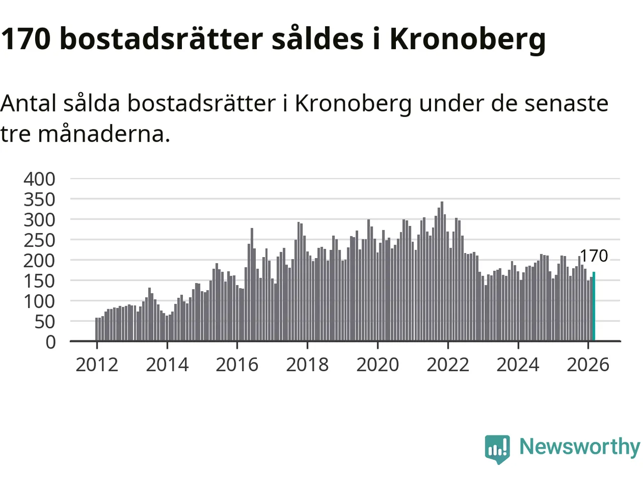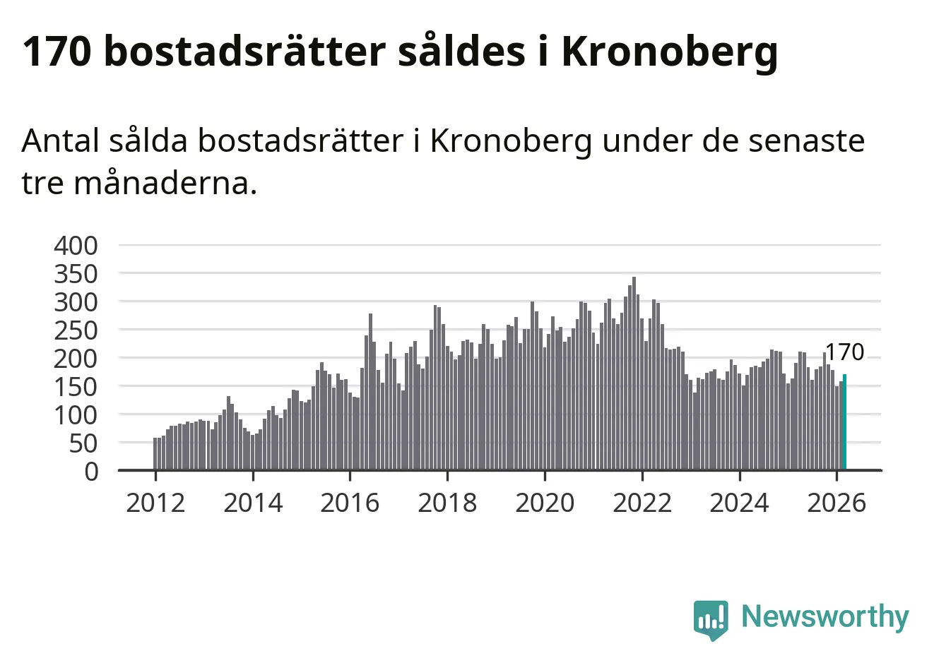 Sammanlagt såldes 170 bostadsrätter i Kronobergs län mellan januari och mars till ett genomsnittligt pris på 1,6 miljoner kronor. I fjol gjordes 190 affärer vid den här tiden på året.