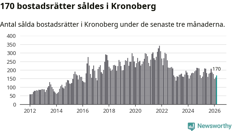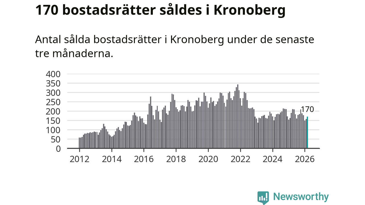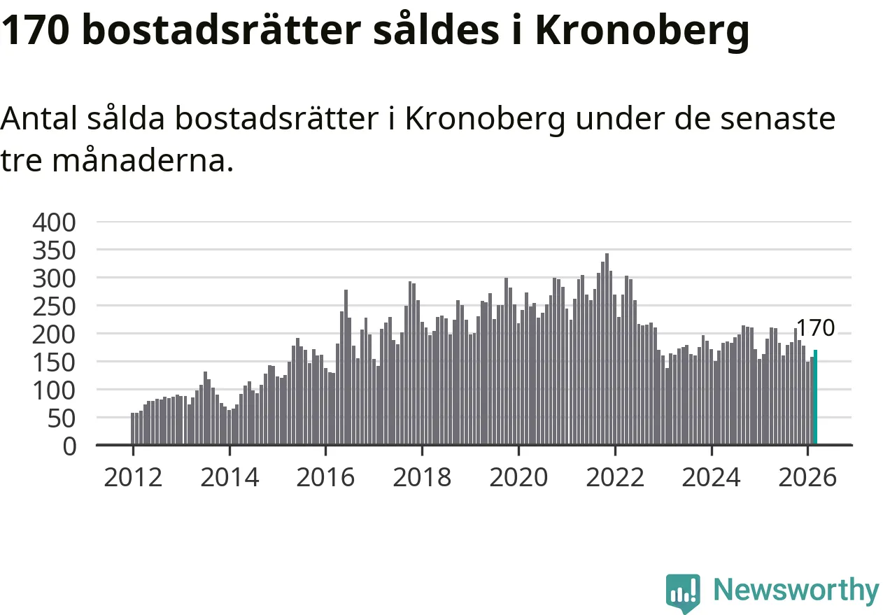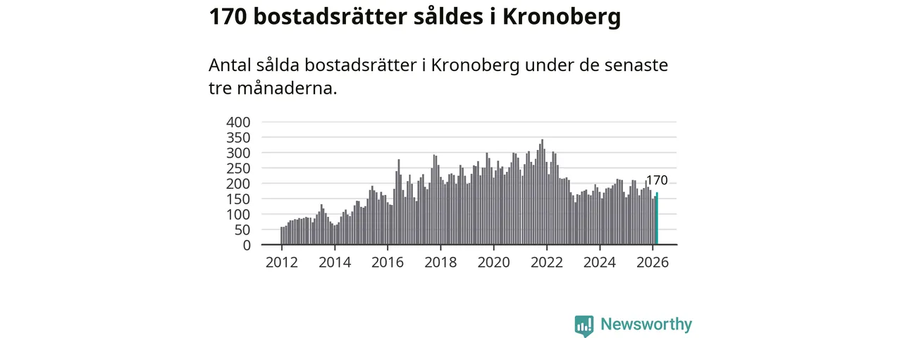 Sammanlagt såldes 170 bostadsrätter i Kronobergs län mellan januari och mars till ett genomsnittligt pris på 1,6 miljoner kronor. I fjol gjordes 190 affärer vid den här tiden på året.