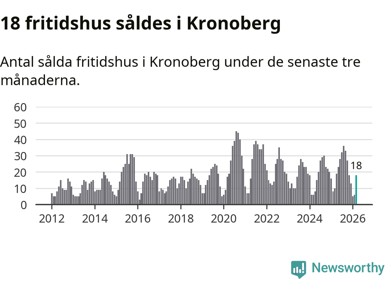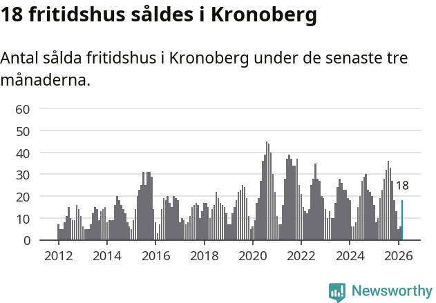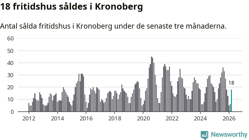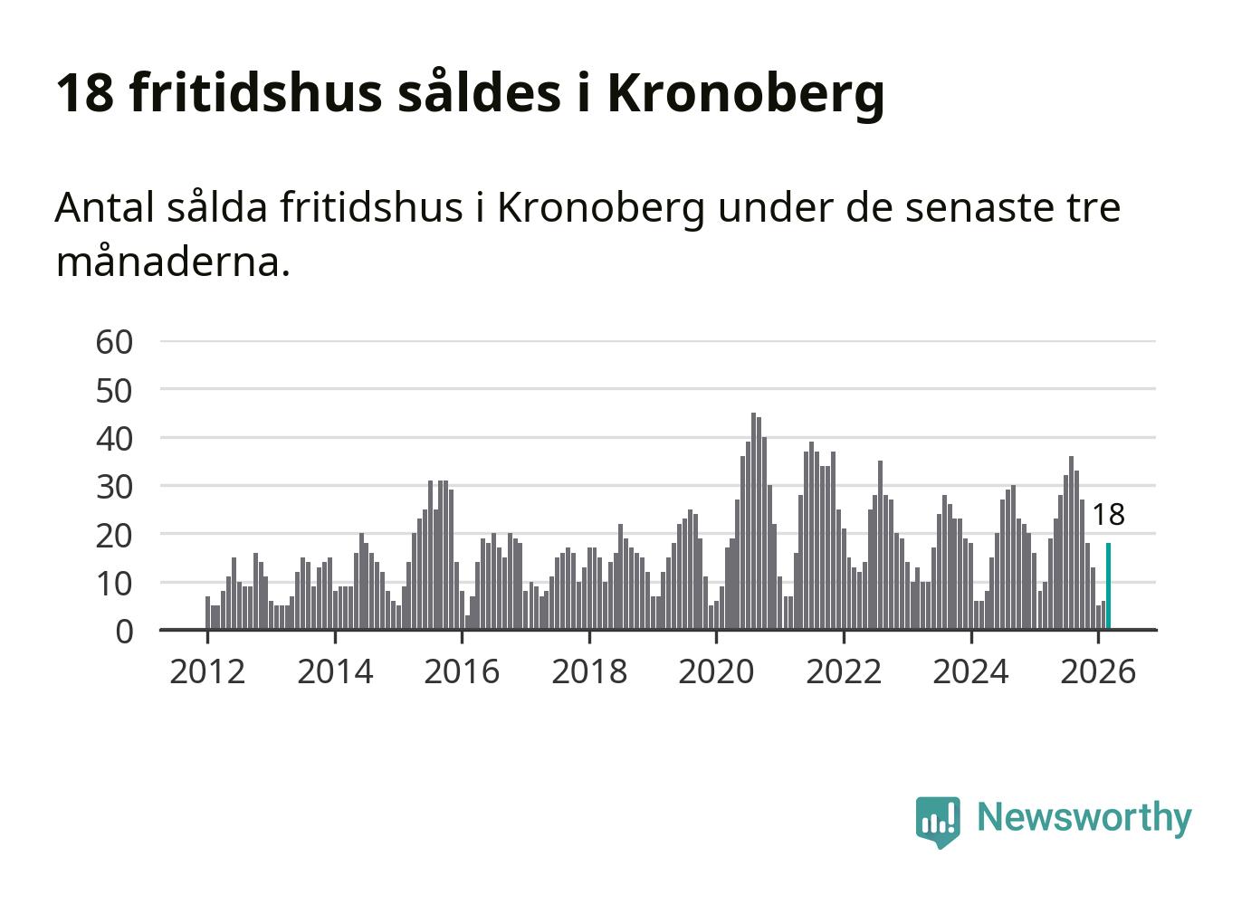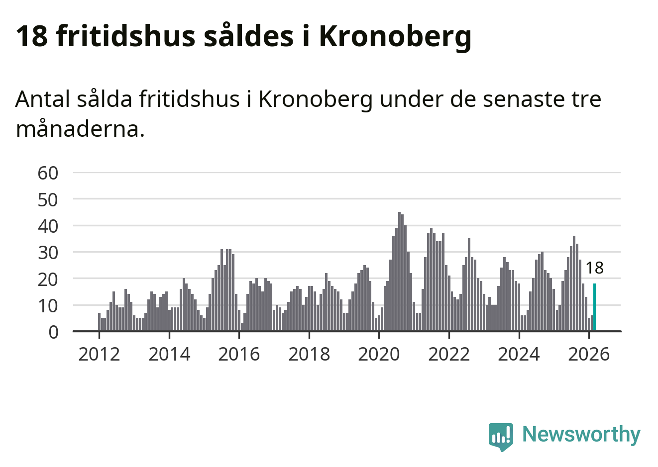 Sammanlagt såldes 18 fritidshus i Kronobergs län mellan januari och mars till ett genomsnittligt pris på 1,5 miljoner kronor. I fjol gjordes tio affärer vid den här tiden på året.