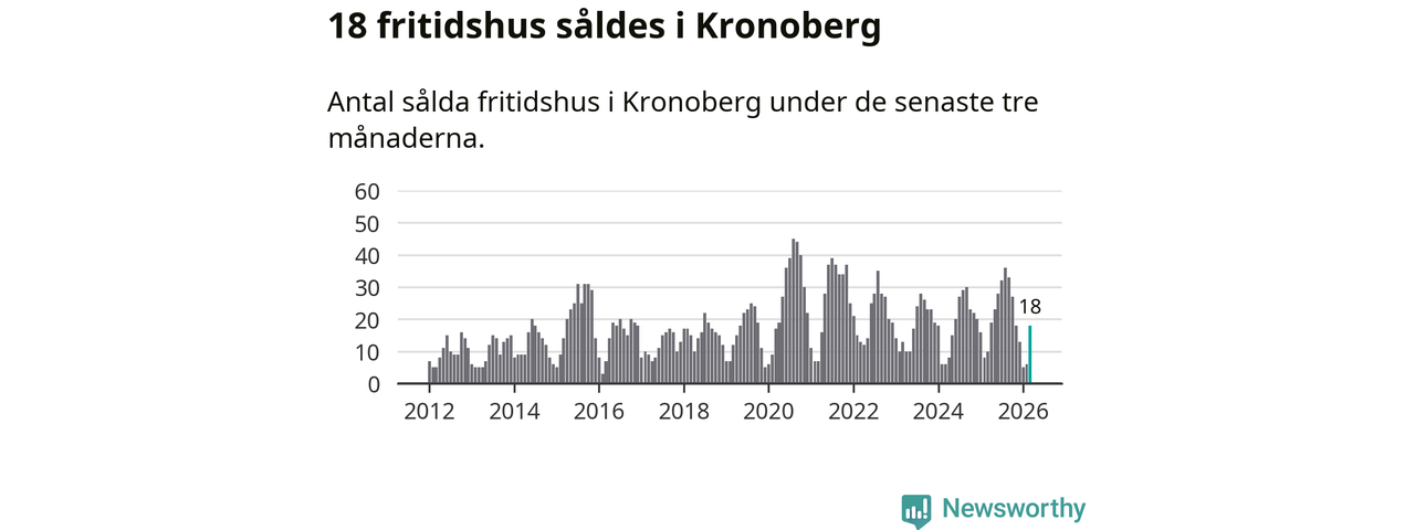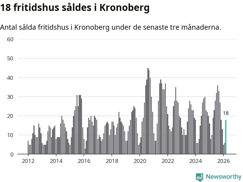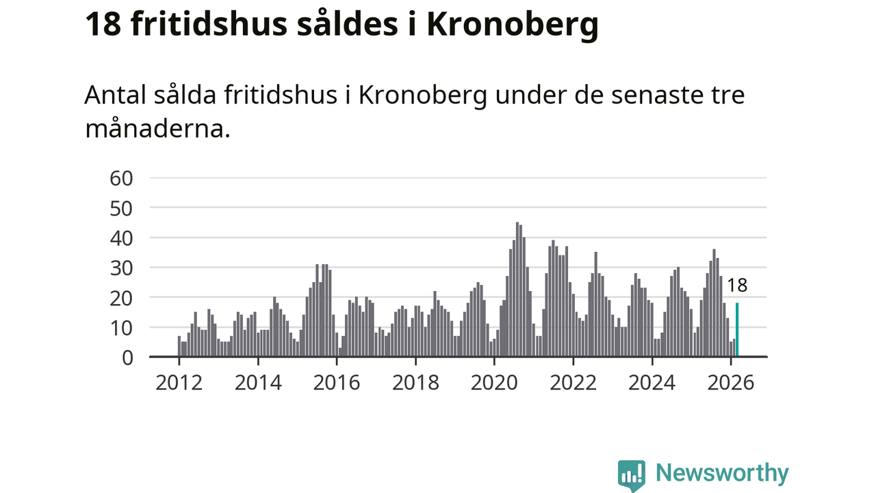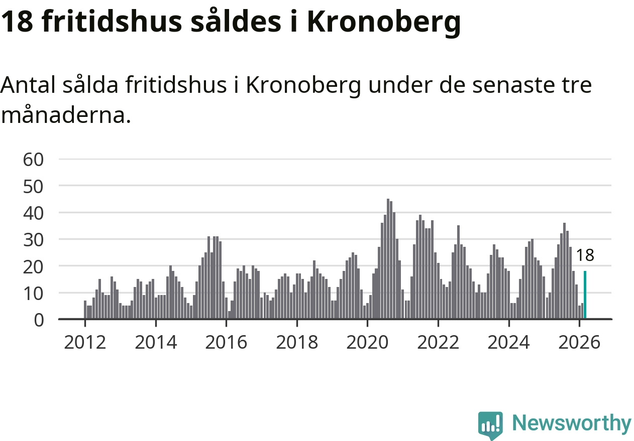 Sammanlagt såldes 18 fritidshus i Kronobergs län mellan januari och mars till ett genomsnittligt pris på 1,5 miljoner kronor. I fjol gjordes tio affärer vid den här tiden på året.