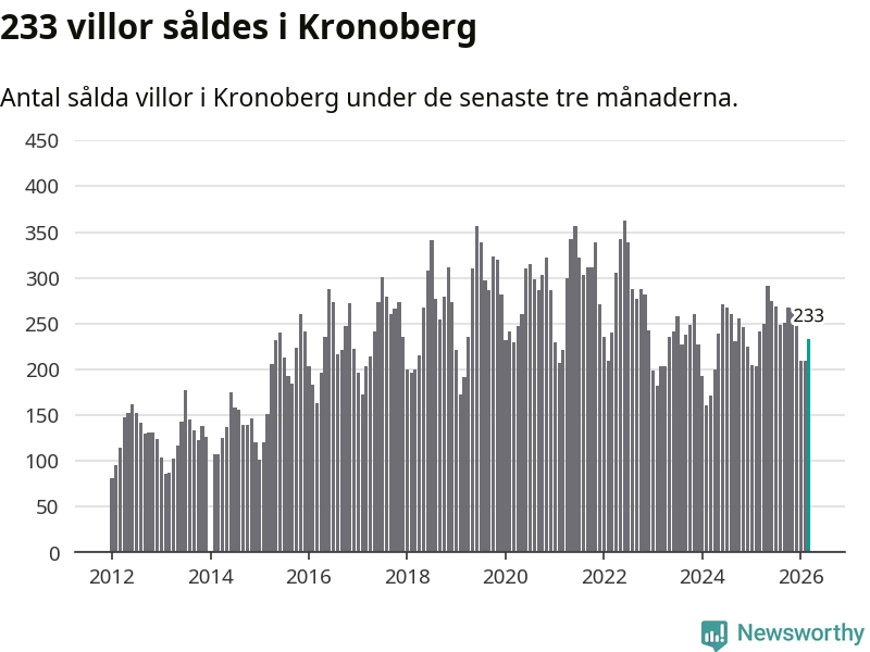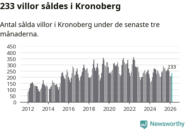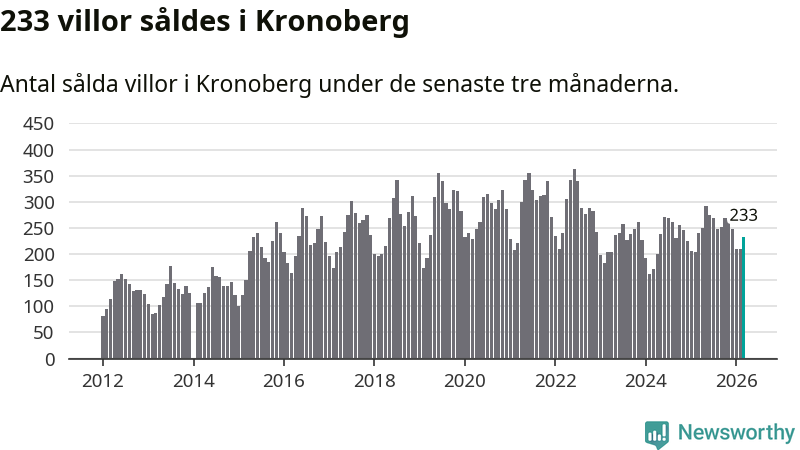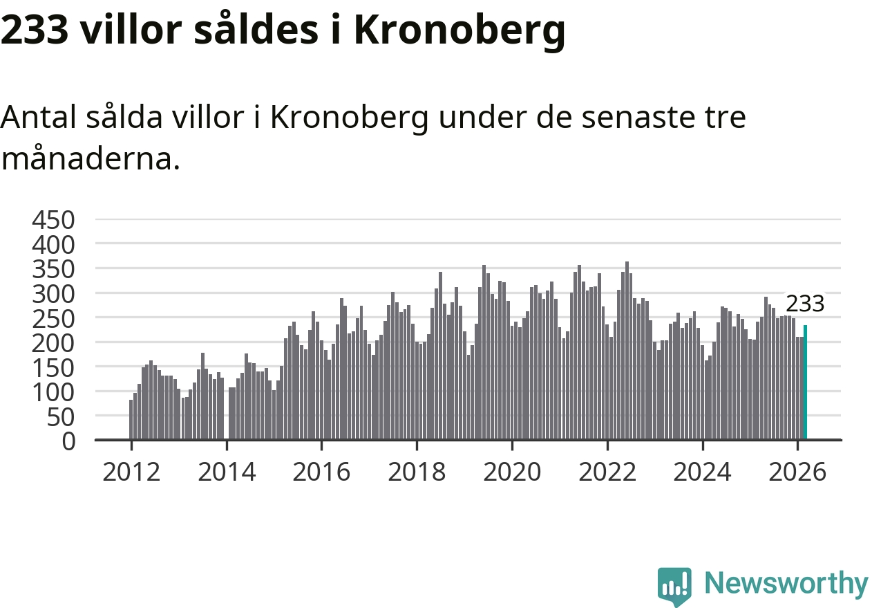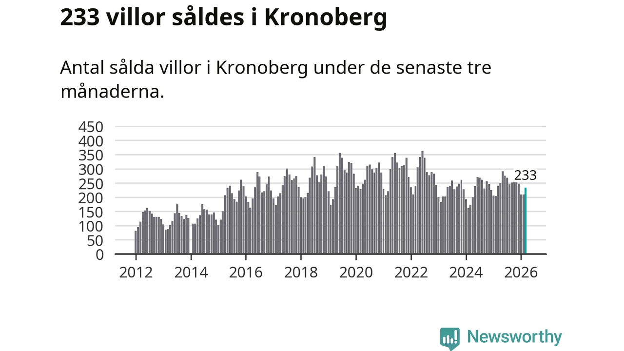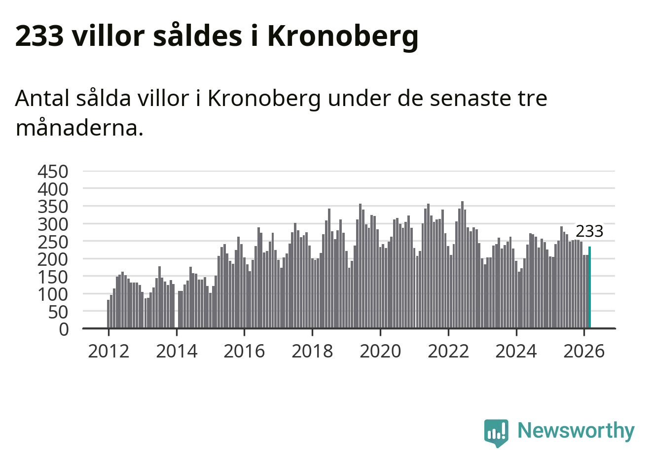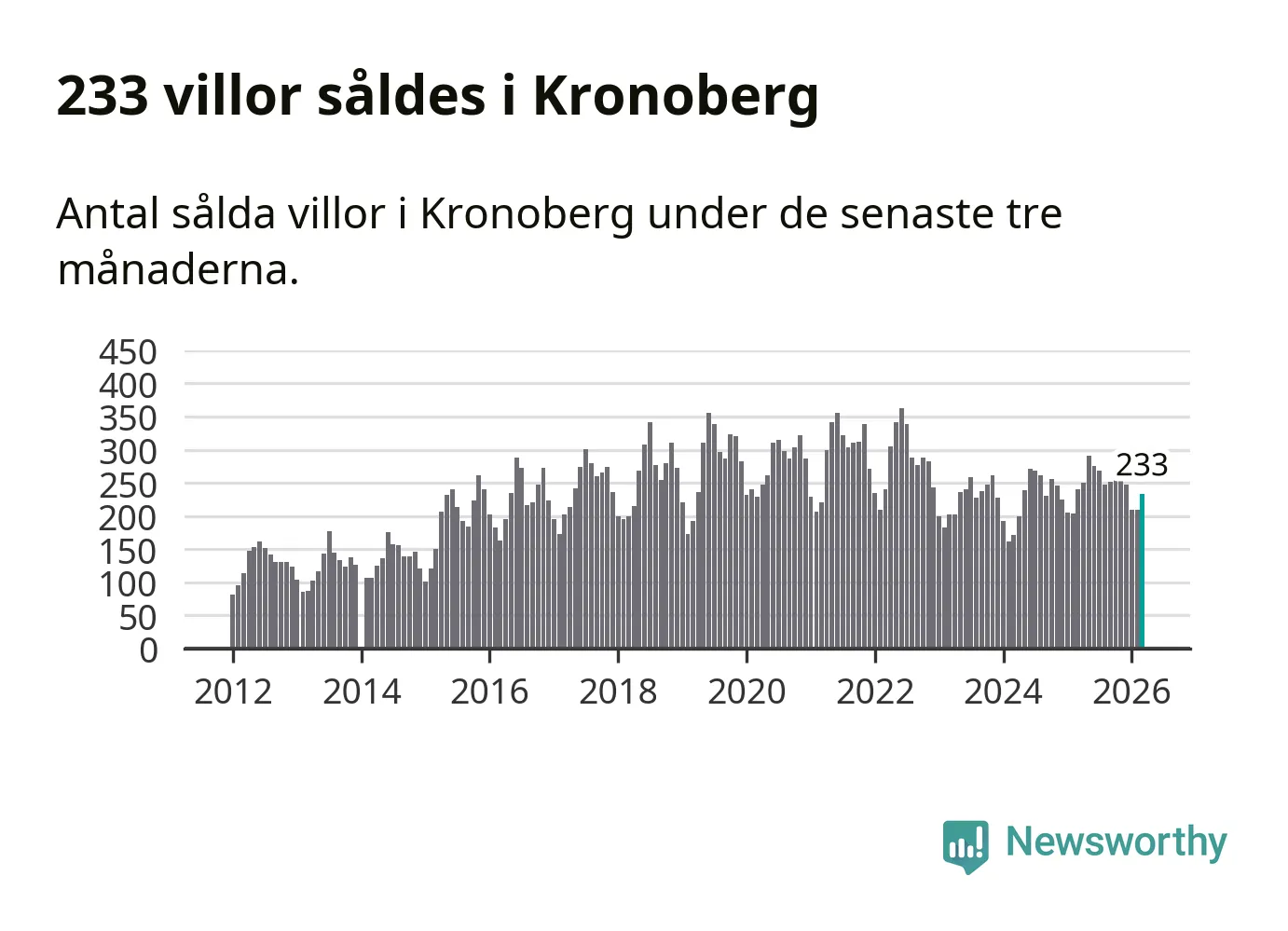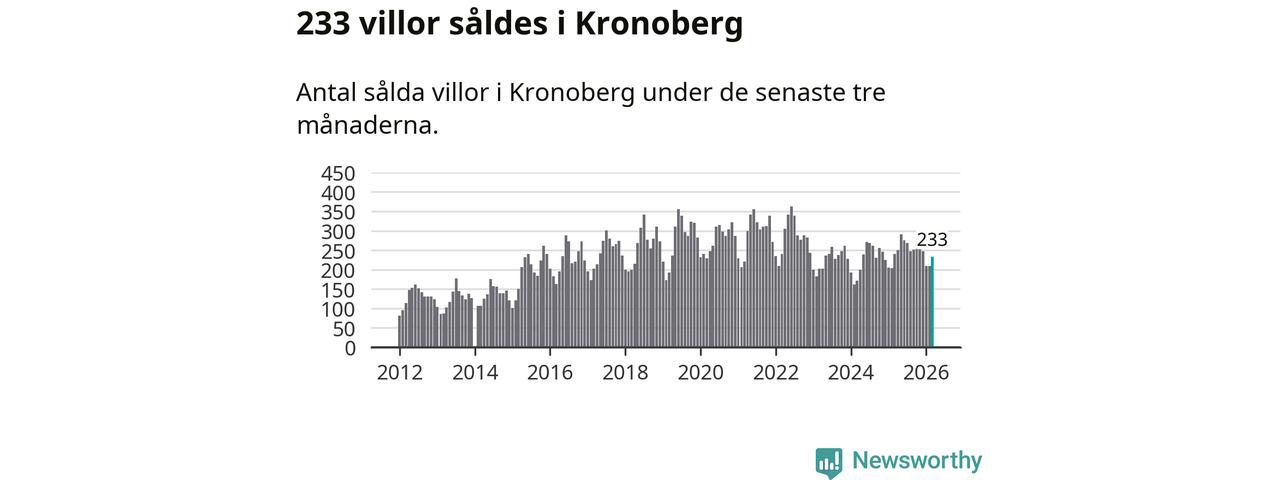 Sammanlagt såldes 233 villor i Kronobergs län mellan januari och mars till ett genomsnittligt pris på 2,4 miljoner kronor. I fjol gjordes 241 affärer vid den här tiden på året.