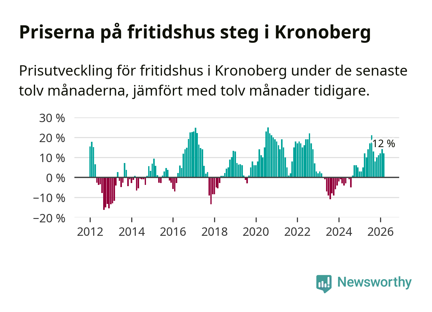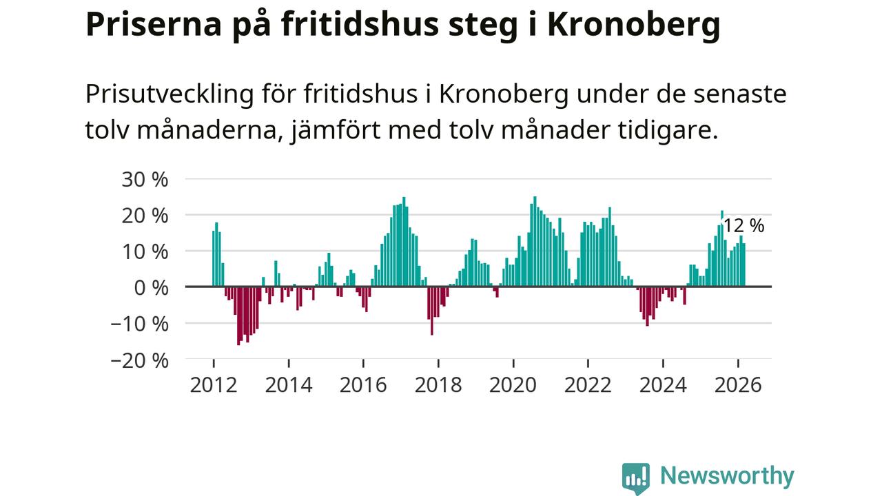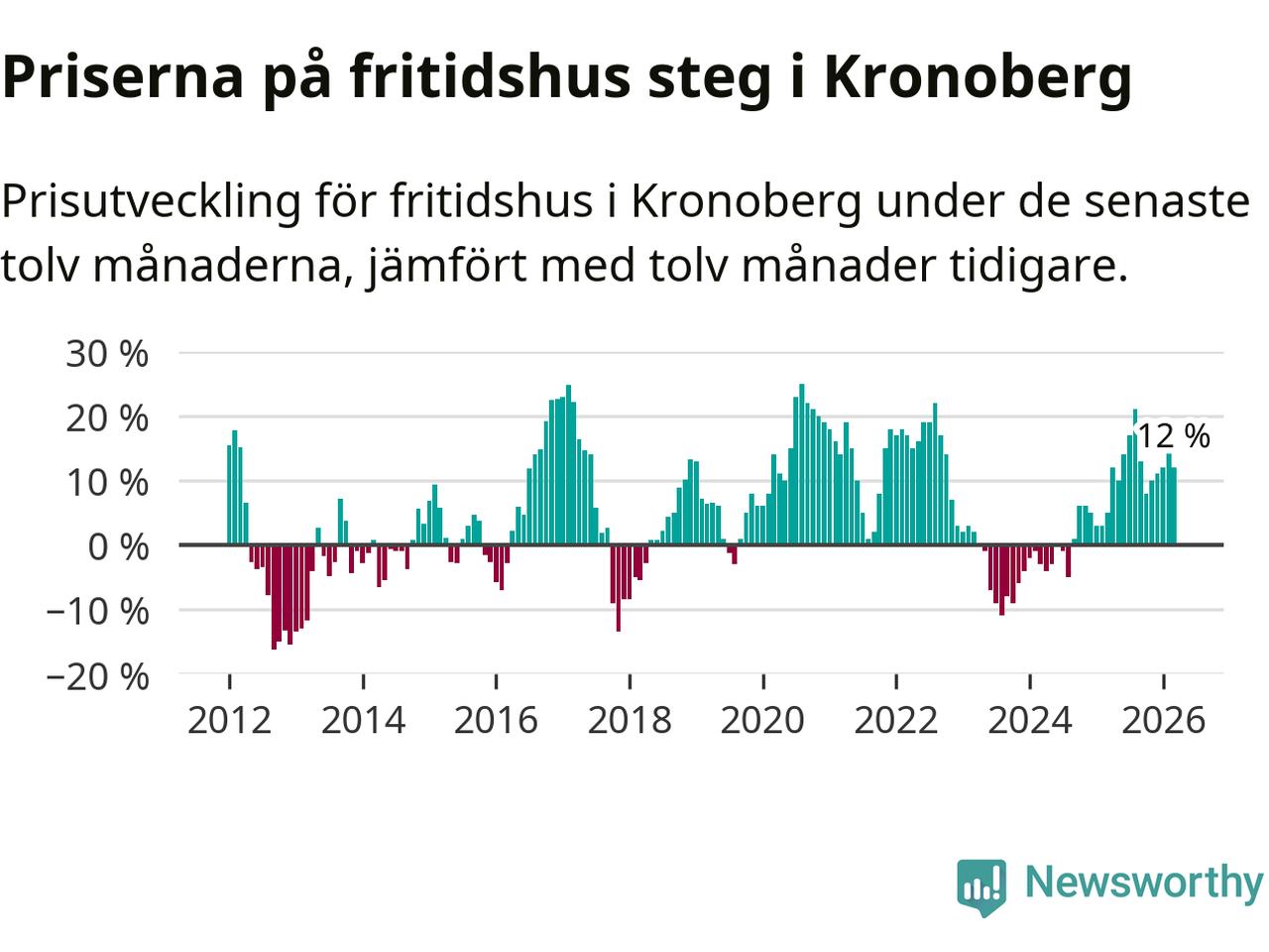 Priserna på fritidshus har gått upp i Kronobergs län. Medelpriset på försäljningarna under de senaste tolv månaderna visar på en uppgång med 12 procent.