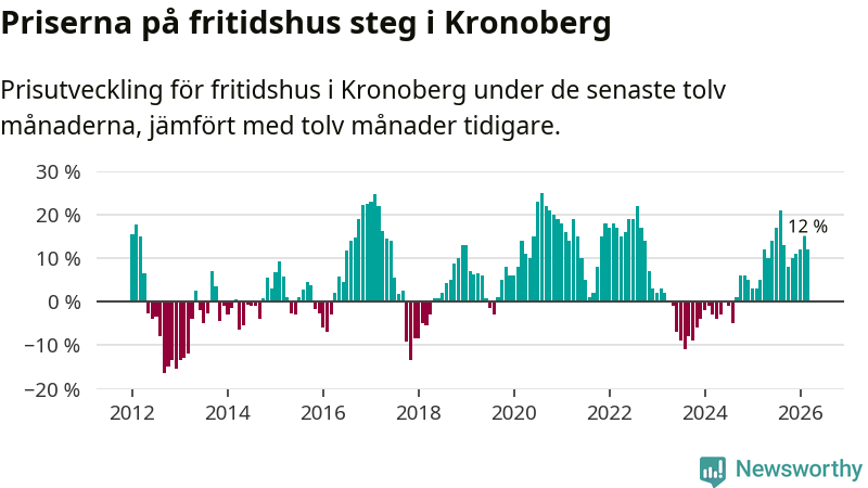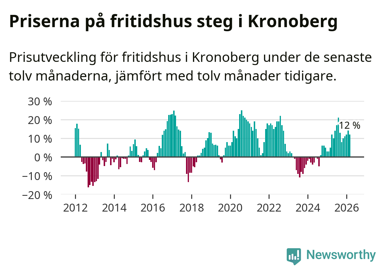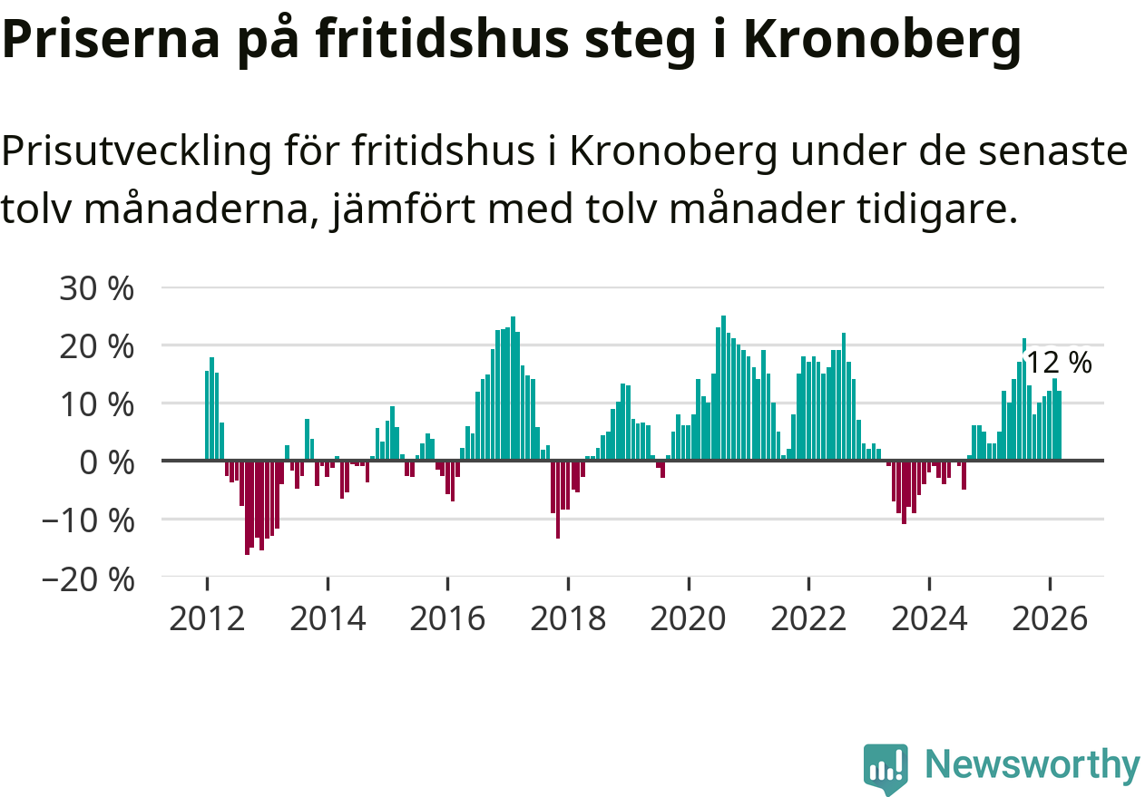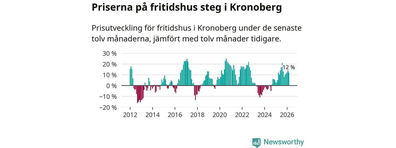 Priserna på fritidshus har gått upp i Kronobergs län. Medelpriset på försäljningarna under de senaste tolv månaderna visar på en uppgång med 12 procent.