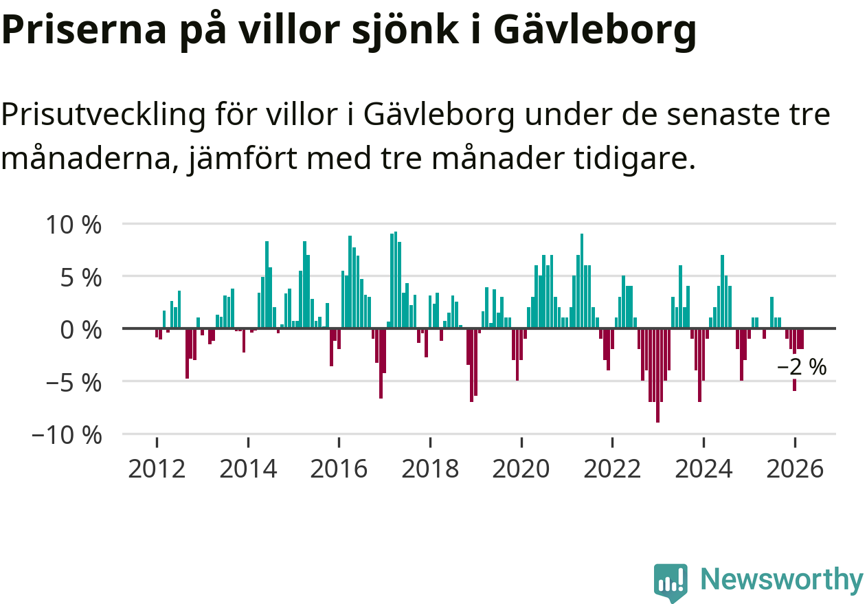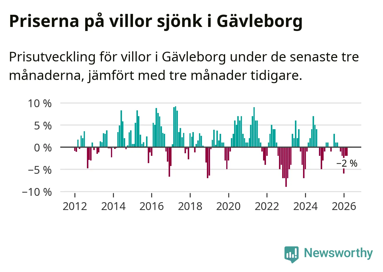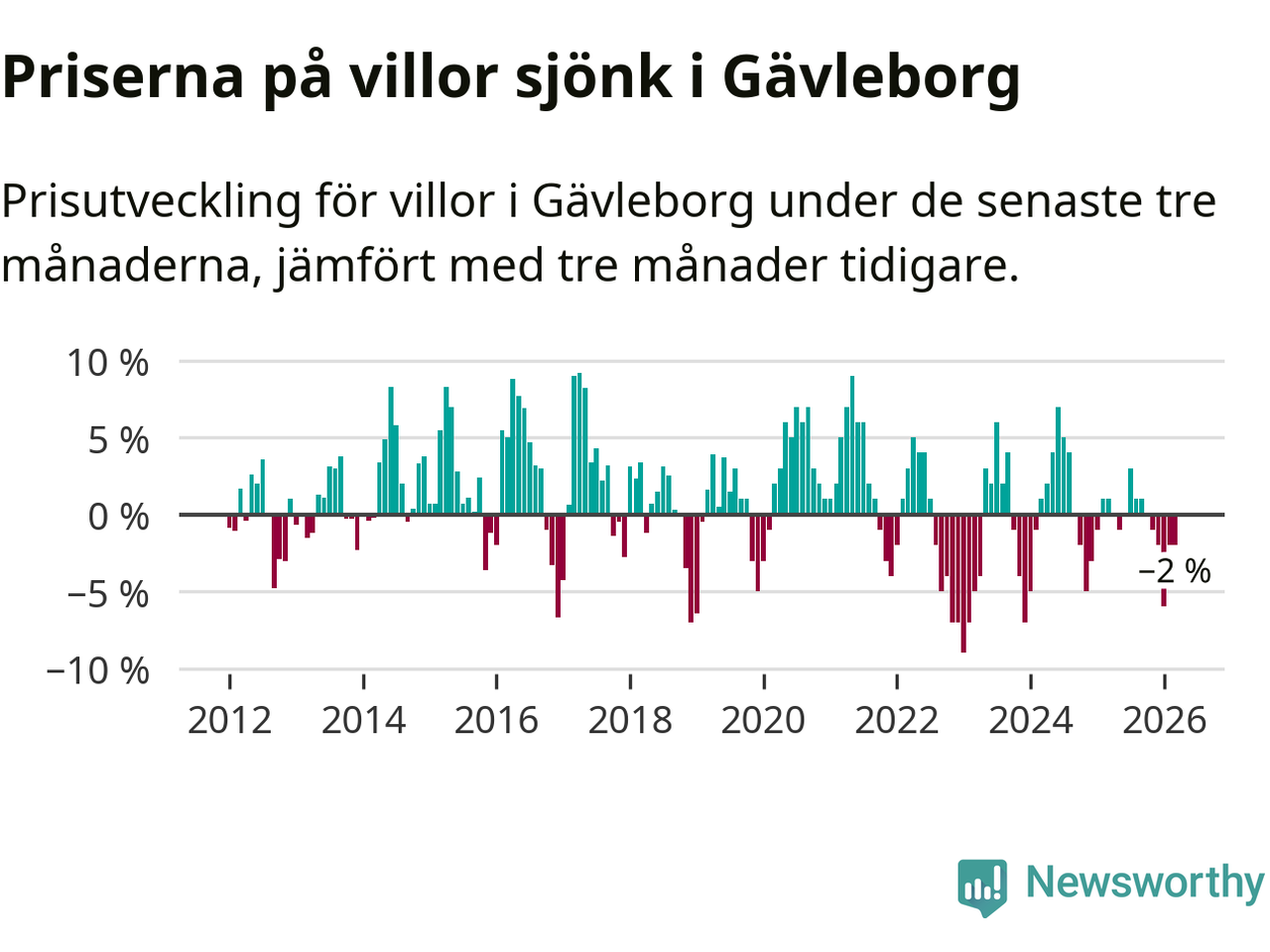 Villapriserna har gått ner i Gävleborgs län. Medelpriset på försäljningarna under de senaste tre månaderna visar på en nedgång med 2 procent.