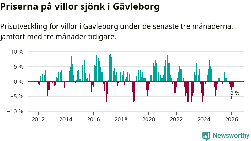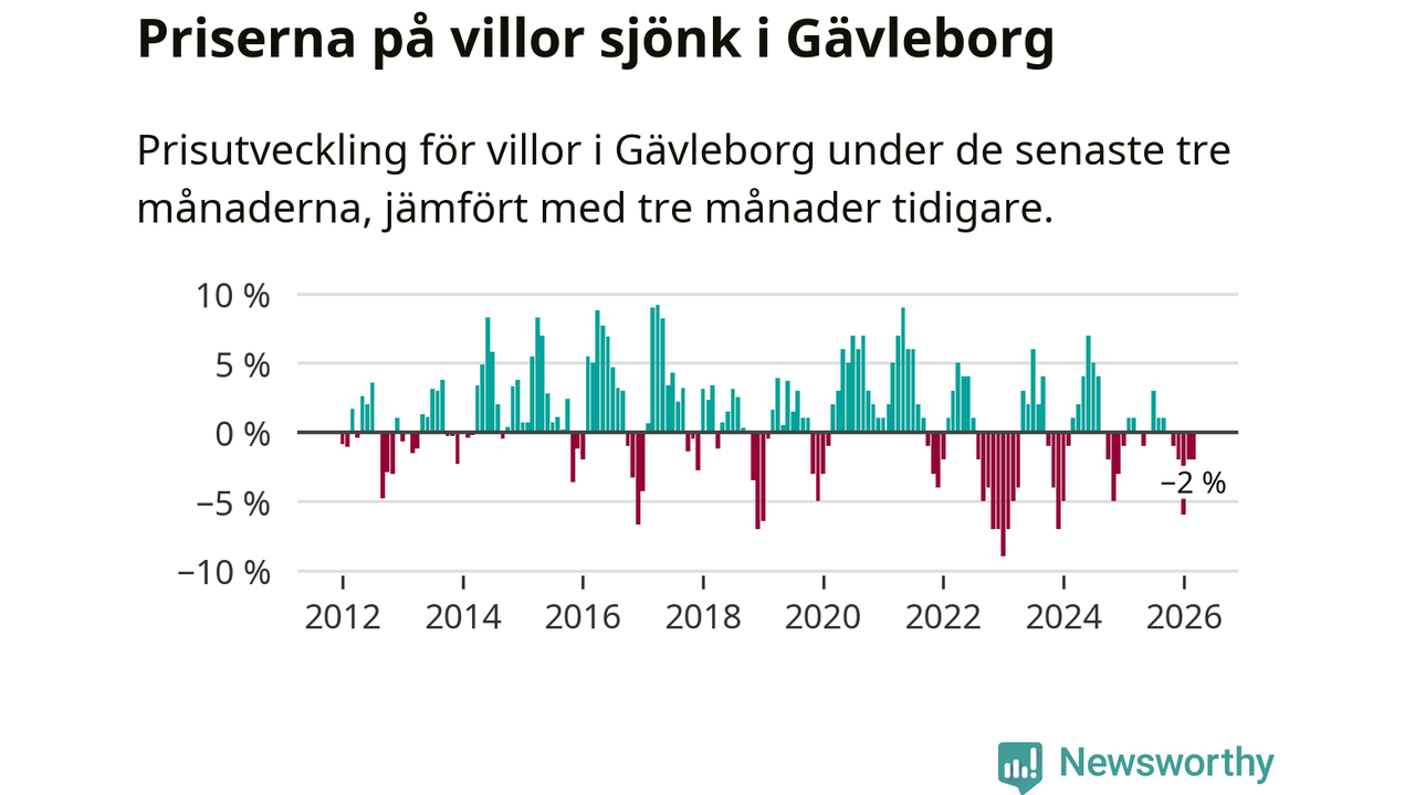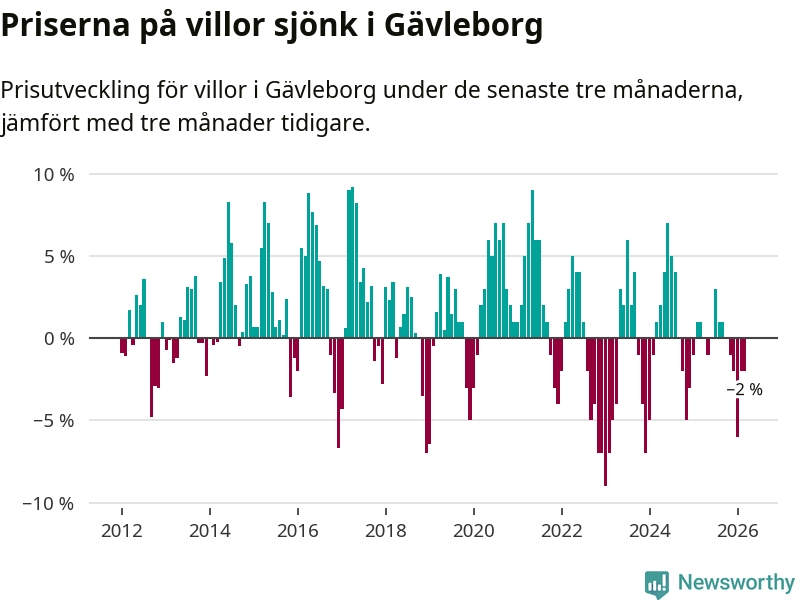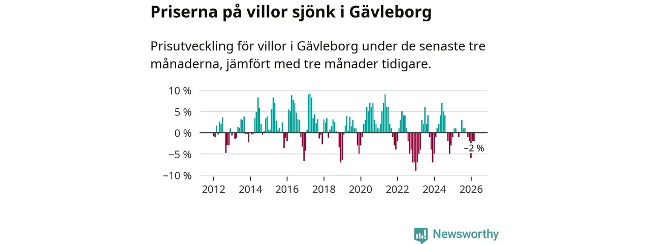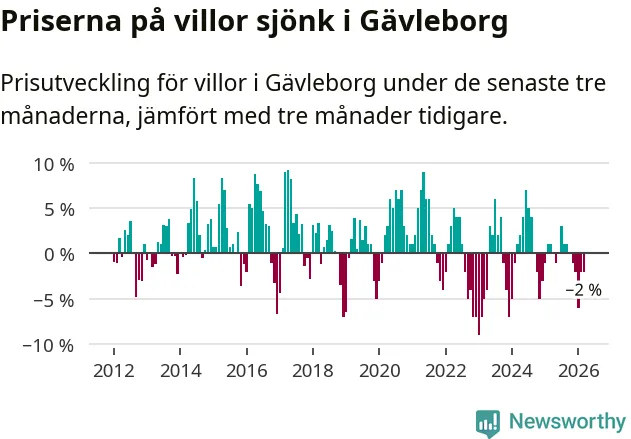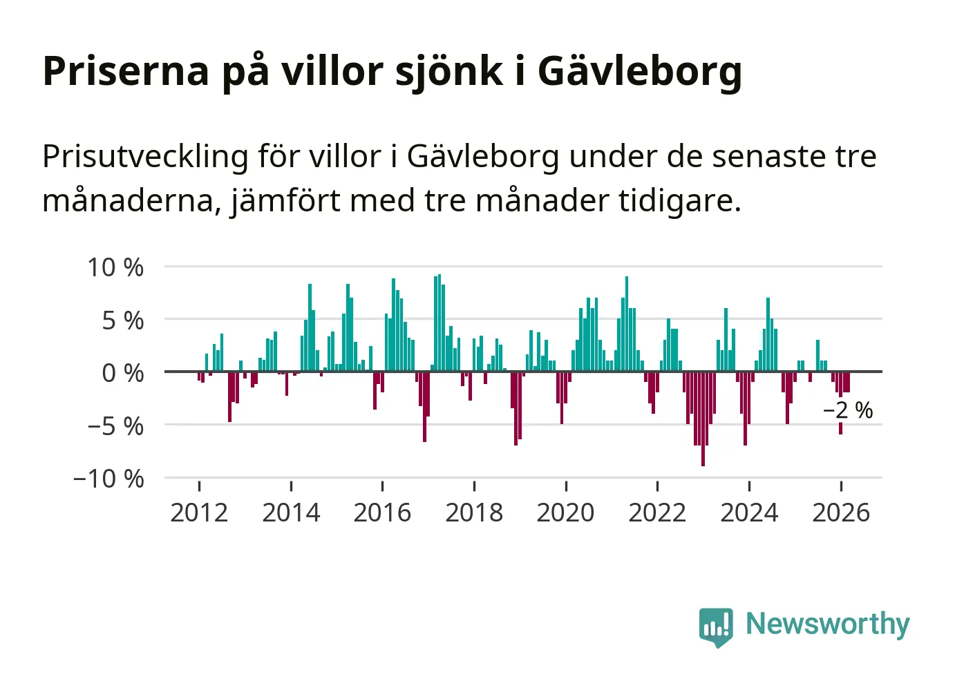 Villapriserna har gått ner i Gävleborgs län. Medelpriset på försäljningarna under de senaste tre månaderna visar på en nedgång med 2 procent.